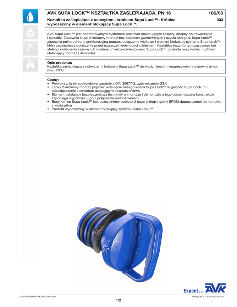 AVK SUPA LOCK™ KSZTAŁTKA ZAŚLEPIAJĄCA, PN 16 Kształtka zaślepiająca z uchwytem i króćcem Supa Lock™. Króciec wyposażony w element blokujący Supa Lock™. 106/00 003 AVK Supa Lock™ jest opatentowanym systemem połączeń obejmującym zasuwy, obejmy do nawiercania i kształtki. Zapewnia łatwy 2-krokowy montaż bez połączeń gwintowanych i użycia narzędzi. Supa Lock™ zapewnia pełną ochronę antykorozyjną poprzez połączenie wtykowe i element blokujący systemu Supa Lock™, który zabezpiecza połączenie przed rozszczelnieniem pod ciśnieniem. Kształtka służy do tymczasowego lub stałego zaślepienia zasuwy lub dystansu międzykołnierzowego Supa Lock™, posiada bosy koniec i uchwyt ułatwiający montaż i demontaż Opis produktu: Kształtka zaślepiająca z uchwytem i króćcem Supa Lock™ do wody i innych nieagresywnych płynów o temp. max. 70°C Cechy: • Powłoka z farby epoksydowej zgodnie z DIN 30677-2, zatwierdzenie GSK • Łatwy 2-krokowy montaż poprzez wciśnięcie bosego końca Supa Lock™ w gniazdo Supa Lock ™ i zabezpieczenie elementem ustalającym bezpieczeństwa • Element ustalający bezpieczeństwa jest łatwy w montażu i demontażu a jego opatentowana konstrukcja zapobiega wypchnięciu go z połączenia pod ciśnieniem. • Bosy koniec Supa Lock™ jest uszczelniony poprzez 2 duże o-ringi z gumy EPDM dopuszczonej do kontaktu z wodą pitną • Produkt wyposażony w element blokujący systemu Supa Lock™. COPYRIGHT©AVK GROUP 2016 Wersja nr 2 - 2016-06-23 14:17 1/2 AVK SUPA LOCK™ KSZTAŁTKA ZAŚLEPIAJĄCA, PN 16 106/00 Kształtka zaślepiająca z uchwytem i króćcem Supa Lock™. Króciec wyposażony w element blokujący Supa Lock™. 1 003 3 2 DN H3 L Wykaz elementów budowy: 1. O-ring Guma EPDM 2. 3. Korpus Żeliwo sferoidalne, GJS-500 (GGG-50) Element blokujący POM Komponenty mogą być zastąpione materiałami takiej samej bądź wyższej klasy, bez wcześniejszego powiadomienia. Nr katalogowy i wymiary: Nr katalogowy DN mm L mm H3 mm Waga kg 106-000-00-32464 32 85 100 0.8 Konstrukcja, materiały oraz warunki wykonania mogą ulec zmianie bez powiadomienia z powodu ciągłego rozwoju naszych produktów. Wersja nr 2 - 2016-06-23 14:17 2/2