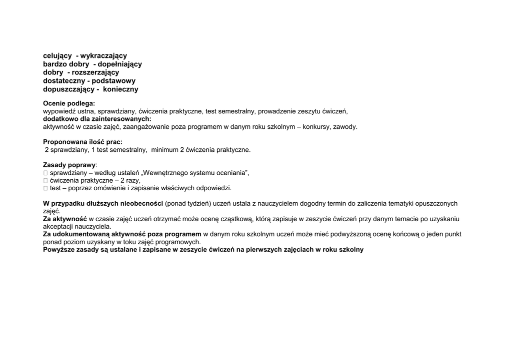 Ocena Zakres wiadomości celujący - wykraczający bardzo dobry - dopełniający dobry - rozszerzający dostateczny - podstawowy dopuszczający - konieczny Ocenie podlega: wypowiedź ustna, sprawdziany, ćwiczenia praktyczne, test semestralny, prowadzenie zeszytu ćwiczeń, dodatkowo dla zainteresowanych: aktywność w czasie zajęć, zaangażowanie poza programem w danym roku szkolnym – konkursy, zawody. Proponowana ilość prac: 2 sprawdziany, 1 test semestralny, minimum 2 ćwiczenia praktyczne. Zasady poprawy: sprawdziany – według ustaleń „Wewnętrznego systemu oceniania”, ćwiczenia praktyczne – 2 razy, test – poprzez omówienie i zapisanie właściwych odpowiedzi. W przypadku dłuższych nieobecności (ponad tydzień) uczeń ustala z nauczycielem dogodny termin do zaliczenia tematyki opuszczonych zajęć. Za aktywność w czasie zajęć uczeń otrzymać może ocenę cząstkową, którą zapisuje w zeszycie ćwiczeń przy danym temacie po uzyskaniu akceptacji nauczyciela. Za udokumentowaną aktywność poza programem w danym roku szkolnym uczeń może mieć podwyższoną ocenę końcową o jeden punkt ponad poziom uzyskany w toku zajęć programowych. Powyższe zasady są ustalane i zapisane w zeszycie ćwiczeń na pierwszych zajęciach w roku szkolny Wymagania edukacyjne według przyjętych zasad oceniania Lp. Nr i nazwa tematu Ocena dopuszczająca uczeń potrafi: Ocena dostateczna uczeń potrafi Ocena dobra uczeń potrafi: Ocena bardzo dobra uczeń potrafi: Ocena celująca uczeń potrafi: 1. 2. Pierwsza pomoc w przypadku zagrożenia życia lub zdrowia człowieka wymienić podstawowe funkcje życiowe – wskazać kolejne czynności łańcucha ratowniczego wymienić zasady, według których należy postępować w przypadku zaburzeń podstawowych funkcji życiowych – opisać objawy urazów wyjaśnić, na czym polega organizacja miejsca wypadku wykonać bezbłędnie, w odpowiedniej kolejności czynności ratownicze w przypadku stanów zagrożenia życia i zdrowia 2. 4. Wstrząs pourazowy – udzielić pierwszej pomocy wskazać przyczyny i objawy wstrząsów pourazowych wymienić i opisać rodzaje wstrząsów pourazowych – opisać znaczenie, jakie dla osoby poszkodowanej ma wsparcie psychiczne – zastosować w praktyce sposoby sprawdzania stanu świadomości poszkodowanego określić objawy sygnalizujące pogłębianie się wstrząsu – scharakteryzować okres pobudzenia 3. 5. Sposoby ewakuacji poszkodowanych zastosować techniki podnoszenia i transportowania poszkodowanych w różnych sytuacjach – omówić różne sposoby odciągania i ewakuacji poszkodowanych 4 6. Pierwsza pomoc w przypadku nagłych zasłabnięć, omdleń i utonięć – przedstawić treść wezwania pogotowia lub lekarza – zastosować pozycję bezpieczną omówić zasady pierwszej pomocy w przypadku omdleń, zasłabnięć i utonięć objaśnić, jak ograniczyć obciążenie własnego kręgosłupa w przypadku podnoszenia poszkodowanych – opisać, jak bezpiecznie układać poszkodowanego na noszach wymienić przyczyny zasłabnięć – pokazać i opisać pozycje, jakie należy zastosować w przypadku różnych urazów w przypadku wstrząsu pourazowego – sporządzić prowizoryczne nosze za pomocą różnych metod opisać, jak zapobiegać zasłabnięciom i omdleniom – wykonać bezbłędnie, w odpowiedniej kolejności czynności ratownicze w przypadku nagłego zasłabnięcia, omdlenia i tonięcia omówić samodzielnie wybrane pozycje książkowe dotyczące problemu wstrząsów pourazowych – wymienić miejsca, w których można uzyskać fachowe informacje na temat wstrząsów pourazowych kierować grupą z zastosowaniem różnych technik omówić samodzielnie wybrane pozycje książkowe dotyczące problemów zasłabnięć – wymienić miejsca, w których można uzyskać fachowe informacje na temat nagłych zasłabnięć , omdleń i pierwszej pomocy tonącemu Lp. Nr i nazwa tematu Ocena dopuszczająca uczeń potrafi: Ocena dostateczna uczeń potrafi Ocena dobra uczeń potrafi: Ocena bardzo dobra uczeń potrafi: Ocena celująca uczeń potrafi: 5. 9. Urazy spowodowane Prądem elektrycznym udzielić pierwszej pomocy w przypadku porażenia prądem elektrycznym w różnych sytuacjach (dom, warsztat, pracownia, teren niezabudowany) omówić urazy spowodowane przez prąd elektryczny – wymienić czynniki wpływające na urazy spowodowane prądem elektrycznym – opisać charakterystyczne cechy oparzeń prądem elektrycznym – opisać, w jakich przypadkach może powstać porażenie prądem stałym – opisać, jak zmniejszyć możliwość urazu w wyniku wyładowań atmosferycznych – wskazać w swoim 6. 10. Oparzenia chemiczne – udzielić pierwszej pomocy w przypadku oparzeń chemicznych wskazać rodzaje zagrożeń, jakie występują przy udzielaniu pierwszej pomocy – opisać poparzenia wymagające szczególnej troski 7. 12. Złamania kości i uszkodzenia stawów udzielić pierwszej pomocy w przypadku złamania, zwichnięcia, skręcenia opisać zastosowanie podręcznych środków do unieruchomienia kończyn dolnych i górnych – wskazać warunki i miejsca sprzyjające urazom – wymienić objawy różnych złamań 8. 14. Panika i sposoby jej zapobiegania – określić, jak należy postępować w przypadku paniki, aby ograniczyć zagrożenie życia – scharakteryzować zjawisko paniki – określić, w jaki sposób wyzwala się panika u poszczególnych osób 9. 16. Zagrożenia życia i zdrowia podczas powodzi opisać zagrożenia związane z powodzią – wymienić czynności podczas ewakuacji powodziowej – wymienić czynniki sprzyjające panicznym reakcjom tłumu oraz podać sposoby postępowania w takiej sytuacji – opisać zagrożenia, jakie stwarza woda – podać metody ograniczania negatywnych skutków powodzi – opisać objawy oparzenia układu pokarmowego – opisać czynności, które należy podjąć w przypadku urazów dróg oddechowych – opisać przyczyny urazów w układzi