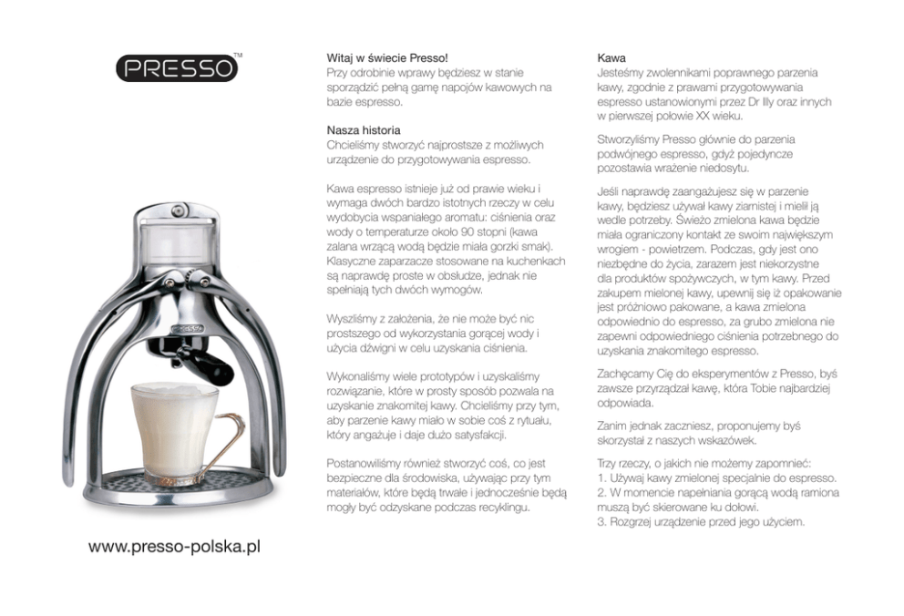 Witaj w świecie Presso! Przy odrobinie wprawy będziesz w stanie sporządzić pełną gamę napojów kawowych na bazie espresso. Nasza historia Chcieliśmy stworzyć najprostsze z możliwych urządzenie do przygotowywania espresso. Kawa espresso istnieje już od prawie wieku i wymaga dwóch bardzo istotnych rzeczy w celu wydobycia wspaniałego aromatu: ciśnienia oraz wody o temperaturze około 90 stopni (kawa zalana wrzącą wodą będzie miała gorzki smak). Klasyczne zaparzacze stosowane na kuchenkach są naprawdę proste w obsłudze, jednak nie spełniają tych dwóch wymogów. Wyszliśmy z założenia, że nie może być nic prostszego od wykorzystania gorącej wody i użycia dźwigni w celu uzyskania ciśnienia. www.presso-polska.pl Kawa Jesteśmy zwolennikami poprawnego parzenia kawy, zgodnie z prawami przygotowywania espresso ustanowionymi przez Dr Illy oraz innych w pierwszej połowie XX wieku. Stworzyliśmy Presso głównie do parzenia podwójnego espresso, gdyż pojedyncze pozostawia wrażenie niedosytu. Jeśli naprawdę zaangażujesz się w parzenie kawy, będziesz używał kawy ziarnistej i mielił ją wedle potrzeby. Świeżo zmielona kawa będzie miała ograniczony kontakt ze swoim największym wrogiem - powietrzem. Podczas, gdy jest ono niezbędne do życia, zarazem jest niekorzystne dla produktów spożywczych, w tym kawy. Przed zakupem mielonej kawy, upewnij się iż opakowanie jest próżniowo pakowane, a kawa zmielona odpowiednio do espresso, za grubo zmielona nie zapewni odpowiedniego ciśnienia potrzebnego do uzyskania znakomitego espresso. Wykonaliśmy wiele prototypów i uzyskaliśmy rozwiązanie, które w prosty sposób pozwala na uzyskanie znakomitej kawy. Chcieliśmy przy tym, aby parzenie kawy miało w sobie coś z rytuału, który angażuje i daje dużo satysfakcji. Zachęcamy Cię do eksperymentów z Presso, byś zawsze przyrządzał kawę, która Tobie najbardziej odpowiada. Postanowiliśmy również stworzyć coś, co jest bezpieczne dla środowiska, używając przy tym materiałów, które będą trwałe i jednocześnie będą mogły być odzyskane podczas recyklingu. Trzy rzeczy, o jakich nie możemy zapomnieć: 1. Używaj kawy zmielonej specjalnie do espresso. 2. W momencie napełniania gorącą wodą ramiona muszą być skierowane ku dołowi. 3. Rozgrzej urządzenie przed jego użyciem. Zanim jednak zaczniesz, proponujemy byś skorzystał z naszych wskazówek. Podwójne espresso Zacznij od zagotowania w czajniku świeżej wody. Umieść zmieloną kawę w filtrze i delikatnie ubij ją, używając odwrotnej strony naszej miarki. Następnie umieść filtr w głównej części Presso i zaciśnij go, przekręcając zgodnie z ruchem wskazówek zegara. Wskazówki eksperta Rozgrzej mocno filtr, zanim napełnisz go kawą. Odpowiednie zmielenie kawy daje lepsze efekty. Umieść odpowiednią filiżankę pod filtrem i nalej gorącej wody do poziomu górnej kreski. Należy przy tym pamiętać, by ramiona pozostawały skierowane ku dołowi. Następnie delikatnie je unieś. Wskazówki eksperta Wlej wodę ponad miarkę, żeby zwiększyć jej ciśnienie przy wyciskaniu. Przed opuszczeniem ramion zrób kilkusekundową przerwę w celu przesączenia się wody. Teraz powoli obniżaj ramiona, mocno je ściskając. Powinieneś czuć coraz większy opór, spowodowany przez wytwarzające się ciśnienie. Przerwij ściskanie ramion, gdy ilość kawy odpowiada podwójnemu espresso. Resztkę pozostałej kawy zlej do drugiej filiżanki, a następnie wylej. Wskazówki eksperta Tradycyjnie to mleko dodawane jest do kawy, lecz my, sugerujemy, by zrobić to odwrotnie. Przed spienieniem podgrzej mleko, jest to również najlepszy moment na posłodzenie przyszłego cappuccino. Trzymając spieniacz tłokiem do góry, włóż go do filiżanki z mocno ciepłym, acz nie wrzącym mlekiem. Wskazówki eksperta Przygotowanie kawy powinno zająć około 25 sekund. Pojedyncze espresso Po obiedzie idealnym rozwiązaniem jest zaparzenie dwóch pojedynczych espresso za jednym razem. By to zrobić, załóż na filtr przystawkę, pamiętając jednocześnie o umieszczeniu pod nią dwóch filiżanek. Cappuccino i latte Teraz, gdy posiadasz podstawową wiedzę o Presso, możesz dodawać do kawy spienione mleko w celu eksperymentowania z cappuccino i latte. Poruszaj tłokiem spieniacza, nasycając mleko powietrzem. Piana urośnie dosyć szybko. Teraz powoli wyjmij spieniacz, podstaw filiżankę pod Presso i wyciśnij podwójną porcję espresso prosto do mleka. Mmm pycha! Czyszczenie W celu wyczyszczenia Presso wykręć po prostu filtr, przekręcając go w prawo. Następnie wytrząśnij kawowe fusy oraz wypłucz sam filtr. Od czasu do czasu umyj całe Presso wodą z detergentem, lecz nie myj go w zmywarce!