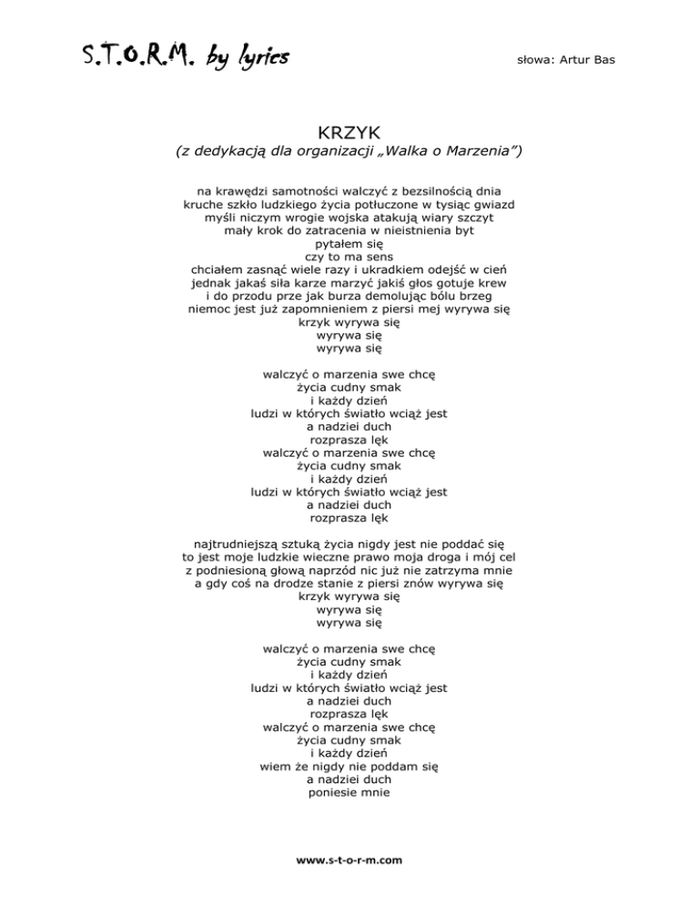 S.T.O.R.M. by lyrics słowa: Artur Bas KRZYK (z dedykacją dla organizacji „Walka o Marzenia”) na krawędzi samotności walczyć z bezsilnością dnia kruche szkło ludzkiego życia potłuczone w tysiąc gwiazd myśli niczym wrogie wojska atakują wiary szczyt mały krok do zatracenia w nieistnienia byt pytałem się czy to ma sens chciałem zasnąć wiele razy i ukradkiem odejść w cień jednak jakaś siła karze marzyć jakiś głos gotuje krew i do przodu prze jak burza demolując bólu brzeg niemoc jest już zapomnieniem z piersi mej wyrywa się krzyk wyrywa się wyrywa się wyrywa się walczyć o marzenia swe chcę życia cudny smak i każdy dzień ludzi w których światło wciąż jest a nadziei duch rozprasza lęk walczyć o marzenia swe chcę życia cudny smak i każdy dzień ludzi w których światło wciąż jest a nadziei duch rozprasza lęk najtrudniejszą sztuką życia nigdy jest nie poddać się to jest moje ludzkie wieczne prawo moja droga i mój cel z podniesioną głową naprzód nic już nie zatrzyma mnie a gdy coś na drodze stanie z piersi znów wyrywa się krzyk wyrywa się wyrywa się wyrywa się walczyć o marzenia swe chcę życia cudny smak i każdy dzień ludzi w których światło wciąż jest a nadziei duch rozprasza lęk walczyć o marzenia swe chcę życia cudny smak i każdy dzień wiem że nigdy nie poddam się a nadziei duch poniesie mnie www.s-t-o-r-m.com