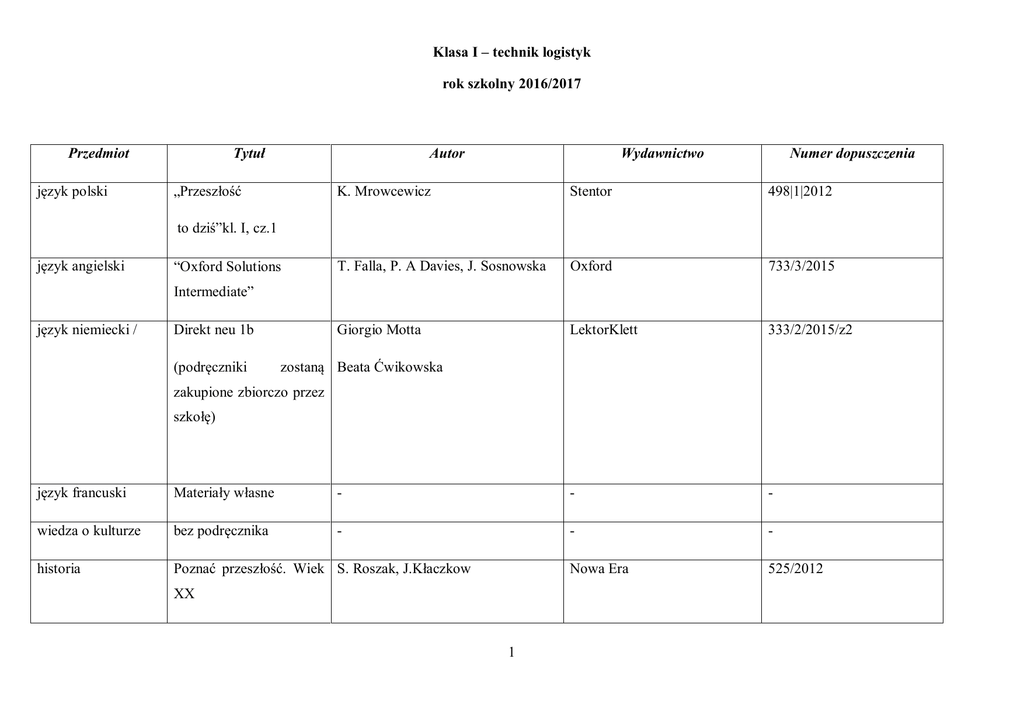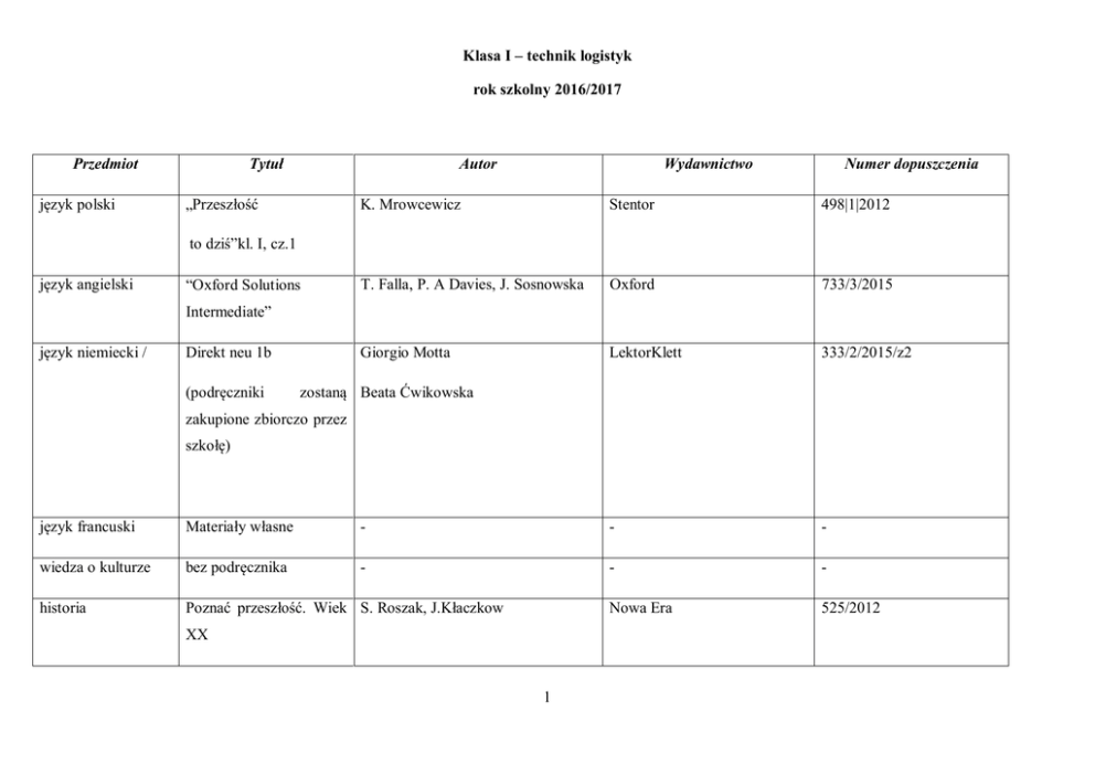 1 Klasa I – technik logistyk rok szkolny 2016/2017 Przedmiot Tytuł
