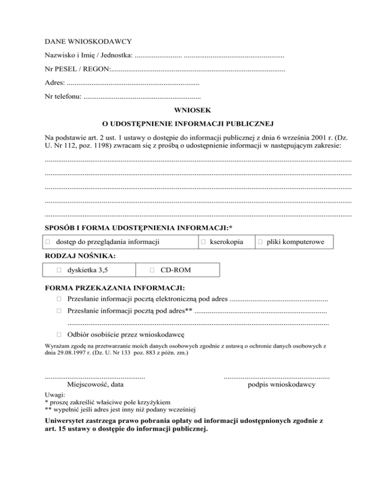 DANE WNIOSKODAWCY Nazwisko i Imię / Jednostka: ......................... ..................................................... Nr PESEL / REGON:............................................................................................ Adres: ...................................................................... Nr telefonu: .............................................................. WNIOSEK O UDOSTĘPNIENIE INFORMACJI PUBLICZNEJ Na podstawie art. 2 ust. 1 ustawy o dostępie do informacji publicznej z dnia 6 września 2001 r. (Dz. U. Nr 112, poz. 1198) zwracam się z prośbą o udostępnienie informacji w następującym zakresie: .................................................................................................................................................................. .................................................................................................................................................................. .................................................................................................................................................................. .................................................................................................................................................................. .................................................................................................................................................................. SPOSÓB I FORMA UDOSTĘPNIENIA INFORMACJI:* ٱdostęp do przeglądania informacji ٱkserokopia ٱpliki komputerowe RODZAJ NOŚNIKA: ٱdyskietka 3,5 ٱCD-ROM FORMA PRZEKAZANIA INFORMACJI: ٱPrzesłanie informacji pocztą elektroniczną pod adres .................................................... ٱPrzesłanie informacji pocztą pod adres** ...................................................................... .......................................................................................................................................... ٱOdbiór osobiście przez wnioskodawcę Wyrażam zgodę na przetwarzanie moich danych osobowych zgodnie z ustawą o ochronie danych osobowych z dnia 29.08.1997 r. (Dz. U. Nr 133 poz. 883 z późn. zm.) ..................................................... Miejscowość, data ........................................................ podpis wnioskodawcy Uwagi: * proszę zakreślić właściwe pole krzyżykiem ** wypełnić jeśli adres jest inny niż podany wcześniej Uniwersytet zastrzega prawo pobrania opłaty od informacji udostępnionych zgodnie z art. 15 ustawy o dostępie do informacji publicznej.