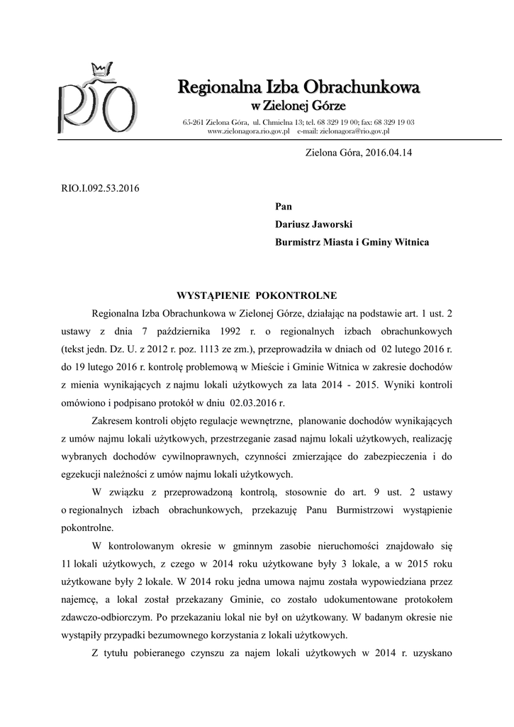 Regionalna Izba Obrachunkowa w Zielonej Górze 65-261 Zielona Góra, ul. Chmielna 13; tel. 68 329 19 00; fax: 68 329 19 03 www.zielonagora.rio.gov.pl e-mail: [email protected] Zielona Góra, 2016.04.14 RIO.I.092.53.2016 Pan Dariusz Jaworski Burmistrz Miasta i Gminy Witnica WYSTĄPIENIE POKONTROLNE Regionalna Izba Obrachunkowa w Zielonej Górze, działając na podstawie art. 1 ust. 2 ustawy z dnia 7 października 1992 r. o regionalnych izbach obrachunkowych (tekst jedn. Dz. U. z 2012 r. poz. 1113 ze zm.), przeprowadziła w dniach od 02 lutego 2016 r. do 19 lutego 2016 r. kontrolę problemową w Mieście i Gminie Witnica w zakresie dochodów z mienia wynikających z najmu lokali użytkowych za lata 2014 - 2015. Wyniki kontroli omówiono i podpisano protokół w dniu 02.03.2016 r. Zakresem kontroli objęto regulacje wewnętrzne, planowanie dochodów wynikających z umów najmu lokali użytkowych, przestrzeganie zasad najmu lokali użytkowych, realizację wybranych dochodów cywilnoprawnych, czynności zmierzające do zabezpieczenia i do egzekucji należności z umów najmu lokali użytkowych. W związku z przeprowadzoną kontrolą, stosownie do art. 9 ust. 2 ustawy o regionalnych izbach obrachunkowych, przekazuję Panu Burmistrzowi wystąpienie pokontrolne. W kontrolowanym okresie w gminnym zasobie nieruchomości znajdowało się 11 lokali użytkowych, z czego w 2014 roku użytkowane były 3 lokale, a w 2015 roku użytkowane były 2 lokale. W 2014 roku jedna umowa najmu została wypowiedziana przez najemcę, a lokal został przekazany Gminie, co zostało udokumentowane protokołem zdawczo-odbiorczym. Po przekazaniu lokal nie był on użytkowany. W badanym okresie nie wystąpiły przypadki bezumownego korzystania z lokali użytkowych. Z tytułu pobieranego czynszu za najem lokali użytkowych w 2014 r. uzyskano dochody w wysokości 15 933,20 zł, co stanowi 0,08 % dochodów własnych oraz 0,04 % dochodów budżetu gminy ogółem. W 2015 r. dochody z powyższego tytułu wyniosły 12 493,44 zł, co stanowi 0,06 % dochodów własnych oraz 0,03 % dochodów budżetu gminy ogółem. Zaległości w zapłacie czynszu na dzień 01.01.2014 r. posiadało 2 najemców na łączną kwotę 3 159,00 zł. Należności wraz z odsetkami zostały uregulowane w 2014 r. bez wezwania do zapłaty, z opóźnieniem wynoszącym od 1 do 7 miesięcy. Zaległości na dzień 31.12.2014 r. posiadał 1 najemca na kwotę 1 803,86 zł. Należności te wraz z odsetkami zostały uregulowane w 2015 r. bez wezwania do zapłaty, z opóźnieniem wynoszącym od 7 do 10 miesięcy. Na dzień 31.12.2015 r. zaległości nie wystąpiły. Kontrola wykazała, że w badanym okresie do dłużników nie wysyłano wezwań do zapłaty oraz nie dochodzono należności na drodze sądowej, co jest niezgodne z art. 42 ust. 5 ustawy z dnia 27 sierpnia 2009 r. o finansach publicznych (tekst jedn. Dz. U. z 2013 r. poz. 885 ze zm.). Osobą odpowiedzialną za powyższą nieprawidłowość jest Skarbnik Gminy. Kontrola wykazała, że umowa najmu lokalu użytkowego z dnia 01.02.2013 r. została zawarta na czas nieokreślony na wniosek osoby fizycznej, z pominięciem procedury przetargowej, co jest niezgodne z § 16 ust. 1 uchwały Nr XXII/116/2011 Rady Miejskiej w Witnicy z dnia 30 grudnia 2011 r. w sprawie określenia zasad nabywania, zbywania i obciążania nieruchomości oraz ich wydzierżawiania, wynajmowania i użyczania. Zgodnie z powyższym przepisem wydzierżawienie lub wynajmowanie nieruchomości na czas nieoznaczony, a także na czas oznaczony dłuższy niż 3 lata, w tym na kolejne okresy następujące po umowie zawartej na czas oznaczony do 3 lat, jeżeli przedmiotem umowy jest ta sama nieruchomość, odbywa się w trybie przetargowym. Rada Miejska w Witnicy nie wydała odrębnej uchwały wyrażającej zgodę na najem lokalu użytkowego w trybie bezprzetargowym. Obowiązek przeprowadzenia przetargu spoczywał na Burmistrzu Miasta i Gminy, co wynika z § 23 ww. uchwały Nr XXII/116/2011, w którym Rada Miejska powierzyła wykonanie uchwały Burmistrzowi oraz z § 2 ust. 1 zarządzenia nr 51 Burmistrza Miasta i Gminy Witnica z dnia 26 kwietnia 2011 r. w sprawie ustalenia zasad przeprowadzania przetargu ustnego nieograniczonego na najem lokali użytkowych oraz warunków najmu, w którym określono, że organizatorem przetargu jest Burmistrz Miasta i Gminy Witnica. Osobą odpowiedzialną za powyższą nieprawidłowość jest pełniący wówczas funkcję Burmistrza. 2 Z ustaleń kontroli oraz z wyjaśnień osób odpowiedzialnych wynika, że przyczyną nieprawidłowości była niewłaściwa interpretacja przepisów prawa. Jednocześnie informuję, że w przypadku nieprawidłowości o incydentalnym charakterze lub wyeliminowanych w trakcie kontroli, po udzieleniu stosownego instruktażu, nie formułowano wniosków pokontrolnych, a w pozostałym zakresie kontroli wymienionym we wstępie wystąpienia nie stwierdzono nieprawidłowości. Przedstawiając powyższe uwagi, na podstawie art. 9 ust. 2 ustawy o regionalnych izbach obrachunkowych, wnoszę o: 1. Podejmowanie wobec najemców posiadających zaległości, czynności windykacyjnych zmierzających do wykonania zobowiązania zgodnie z art. 42 ust. 5 ustawy z dnia z dnia 27 sierpnia 2009 r. o finansach publicznych (tekst jedn. Dz. U. z 2013 r. poz. 885 z późn. zm.). 2. Zawieranie umów najmu lub dzierżawy nieruchomości na czas oznaczony dłuższy niż trzy lata lub na czas nieoznaczony w drodze przetargu zgodnie z wewnętrznymi uregulowaniami w tym zakresie. Zgodnie z art. 9 ust. 3 i 4 ustawy o regionalnych izbach obrachunkowych, do wniosków zawartych w wystąpieniu pokontrolnym przysługuje prawo zgłoszenia zastrzeżenia do Kolegium Izby. Informację o wykonaniu wniosków pokontrolnych lub przyczynach ich niewykonania, proszę przekazać Regionalnej Izbie Obrachunkowej w Zielonej Górze, w terminie 30 dni od dnia otrzymania niniejszego wystąpienia pokontrolnego. Prezes Izby /-/ Ryszard Zajączko