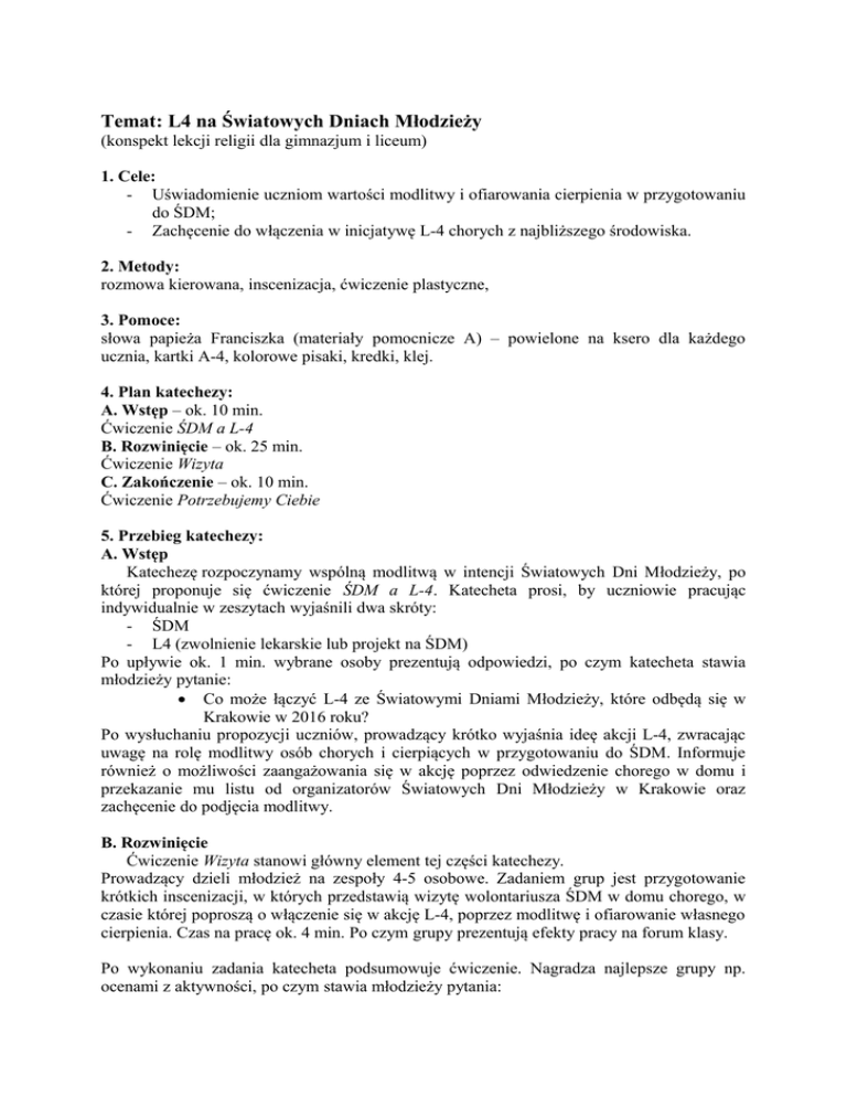 Temat: L4 na Światowych Dniach Młodzieży (konspekt lekcji religii dla gimnazjum i liceum) 1. Cele: - Uświadomienie uczniom wartości modlitwy i ofiarowania cierpienia w przygotowaniu do ŚDM; - Zachęcenie do włączenia w inicjatywę L-4 chorych z najbliższego środowiska. 2. Metody: rozmowa kierowana, inscenizacja, ćwiczenie plastyczne, 3. Pomoce: słowa papieża Franciszka (materiały pomocnicze A) – powielone na ksero dla każdego ucznia, kartki A-4, kolorowe pisaki, kredki, klej. 4. Plan katechezy: A. Wstęp – ok. 10 min. Ćwiczenie ŚDM a L-4 B. Rozwinięcie – ok. 25 min. Ćwiczenie Wizyta C. Zakończenie – ok. 10 min. Ćwiczenie Potrzebujemy Ciebie 5. Przebieg katechezy: A. Wstęp Katechezę rozpoczynamy wspólną modlitwą w intencji Światowych Dni Młodzieży, po której proponuje się ćwiczenie ŚDM a L-4. Katecheta prosi, by uczniowie pracując indywidualnie w zeszytach wyjaśnili dwa skróty: - ŚDM - L4 (zwolnienie lekarskie lub projekt na ŚDM) Po upływie ok. 1 min. wybrane osoby prezentują odpowiedzi, po czym katecheta stawia młodzieży pytanie: Co może łączyć L-4 ze Światowymi Dniami Młodzieży, które odbędą się w Krakowie w 2016 roku? Po wysłuchaniu propozycji uczniów, prowadzący krótko wyjaśnia ideę akcji L-4, zwracając uwagę na rolę modlitwy osób chorych i cierpiących w przygotowaniu do ŚDM. Informuje również o możliwości zaangażowania się w akcję poprzez odwiedzenie chorego w domu i przekazanie mu listu od organizatorów Światowych Dni Młodzieży w Krakowie oraz zachęcenie do podjęcia modlitwy. B. Rozwinięcie Ćwiczenie Wizyta stanowi główny element tej części katechezy. Prowadzący dzieli młodzież na zespoły 4-5 osobowe. Zadaniem grup jest przygotowanie krótkich inscenizacji, w których przedstawią wizytę wolontariusza ŚDM w domu chorego, w czasie której poproszą o włączenie się w akcję L-4, poprzez modlitwę i ofiarowanie własnego cierpienia. Czas na pracę ok. 4 min. Po czym grupy prezentują efekty pracy na forum klasy. Po wykonaniu zadania katecheta podsumowuje ćwiczenie. Nagradza najlepsze grupy np. ocenami z aktywności, po czym stawia młodzieży pytania: W jaki sposób powinna przebiegać taka wizyta? Na co należy zwrócić szczególną uwagę? Czego byście oczekiwali od wolontariusza będąc na miejscu osoby chorej? Dlaczego odwiedziny u osoby chorej winny być kontynuowane w ciągu roku? W podsumowaniu rozmowy katecheta prosi, by uczniowie w zeszytach napisali w 5 punktach odpowiedź na pytanie: W jaki sposób mam się przygotować do wizyty u osoby chorej i jak powinienem zachować się w jej domu, by włączyła się ona w przygotowanie do ŚDM poprzez swoją modlitwę i ofiarowanie cierpienia? Przykład: Powinienem: 1. Przygotować jakiś drobiazg np. kartkę z życzeniami i słowami papieża Franciszka (materiały pomocnicze A), który ofiaruję odwiedzanej osobie. 2. Zwrócić uwagę na potrzeby tej osoby. 3. Zadbać o właściwe zachowanie, by niczym jej nie urazić. 4. Zapytać w jaki sposób mogę jej pomóc. 5. Przekazać jasno informacje nt. akcji L-4, zwracając uwagę na rolę tej osoby w przygotowaniu do ŚDM. Po upływie ok. 3 min. wybrani uczniowie prezentują swoje prace. Na koniec można zapisać w zeszytach jeden wspólny plan wizyty u chorego. C. Zakończenie: Ćwiczenie Potrzebujemy Ciebie, stanowi ostatni element katechezy. Katecheta rozdaje każdemu uczniowi w klasie kartkę A-4, słowa papieża Franciszka (materiały pomocnicze A), kredki, pisaki, klej. Prosi, by uczniowie pracując samodzielnie przygotowali kartki do chorych, których odwiedzą, przekazując im słowa papieża Franciszka oraz własne życzenia. Czas na pracę ok. 8 min. Jeśli uczniowie nie zdążą dokończyć prac, mogą to wykonać w domu. Ważne, by katecheta na następnych zajęciach sprawdził, czy kartki zostały przygotowane przez młodzież. W podsumowaniu katechezy warto podkreślić fakt, iż uczniowie idąc do chorych powinni zastosować się do opracowanego planu wizyty. 6. Materiały pomocnicze: A. Papież Franciszek do chorych, 9 listopada 2013 r. „Wasza obecność, cicha, ale bardziej wymowna od wielu słów, wasza modlitwa, codzienne ofiarowanie swych cierpień w jedności z tymi, które Jezus ukrzyżowany poniósł za zbawienie świata, cierpliwa i nawet radosna akceptacja własnej sytuacji są duchowymi zasobami, bogactwem każdej wspólnoty chrześcijańskiej. Nie wstydźcie się być cennym skarbem Kościoła!” Opracowała Renata Chrzanowska