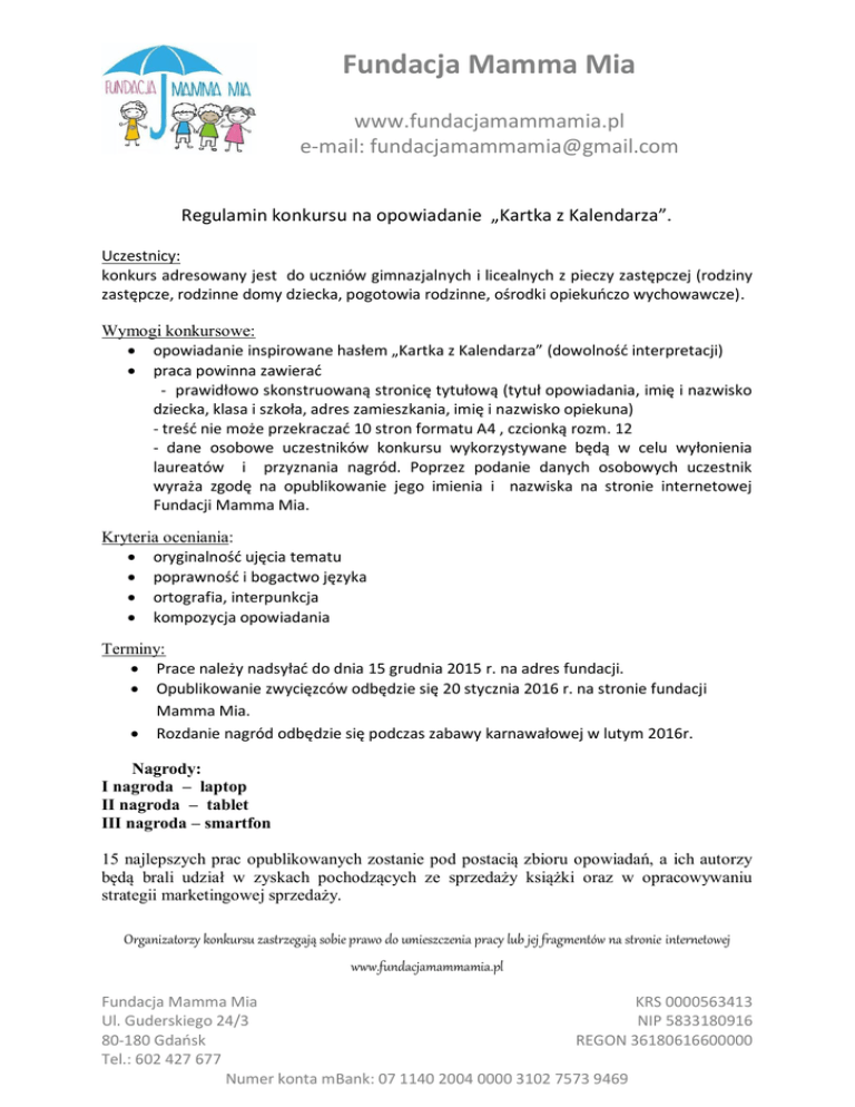 Fundacja Mamma Mia www.fundacjamammamia.pl e-mail: [email protected] Regulamin konkursu na opowiadanie „Kartka z Kalendarza”. Uczestnicy: konkurs adresowany jest do uczniów gimnazjalnych i licealnych z pieczy zastępczej (rodziny zastępcze, rodzinne domy dziecka, pogotowia rodzinne, ośrodki opiekuńczo wychowawcze). Wymogi konkursowe: opowiadanie inspirowane hasłem „Kartka z Kalendarza” (dowolność interpretacji) praca powinna zawierać - prawidłowo skonstruowaną stronicę tytułową (tytuł opowiadania, imię i nazwisko dziecka, klasa i szkoła, adres zamieszkania, imię i nazwisko opiekuna) - treść nie może przekraczać 10 stron formatu A4 , czcionką rozm. 12 - dane osobowe uczestników konkursu wykorzystywane będą w celu wyłonienia laureatów i przyznania nagród. Poprzez podanie danych osobowych uczestnik wyraża zgodę na opublikowanie jego imienia i nazwiska na stronie internetowej Fundacji Mamma Mia. Kryteria oceniania: oryginalność ujęcia tematu poprawność i bogactwo języka ortografia, interpunkcja kompozycja opowiadania Terminy: Prace należy nadsyłać do dnia 15 grudnia 2015 r. na adres fundacji. Opublikowanie zwycięzców odbędzie się 20 stycznia 2016 r. na stronie fundacji Mamma Mia. Rozdanie nagród odbędzie się podczas zabawy karnawałowej w lutym 2016r. Nagrody: I nagroda – laptop II nagroda – tablet III nagroda – smartfon 15 najlepszych prac opublikowanych zostanie pod postacią zbioru opowiadań, a ich autorzy będą brali udział w zyskach pochodzących ze sprzedaży książki oraz w opracowywaniu strategii marketingowej sprzedaży. Organizatorzy konkursu zastrzegają sobie prawo do umieszczenia pracy lub jej fragmentów na stronie internetowej www.fundacjamammamia.pl Fundacja Mamma Mia KRS 0000563413 Ul. Guderskiego 24/3 NIP 5833180916 80-180 Gdańsk REGON 36180616600000 Tel.: 602 427 677 Numer konta mBank: 07 1140 2004 0000 3102 7573 9469