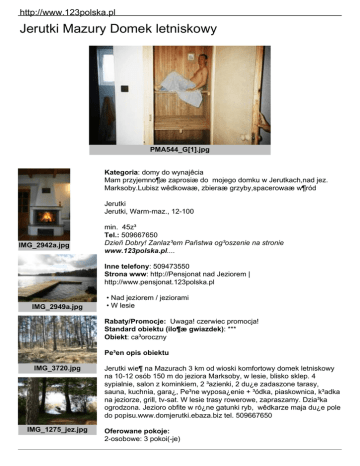 http://www.123polska.pl Jerutki Mazury Domek letniskowy PMA544_G[1].jpg Kategoria: domy do wynajêcia Mam przyjemno¶æ zaprosiæ do mojego domku w Jerutkach,nad jez. Marksoby.Lubisz wêdkowaæ, zbieraæ grzyby,spacerowaæ w¶ród Jerutki Jerutki, Warm-maz., 12-100 IMG_2942a.jpg min. 45z³ Tel.: 509667650 Dzieñ Dobry! Zanlaz³em Pañstwa og³oszenie na stronie www.123polska.pl.... Inne telefony: 509473550 Strona www: http://Pensjonat nad Jeziorem | http://www.pensjonat.123polska.pl IMG_2949a.jpg • Nad jeziorem / jeziorami • W lesie Rabaty/Promocje: Uwaga! czerwiec promocja! Standard obiektu (ilo¶æ gwiazdek): *** Obiekt: ca³oroczny Pe³en opis obiektu IMG_3720.jpg IMG_1275_jez.jpg Jerutki wie¶ na Mazurach 3 km od wioski komfortowy domek letniskowy na 10-12 osób 150 m do jeziora Marksoby, w lesie, blisko sklep. 4 sypialnie, salon z kominkiem, 2 ³azienki, 2 du¿e zadaszone tarasy, sauna, kuchnia, gara¿, Pe³ne wyposa¿enie + ³ódka, piaskownica, k³adka na jeziorze, grill, tv-sat. W lesie trasy rowerowe, zapraszamy. Dzia³ka ogrodzona. Jezioro obfite w ró¿ne gatunki ryb, wêdkarze maja du¿e pole do popisu.www.domjerutki.ebaza.biz tel. 509667650 Oferowane pokoje: 2-osobowe: 3 pokoi(-je) http://www.123polska.pl 4-osobowe: 1 pokoi(-je) Ilo¶æ Apartamentów: 4 Cena za ca³o¶æ: Cena za dobê (za ca³o¶æ): 350 z³ Ca³kowieta ilo¶c miejsc noclegowych: ok. 12 douche_jerutki.JPG Cena za osobê (w SEZONIE): w pokoju 1-osob: 35 z³ Cennik: inne Zadatek nie podlega zwrotowi w przypadku rezygnacji Go¶cia z pobytu. Ca³o¶ci rozliczenia nale¿no¶ci za pobyt pobyt dokonujemy w dniu przyjazdu. P³atno¶æ na miejscu tylko gotówk± lub przed przyjazdem wp³ata na nasze konto bankowe. PMA544_C[1].jpg Wy¿ywienie: • Mo¿liwo¶æ zorganizowania obiadów (w innym obiekcie) • Aneks kuchenny w pokojach/domkach Inne: Kuchnia w pe³ni wyposazona, mozliwo¶æ zamówienia obiadów z dowozem lub restauracja 3 km barek z pierogami i rybk± 300 m Na terenie obiektu: • salka TV • sala kominkowa michalqqqqq171012.jpg • grill • miejsce na ognisko • sauna • plac zabaw • mo¿liwo¶æ przechowania rowerów • mo¿liwo¶æ przechowania nart • gara¿ • parking zabezpieczony (zamykany) Inne: ³ódka k³adka 13496916485140.jpg Pozosta³e: • akceptujemy zwierzêta • zakaz palenia w ca³ym obiekcie • mówimy po niemiecku • mówimy po rosyjsku 167899.jpg W KA¯DYM pokoju apartamencie domku: • toaleta • ³azienka • prysznic • aneks kuchenny • lodówka • czajnik elektryczny • garnki • podstawowe naczynia • sztuæce • telewizor http://www.123polska.pl • balkon W NIEKTÓRYCH pokojach apartamentach domkach: • toaleta • prysznic • ³azienka • lodówka • czajnik elektryczny • garnki • sztuæce • balkon Opis otoczenia Mam przyjemno¶æ zaprosiæ do wynajêcia mojego domku w miejscowo¶ci Jerutki ko³o Szczytna, nad jeziorem Marksoby. Je¶li lubisz wêdkowaæ, zbieraæ grzyby, spacerowaæ w¶ród mazurskiej przyrody oraz wypoczywaæ na ³onie natury Domek jest 10-12-osobowy 9 km od Szczytna. Doj¶cie do jeziora jest proste i wynosi 150-200 m.Domek jest parterowy z poddaszem u¿ytkowym i gara¿em. Parter: salon z kominkiem, sypialnia z ³ó¿kiem podwójnym, telewizor i komplet wypoczynkowy, kuchnia z aneksem - pe³ne wyposa¿enie (lodówka, czajnik elektryczny, kuchenka elektryczna, naczynia: garnki, talerze, sztuæce, itp.), ³azienka, 2 WC, sauna, prysznic, ciep³a i zimna woda, duzy zadaszony taras z meblami ogrodowymi. poddasze: 2 sypialnie 2-osobowe i jedna 4-osobowa z du¿ym zadaszonym tarasemdodatkowo: grill, dzia³ka 6 ar ogrodzona, ³ódka, meble ogrodowe, hu¶tawka, piaskownica, gara¿, miejsce parkingowe Atrakcje turystyczne: jezioro,las Dojazd: jerutki W pobli¿u: do sklepu: 0.3 km do supermarketu / marketu: 7 km restauracje / kawiarnie / bary: 7 km dyskoteka / dancing / klub nocny: 7 km s³u¿by medyczne: 3 km poczta: 3 km bank / bankomat: 7 km budka telefoniczna: 3 km Internet Cafe: 7 km dworzec / przystanek PKS: 3 km dworzec PKP: 3 km
