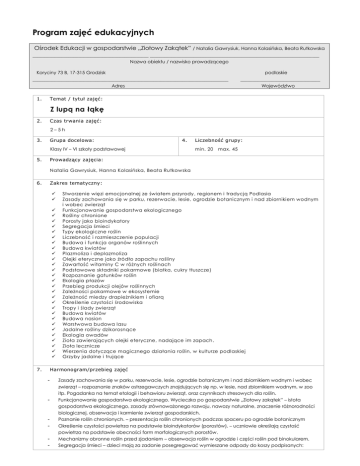 Program zajęć edukacyjnych Ośrodek Edukacji w gospodarstwie „Ziołowy Zakątek” / Natalia Gawrysiuk, Hanna Kolasińska, Beata Rutkowska ________________________________________________ ______________________________________________________________________ Nazwa obiektu / nazwisko prowadzącego Koryciny 73 B, 17-315 Grodzisk _________________________________________________________________________________ Adres 1. podlaskie _________________________________ Województwo Temat / tytuł zajęć: Z lupą na łąkę 2. Czas trwania zajęć: 2–5h 3. Grupa docelowa: 4. Klasy IV – VI szkoły podstawowej 5. Liczebność grupy: min. 20 max. 45 Prowadzący zajęcia: Natalia Gawrysiuk, Hanna Kolasińska, Beata Rutkowska 6. Zakres tematyczny: 7. Stworzenie więzi emocjonalnej ze światem przyrody , regionem i tradycją Podlasia Zasady zachowania się w parku, rezerwacie, lesie, ogrodzie botanicznym i nad zbiornikiem wodnym i wobec zwierząt Funkcjonowanie gospodarstwa ekologicznego Rośliny chronione Porosty jako bioindykatory Segregacja śmieci Typy ekologiczne roślin Liczebność i rozmieszczenie populacji Budowa i funkcja organów roślinnych Budowa kwiatów Plazmoliza i deplazmoliza Olejki eteryczne jako źródło zapachu rośliny Zawartość witaminy C w różnych roślinach Podstawowe składniki pokarmowe (białka, cukry tłuszcze) Rozpoznanie gatunków roślin Ekologia płazów Przebieg produkcji olejów roślinnych Zależności pokarmowe w ekosystemie Zależność miedzy drapieżnikiem i ofiarą Określenie czystości środowiska Tropy i ślady zwierząt Budowa kwiatów Budowa nasion Warstwowa budowa lasu Jadalne rośliny dzikorosnące Ekologia owadów Zioła zawierających olejki eteryczne, nadające im zapach . Zioła lecznicze Wierzenia dotyczące magicznego działania roślin, w kulturze podlaskiej Grzyby jadalne i trujące Harmonogram/przebieg zajęć - - - Zasady zachowania się w parku, rezerwacie, lesie, ogrodzie botanicznym i nad zbiornikiem wodnym i wobec zwierząt – rozpoznanie znaków ostrzegawczych znajdujących się np. w lesie, nad zbiornikiem wodnym, w zoo itp. Pogadanka na temat etologii i behawioru zwierząt, oraz czynnikach stresowych dla roślin. Funkcjonowanie gospodarstwa ekologicznego. Wycieczka po gospodarstwie „Ziołowy zakątek” – istota gospodarstwa ekologicznego, zasady zrównoważonego rozwoju, nawozy naturalne, znaczenie różnorodności biologicznej, obserwacja i karmienie zwierząt gospodarskich. Poznanie roślin chronionych. – prezentacja roślin chronionych podczas spaceru po ogrodzie botanicznym Określenie czystości powietrza na podstawie bioindykatorów (porostów). – uczniowie określają czystość powietrza na podstawie obecności form morfologicznych porostów. Mechanizmy obronne roślin przed zjadaniem – obserwacja roślin w ogrodzie i części roślin pod binokularem. Segregacja śmieci – dzieci mają za zadanie posegregować wymieszane odpady do koszy podpisanych: - - - - - - - papier, szkło, metal, plastik. Zabawa „Łańcuch pokarmowy” – dzieci podzielone są na dwie grupy, grupy otrzymują plakietki ze zdjęciem i nazwą zwierzęcia lub rośliny oraz sznurki. Dzieci mają za zadanie przedstawić prosty łańcuch pokarmowy, gdzie sznurek symbolizuje połączenie między „zjadanym” i „zjadającym”. Zabawa „Drapieżnik i ofiara” – kilkoro uczniów wciela się w rolę drapieżnika, reszta uczniów gra rolę ofiary. Dzieci bawią się w „berka”, gdzie drapieżnik goni ofiarę. Typy ekologiczne roślin na przykładzie gatunków – obserwacja typów ekologicznych roślin posadzonych nad stawem, określenie cech typowych dla różnych typów ekologicznych. Badanie liczebności i rozmieszczenia populacji wybranego gatunku rośliny zielnej – uczniowie rzucają drewnianą ramkę na łąkę. Liczą ilość osobników danego gatunku rośliny w obrębie ramki i określają typ rozmieszczenia tej rośliny. Rośliny jako wskaźniki jakości gleby – za pomocą prostego klucza, w którym znajdują się rośliny będące wskaźnikiem jakości gleby, uczniowie określają jaka gleba znajduje się na danym terenie. Budowa organów roślinnych - obserwacja pod mikroskopem: preparaty wykonane z liści, łodygi i korzenia oraz pod binokularem: kwiaty proste i złożone. Szukanie tropów i śladów obecności zwierząt – rozróżnienie pojęć ślad i trop. Dzieci mają za zadanie znaleźć jak najwięcej tropów i śladów obecności zwierząt na danym terenie. Badanie właściwości gleby – badanie fizycznych właściwości gleby: obecność cząstek różnej wielkości (za pomocą sita), wchłanianie wody za pomocą sił kapilarnych (zanurzenie w wodzie gleby znajdującej się w wysokim, przezroczystym naczyniu i obserwacja wędrówki wody). Właściwości organoleptyczne. Budowa kwiatów – zrobienie modelu kwiatu z bibuły, kartonu, plastelina i inne, na podstawie ilustracji przedstawiającej budowę kwiatu. Określanie czystości próbki wody pobranej ze stawu na podstawie właściwości organoleptycznych Wykonanie prostego filtru do wody – przelanie wody przez filtr wykonany z piasku i bibuły. Budowa kwiatów – zrobienie modelu kwiatu z bibuły, kartonu, plastelina i inne, na podstawie ilustracji przedstawiającej budowę kwiatu. „Jak wędrują nasiona” – sposoby rozsiewania się nasion – prezentacja sposobów wędrówki nasion przenoszonych przez różne czynniki środowiskowe, wskazanie elementów budowy, które umożliwiają tą wędrówkę. Dlaczego rośliny pachną – obserwacja roślin zapachowych podczas spaceru po ogrodzie botanicznym prezentacja olejków eterycznych, pogadanka na temat pozyskiwania olejków eterycznych. Doświadczenie ilustrujące plazmolizę i deplazmolizę na przykładzie ziemniaka – z bulwy ziemniaka wycina się 3 podłużne, równe kawałki, zanurza się je: pierwszy w wodzie destylowanej, drugi w mniejszym aa trzeci w większym stężeniu cukru. Po upływi