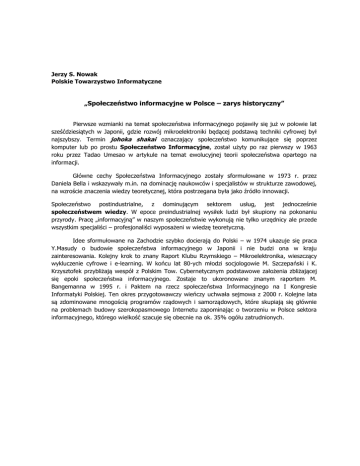 Jerzy S. Nowak Polskie Towarzystwo Informatyczne „Społeczeństwo informacyjne w Polsce – zarys historyczny” Pierwsze wzmianki na temat społeczeństwa informacyjnego pojawiły się już w połowie lat sześćdziesiątych w Japonii, gdzie rozwój mikroelektroniki będącej podstawą techniki cyfrowej był najszybszy. Termin johoka shakai oznaczający społeczeństwo komunikujące się poprzez komputer lub po prostu Społeczeństwo Informacyjne, został użyty po raz pierwszy w 1963 roku przez Tadao Umesao w artykule na temat ewolucyjnej teorii społeczeństwa opartego na informacji. Główne cechy Społeczeństwa Informacyjnego zostały sformułowane w 1973 r. przez Daniela Bella i wskazywały m.in. na dominację naukowców i specjalistów w strukturze zawodowej, na wzroście znaczenia wiedzy teoretycznej, która postrzegana była jako źródło innowacji. Społeczeństwo postindustrialne, z dominującym sektorem usług, jest jednocześnie społeczeństwem wiedzy. W epoce preindustrialnej wysiłek ludzi był skupiony na pokonaniu przyrody. Pracę „informacyjną” w naszym społeczeństwie wykonują nie tylko urzędnicy ale przede wszystkim specjaliści – profesjonaliści wyposażeni w wiedzę teoretyczną. Idee sformułowane na Zachodzie szybko docierają do Polski – w 1974 ukazuje się praca Y.Masudy o budowie społeczeństwa informacyjnego w Japonii i nie budzi ona w kraju zainteresowania. Kolejny krok to znany Raport Klubu Rzymskiego – Mikroelektronika, wieszczący wykluczenie cyfrowe i e-learning. W końcu lat 80-ych młodzi socjologowie M. Szczepański i K. Krzysztofek przybliżają wespół z Polskim Tow. Cybernetycznym podstawowe założenia zbliżającej się epoki społeczeństwa informacyjnego. Zostaje to ukoronowane znanym raportem M. Bangemanna w 1995 r. i Paktem na rzecz społeczeństwa Informacyjnego na I Kongresie Informatyki Polskiej. Ten okres przygotowawczy wieńczy uchwała sejmowa z 2000 r. Kolejne lata są zdominowane mnogością programów rządowych i samorządowych, które skupiają się głównie na problemach budowy szerokopasmowego Internetu zapominając o tworzeniu w Polsce sektora informacyjnego, którego wielkość szacuje się obecnie na ok. 35% ogółu zatrudnionych.
