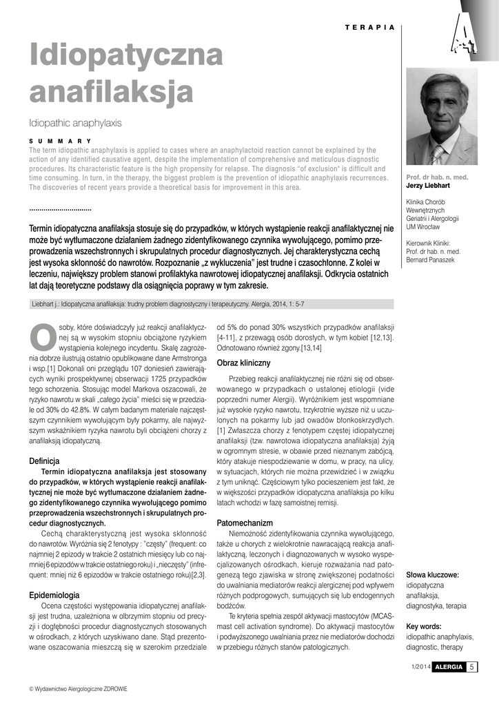 t e r a p i a Idiopatyczna anafilaksja Idiopathic anaphylaxis S U M M AR Y The term idiopathic anaphylaxis is applied to cases where an anaphylactoid reaction cannot be explained by the action of any identified causative agent, despite the implementation of comprehensive and meticulous diagnostic procedures. Its characteristic feature is the high propensity for relapse. The diagnosis “of exclusion" is difficult and time consuming. In turn, in the therapy, the biggest problem is the prevention of idiopathic anaphylaxis recurrences. The discoveries of recent years provide a theoretical basis for improvement in this area. ............................... Termin idiopatyczna anafilaksja stosuje się do przypadków, w których wystąpienie reakcji anafilaktycznej nie może być wytłumaczone działaniem żadnego zidentyfikowanego czynnika wywołującego, pomimo przeprowadzenia wszechstronnych i skrupulatnych procedur diagnostycznych. Jej charakterystyczna cechą jest wysoka skłonność do nawrotów. Rozpoznanie „z wykluczenia” jest trudne i czasochłonne. Z kolei w leczeniu, największy problem stanowi profilaktyka nawrotowej idiopatycznej anafilaksji. Odkrycia ostatnich lat dają teoretyczne podstawy dla osiągnięcia poprawy w tym zakresie. Prof. dr hab. n. med. Jerzy Liebhart Klinika Chorób Wewnętrznych Geriatrii i Alergologii UM Wrocław Kierownik Kliniki: Prof. dr hab. n. med. Bernard Panaszek Liebhart j.: Idiopatyczna anafilaksja: trudny problem diagnostyczny i terapeutyczny. Alergia, 2014, 1: 5-7 O soby, które doświadczyły już reakcji anafilaktycznej są w wysokim stopniu obciążone ryzykiem wystąpienia kolejnego incydentu. Skalę zagrożenia dobrze ilustrują ostatnio opublikowane dane Armstronga i wsp.[1] Dokonali oni przeglądu 107 doniesień zawierających wyniki prospektywnej obserwacji 1725 przypadków tego schorzenia. Stosując model Markova oszacowali, że ryzyko nawrotu w skali „całego życia” mieści się w przedziale od 30% do 42.8%. W całym badanym materiale najczęstszym czynnikiem wywołującym były pokarmy, ale najwyższym wskaźnikiem ryzyka nawrotu byli obciążeni chorzy z anafilaksją idiopatyczną. Definicja Termin idiopatyczna anafilaksja jest stosowany do przypadków, w których wystąpienie reakcji anafilaktycznej nie może być wytłumaczone działaniem żadnego zidentyfikowanego czynnika wywołującego pomimo przeprowadzenia wszechstronnych i skrupulatnych procedur diagnostycznych. Cechą charakterystyczną jest wysoka skłonność do nawrotów. Wyróżnia się 2 fenotypy : ”częsty” (frequent: co najmniej 2 epizody w trakcie 2 ostatnich miesięcy lub co najmniej 6 epizodów w trakcie ostatniego roku) i „nieczęsty” (infrequent: mniej niż 6 epizodów w trakcie ostatniego roku)[2,3]. Epidemiologia Ocena częstości występowania idiopatycznej anafilaksji jest trudna, uzależniona w olbrzymim stopniu od precyzji i dogłębności procedur diagnostycznych stosowanych w ośrodkach, z których uzyskiwano dane. Stąd prezentowane oszacowania mieszczą się w szerokim przedziale od 5% do ponad 30% wszystkich przypadków anafilaksji [4-11], z przewagą osób dorosłych, w tym kobiet [12,13]. Odnotowano również zgony.[13,14] Obraz kliniczny Przebieg reakcji anafilaktycznej nie różni się od obserwowanego w przypadkach o ustalonej etiologii (vide poprzedni numer Alergii). Wyróżnikiem jest wspomniane już wysokie ryzyko nawrotu, trzykrotnie wyższe niż u uczulonych na pokarmy lub jad owadów błonkoskrzydłych. [1] Zwłaszcza chorzy z fenotypem częstej idiopatycznej anafilaksji (tzw. nawrotowa idiopatyczna anafilaksja) żyją w ogromnym stresie, w obawie przed nieznanym zabójcą, który atakuje niespodziewanie w domu, w pracy, na ulicy, w sytuacjach, których nie można przewidzieć i w związku z tym uniknąć. Częściowym tylko pocieszeniem jest fakt, że w większości przypadków idiopatyczna anafilaksja po kilku latach wchodzi w fazę samoistnej remisji. Patomechanizm Niemożność zidentyfikowania czynnika wywołującego, także u chorych z wielokrotnie nawracającą reakcja anafilaktyczną, leczonych i diagnozowanych w wysoko wyspecjalizowanych ośrodkach, kieruje rozważania nad patogenezą tego zjawiska w stronę zwiększonej podatności do uwalniania mediatorów reakcji alergicznej pod wpływem różnych podprogowych, sumujących się lub endogennych bodźców. Te kryteria spełnia zespół aktywacji mastocytów (MCASmast cell activation syndrome). Do aktywacji mastocytów i podwyższonego uwalniania przez nie mediatorów dochodzi w przebiegu różnych stanów patologicznych. Słowa kluczowe: idiopatyczna anafilaksja, diagnostyka, terapia Key words: idiopathic anaphylaxis, diagnostic, therapy 1/2014 ALERGIA © Wydawnictwo Alergologiczne ZDROWIE 5 t e r a p i a W 2010 roku eksperci uczestniczący w Roboczej Konferencji na Temat Patologii Mastocytów zaproponowali klasyfikację MCAS z podziałem na 3 warianty [16,17]: • pierwotny MCAS – spowodowany klonalnym rozrostem mastocytów o genotypie KIT D816V charakterystycznym dla mastocytozy • wtórny MCAS – w przebiegu schorzeń alergicznych i atopii, bez klonalnego rozrostu mastocytów • idiopatyczny MCAS – obejmujący przypadki bez klonalnego rozrostu mastocytów, obecności schorzeń przebiegających z ich aktywowaniem oraz obecności alergenowo specyficznych IgE Za podstawowe kryterium diagnostyczne przyjęto wzrost stężenia tryptazy w surowicy krwi w stosunku do wartości wyjściowej o 20% +2 ng/ml, przy obecności objawów klinicznych reagujących na stosowanie leków osłabiających działanie uwalnianych z mastocytów mediatorów. Aby ten algorytm diagnostyczny był wykonalny należy oznaczyć stężenie tryptazy w surowicy krwi 24 godziny po ustąpieniu objawów. Koncepcja MCAS porządkuje sposób myślenia na temat potencjalnych mechanizmów idiopatycznej anafilaksji, ale jednocześnie podkreśla, że dla większości przypadków są one nadal niejasne. W d