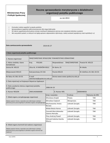 ZŽĐnjŶĞƐƉƌĂǁŽnjĚĂŶŝĞŵĞƌLJƚŽƌLJĐnjŶĞnjĚnjŝĂųĂůŶŽƑĐŝ ŽƌŐĂŶŝnjĂĐũŝƉŽǏLJƚŬƵƉƵďůŝĐnjŶĞŐŽ Ministerstwo Pracy ŝWŽůŝƚLJŬŝ^ƉŽųĞĐnjŶĞũ za rok 2013 • • • • &ŽƌŵƵůĂƌnjŶĂůĞǏLJǁLJƉĞųŶŝđǁũħnjLJŬƵƉŽůƐŬŝŵ͖ ^ƉƌĂǁŽnjĚĂǁĐĂǁLJƉĞųŶŝĂƚLJůŬŽƉƌnjĞnjŶĂĐnjŽŶĞĚůĂŶŝĞŐŽďŝĂųĞƉŽůĂ͖ tƚƌĂŬĐŝĞǁLJƉĞųŶŝĂŶŝĂĨŽƌŵƵůĂƌnjĂŝƐƚŶŝĞũĞŵŽǏůŝǁŽƑđĚŽĚĂǁĂŶŝĂǁŝĞƌƐnjLJŽƌĂnjnjĂǁŝũĂŶŝĂƚĞŬƐƚſǁǁƉŽůĂĐŚ͖ tĞǁƐnjLJƐƚŬŝĐŚƉŽůĂĐŚ͕ǁŬƚſƌLJĐŚŶŝĞďħĚČǁƉŝƐĂŶĞŽĚƉŽǁŝĞĚŶŝĞŝŶĨŽƌŵĂĐũĞ͕ŶĂůĞǏLJǁƐƚĂǁŝđƉŽũĞĚLJŶĐnjLJnjŶĂŬŵLJƑůŶŝŬĂ (--–). Data zamieszczenia sprawozdania 2014-05-27 /͘ĂŶĞŽƌŐĂŶŝnjĂĐũŝƉŽǏLJƚŬƵƉƵďůŝĐnjŶĞŐŽ 1. Nazwa organizacji _t/%dK<Zz^</^WKBEdKtZz^dtKK_t/dKt 2. Adres siedziby i dane kontaktowe Kraj Gmina M. KIELCE Ulica AL. IX WIEKÓW KIELC Nr domu 15 Nr lokalu DŝĞũƐĐŽǁŽƑđ</> Kod pocztowy 25-516 Poczta KIELCE Nr telefonu 41-361-33-55 Nr faksu 41-361-33-55 E-mail Strona www www.spoleczna.edu.pl [email protected] POLSKA tŽũĞǁſĚnjƚǁŽ_t/%dK<Zz^</ Powiat M. KIELCE ϯ͘ĂƚĂƌĞũĞƐƚƌĂĐũŝǁ<ƌĂũŽǁLJŵZĞũĞƐƚƌnjĞ^ČĚŽǁLJŵ ϰ͘ĂƚĂƵnjLJƐŬĂŶŝĂƐƚĂƚƵƐƵŽƌŐĂŶŝnjĂĐũŝƉŽǏLJƚŬƵ publicznego 5. Numer REGON 29051463600000 ϳ͘^ŬųĂĚŽƌŐĂŶƵnjĂƌnjČĚnjĂũČĐĞŐŽŽƌŐĂŶŝnjĂĐũŝ ;EĂůĞǏLJǁƉŝƐĂđŝŵŝŽŶĂ͕ŶĂnjǁŝƐŬĂŽƌĂnjŝŶĨŽƌŵĂĐũĞŽĨƵŶŬĐũŝ ƉĞųŶŝŽŶĞũƉƌnjĞnjƉŽƐnjĐnjĞŐſůŶLJĐŚĐnjųŽŶŬſǁŽƌŐĂŶƵnjĂƌnjČĚnjĂũČĐĞŐŽͿ 2006-04-19 6. Numer KRS 0000048926 /ŵŝħŝŶĂnjǁŝƐŬŽ Funkcja Wpisany do KRS tŝĞƐųĂǁĂŶŽũĞŬ Prezes TAK DŝƌŽƐųĂǁŝĞƉůƵĐŚ Wiceprezes TAK Wychowaniec Aneta Renata ĐnjųŽŶĞŬĂƌnjČĚƵ TAK Midak Beata Hanna ĐnjųŽŶĞŬĂƌnjČĚƵ TAK Czerwik Marcinkowska Joanna Henryka ĐnjųŽŶĞŬĂƌnjČĚƵ TAK &ŝƚĂƐŶĚƌnjĞũWĂǁĞų ĐnjųŽŶĞŬĂƌnjČĚƵ TAK Witczak Kubicka Kamila Maura ĐnjųŽŶĞŬĂƌnjČĚƵ TAK ϴ͘^ŬųĂĚŽƌŐĂŶƵŬŽŶƚƌŽůŝůƵďŶĂĚnjŽƌƵŽƌŐĂŶŝnjĂĐũŝ ;EĂůĞǏLJǁƉŝƐĂđŝŵŝŽŶĂ͕ŶĂnjǁŝƐŬĂŽƌĂnjŝŶĨŽƌŵĂĐũĞŽĨƵŶŬĐũŝ ƉĞųŶŝŽŶĞũƉƌnjĞnjƉŽƐnjĐnjĞŐſůŶLJĐŚĐnjųŽŶŬſǁŽƌŐĂŶƵŬŽŶƚƌŽůŝůƵď nadzoru) Druk: MPiPS 1 9. Cele statutowe organizacji ;EĂůĞǏLJŽƉŝƐĂđĐĞůĞŶĂƉŽĚƐƚĂǁŝĞƐƚĂƚƵƚƵŽƌŐĂŶŝnjĂĐũŝͿ /ŵŝħŝŶĂnjǁŝƐŬŽ Funkcja Wpisany do KRS Joanna Kobos –Sabat ƉƌnjĞǁŽĚŶŝĐnjČĐLJ<ŽŵŝƐũŝ Rewizyjnej TAK -Katarzyna Kowalewska ĐnjųŽŶĞŬ<ŽŵŝƐũŝ Rewizyjnej TAK Piotr Dudzic ĐnjųŽŶĞŬ<ŽŵŝƐũŝ Rewizyjnej TAK ĞůĞŵdŽǁĂƌnjLJƐƚǁĂũĞƐƚǁLJnjǁĂůĂŶŝĞŝǁƐƉŝĞƌĂŶŝĞŝŶŝĐũĂƚLJǁƐƉŽųĞĐnjŶLJĐŚ͕ njŵŝĞƌnjĂũČĐLJĐŚĚŽǁnjďŽŐĂĐĂŶŝĂŵŽǏůŝǁŽƑĐŝĞĚƵŬĂĐũŝŝǁLJĐŚŽǁLJǁĂŶŝĂ ĚnjŝĞĐŝ͕ŵųŽĚnjŝĞǏLJŝĚŽƌŽƐųLJĐŚ͘ůĂƌĞĂůŝnjĂĐũŝƚĞŐŽĐĞůƵ_^dK͗ ͲƉƌŽǁĂĚnjŝƐnjŬŽųħƉŽĚƐƚĂǁŽǁČŝŐŝŵŶĂnjũƵŵŽƌĂnjƉƌnjĞĚƐnjŬŽůĞͲŝŶƐƉŝƌƵũĞŝ ǁƐƉŝĞƌĂ͕ƉĂƚƌŽŶƵũĞĚnjŝĂųĂůŶŽƑĐŝƐnjŬſų͕ǁƐnjĐnjĞŐſůŶŽƑĐŝĨŝŶĂŶƐŽǁĂŶLJĐŚnjǁ ƑƌŽĚŬſǁƐƉŽųĞĐnjŶLJĐŚ͕ - uczestniczy w opracowywaniu i realizacji projektów finansowanych przez hŶŝħƵƌŽƉĞũƐŬČ͕ ͲƌŽnjǁŝũĂŝŶŶĞĨŽƌŵLJĚnjŝĂųĂůŶŽƑĐŝ͕ƐųƵǏČĐĞǁnjďŽŐĂĐĂŶŝƵŵŽǏůŝǁŽƑĐŝ edukacyjnych. _ǁŝħƚŽŬƌnjLJƐŬŝĞ^ƉŽųĞĐnjŶĞdŽǁĂƌnjLJƐƚǁŽKƑǁŝĂƚŽǁĞũĞƐƚŽƌŐĂŶĞŵ ƉƌŽǁĂĚnjČĐLJŵ/^ƉŽųĞĐnjŶĞWƌnjĞĚƐnjŬŽůĞŝŵ͘D͘ZĞũĂǁ<ŝĞůĐĂĐŚŽƌĂnjĞƐƉſų ^njŬſų^ƉŽųĞĐnjŶLJĐŚŝŵ͘D͘ZĞũĂǁ<ŝĞůĐĂĐŚǁƐŬųĂĚŬƚſƌĞŐŽǁĐŚŽĚnjČ/ 10. Sposób realizacji celów statutowych organizacji ^ƉŽųĞĐnjŶĂ^njŬŽųĂWŽĚƐƚĂǁŽǁĂŝ/^ƉŽųĞĐnjŶĞ'ŝŵŶĂnjũƵŵ͘EĂĚnjŝĞŷ 31.12.2013ƌ͘ůŝĐnjďĂƵĐnjŶŝſǁƐnjŬŽųLJƉŽĚƐƚĂǁŽǁĞũǁƌĂnjnjŽĚĚnjŝĂųĞŵ ;EĂůĞǏLJŽƉŝƐĂđƐƉŽƐſďƌĞĂůŝnjĂĐũŝĐĞůſǁƐƚĂƚƵƚŽǁLJĐŚŽƌŐĂŶŝnjĂĐũŝŶĂ ƉƌnjĞĚƐnjŬŽůŶLJŵǁLJŶŽƐŝųĂ289ƵĐnjŶŝſǁ͕ůŝĐnjďĂƵĐnjŶŝſǁŐŝŵŶĂnjũƵŵǁLJŶŽƐŝųĂ 95ƵĐnjŶŝſǁ͕ĂůŝĐnjďĂĚnjŝĞĐŝǁƉƌnjĞĚƐnjŬŽůƵǁLJŶŽƐŝų18 dzieci. W ramach podstawie statutu organizacji) ŶĂƐnjĞũĚnjŝĂųĂůŶŽƑĐŝnjĂƉĞǁŶŝĂŵLJ͗ ͻƌĞĂůŝnjĂĐũħƐƚĂƌĂŶŶŝĞĚŽďƌĂŶLJĐŚƉƌŽŐƌĂŵſǁŶĂƵĐnjĂŶŝĂŝǁLJĐŚŽǁĂŶŝĂ zgodnie njŽďŽǁŝČnjƵũČĐLJŵƉƌĂǁĞŵŽƑǁŝĂƚŽǁLJŵŝƉƌnjLJũħƚLJŵŝƉƌnjĞnjƐnjŬŽųħ ƐƚĂŶĚĂƌĚĂŵŝƵǁnjŐůħĚŶŝĂũČĐLJŵŝŶŽǁČƉŽĚƐƚĂǁħƉƌŽŐƌĂŵŽǁČ͕ ͻŶĂƵŬħǁŬĂŵĞƌĂůŶĞũĂƚŵŽƐĨĞƌnjĞǁŐƌƵƉĂĐŚůŝĐnjČĐLJĐŚĚŽ20 uczniów, ͻŽƉŝĞŬħƉĞĚĂŐŽŐŝĐnjŶČŝŵĞƌLJƚŽƌLJĐnjŶČƐƉƌĂǁŽǁĂŶČƉƌnjĞnj ǁLJŬǁĂůŝĨŝŬŽǁĂŶLJĐŚ͕ĚŽƑǁŝĂĚĐnjŽŶLJĐŚŝƉƌnjLJũĂnjŶLJĐŚĚnjŝĞĐŬƵƉĞĚĂŐŽŐſǁ͕ ͻnjǁŝħŬƐnjŽŶLJǁLJŵŝĂƌnjĂũħđŶĂŬĂǏĚLJŵƐnjĐnjĞďůƵĞĚƵŬĂĐLJũŶLJŵ͕ŬƚſƌLJ ƵŵŽǏůŝǁŝƵŐƌƵŶƚŽǁĂŶŝĞǁŝĞĚnjLJŝůĞƉƐnjĞƉƌnjLJŐŽƚŽǁĂŶŝĞĚŽnjĞǁŶħƚƌnjŶLJĐŚ sprawdzianów, ͻǁLJƐŽŬŝƉŽnjŝŽŵŶĂƵĐnjĂŶŝĂ͕ƉŽƚǁŝĞƌĚnjŽŶLJǁLJŶŝŬĂŵŝnjĞǁŶħƚƌnjŶLJĐŚ sprawdzianów: - 1ŵŝĞũƐĐĞǁǁŽũĞǁſĚnjƚǁŝĞƑǁŝħƚŽŬƌnjLJƐŬŝŵƉŽƐƉƌĂǁĚnjŝĂŶŝĞ szóstoklasisty, - 5 miejsce w Kielcach po egzaminie gimnazjalnym, - 3ŵŝ