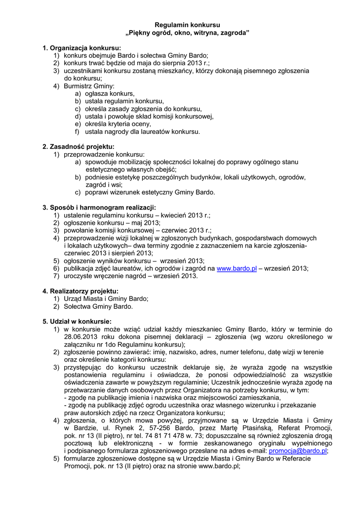 Regulamin konkursu „Piękny ogród, okno, witryna, zagroda” 1. Organizacja konkursu: 1) konkurs obejmuje Bardo i sołectwa Gminy Bardo; 2) konkurs trwać będzie od maja do sierpnia 2013 r.; 3) uczestnikami konkursu zostaną mieszkańcy, którzy dokonają pisemnego zgłoszenia do konkursu; 4) Burmistrz Gminy: a) ogłasza konkurs, b) ustala regulamin konkursu, c) określa zasady zgłoszenia do konkursu, d) ustala i powołuje skład komisji konkursowej, e) określa kryteria oceny, f) ustala nagrody dla laureatów konkursu. 2. Zasadność projektu: 1) przeprowadzenie konkursu: a) spowoduje mobilizację społeczności lokalnej do poprawy ogólnego stanu estetycznego własnych obejść; b) podniesie estetykę poszczególnych budynków, lokali użytkowych, ogrodów, zagród i wsi; c) poprawi wizerunek estetyczny Gminy Bardo. 3. Sposób i harmonogram realizacji: 1) ustalenie regulaminu konkursu – kwiecień 2013 r.; 2) ogłoszenie konkursu – maj 2013; 3) powołanie komisji konkursowej – czerwiec 2013 r.; 4) przeprowadzenie wizji lokalnej w zgłoszonych budynkach, gospodarstwach domowych i lokalach użytkowych– dwa terminy zgodnie z zaznaczeniem na karcie zgłoszeniaczerwiec 2013 i sierpień 2013; 5) ogłoszenie wyników konkursu – wrzesień 2013; 6) publikacja zdjęć laureatów, ich ogrodów i zagród na www.bardo.pl – wrzesień 2013; 7) uroczyste wręczenie nagród – wrzesień 2013. 4. Realizatorzy projektu: 1) Urząd Miasta i Gminy Bardo; 2) Sołectwa Gminy Bardo. 5. Udział w konkursie: 1) w konkursie może wziąć udział każdy mieszkaniec Gminy Bardo, który w terminie do 28.06.2013 roku dokona pisemnej deklaracji – zgłoszenia (wg wzoru określonego w załączniku nr 1do Regulaminu konkursu); 2) zgłoszenie powinno zawierać: imię, nazwisko, adres, numer telefonu, datę wizji w terenie oraz określenie kategorii konkursu: 3) przystępując do konkursu uczestnik deklaruje się, że wyraża zgodę na wszystkie postanowienia regulaminu i oświadcza, że ponosi odpowiedzialność za wszystkie oświadczenia zawarte w powyższym regulaminie; Uczestnik jednocześnie wyraża zgodę na przetwarzanie danych osobowych przez Organizatora na potrzeby konkursu, w tym: - zgodę na publikację imienia i nazwiska oraz miejscowości zamieszkania, - zgodę na publikację zdjęć ogrodu uczestnika oraz własnego wizerunku i przekazanie praw autorskich zdjęć na rzecz Organizatora konkursu; 4) zgłoszenia, o których mowa powyżej, przyjmowane są w Urzędzie Miasta i Gminy w Bardzie, ul. Rynek 2, 57-256 Bardo, przez Martę Ptasińską, Referat Promocji, pok. nr 13 (II piętro), nr tel. 74 81 71 478 w. 73; dopuszczalne są również zgłoszenia drogą pocztową lub elektroniczną - w formie zeskanowanego oryginału wypełnionego i podpisanego formularza zgłoszeniowego przesłane na adres e-mail: [email protected]; 5) formularze zgłoszeniowe dostępne są w Urzędzie Miasta i Gminy Bardo w Referacie Promocji, pok. nr 13 (II piętro) oraz na stronie www.bardo.pl; 6) uczestniczyć można w jednej lub jednocześnie w kilku kategoriach konkursu; 7) zdobycie I miejsca w jednej z kategorii wyklucza udział w konkursie przez okres kolejnych 2 lat; 8) zdobycie II lub III miejsca w każdej z kategorii wyklucza udział w konkursie przez okres 1 roku. 6. Kategorie konkursu: 1) eliminacje odbywać się będą w czterech kategoriach: a) I Kategoria – na najpiękniejszy ogród przydomowy - udział może wziąć ogród przydomowy na terenie Gminy Bardo; b) II Kategoria – na najpiękniej ukwiecone okno lub balkon - udział może wziąć okno lub balkon znajdujące się na terenie Gminy Bardo; c) III Kategoria – na najpiękniej przystrojoną witrynę lub okno wystawowe dla właścicieli sklepów oraz obiektów turystycznych i lokali użytkowych - udział może wziąć witryna lub okno wystawowe znajdujące się na terenie Gminy Bardo; d) IV Kategoria – na najbardziej zadbaną zagrodę wiejską - udział może wziąć zagroda na terenie Gminy Bardo, o obecnych bądź dawnych funkcjach gospodarstwa rolnego (prowadzącego uprawę lub hodowlę), która jest miejscem zamieszkania rodziny oraz pracy przynajmniej jednego z jej członków. 7. Komisja konkursowa: 1) komisję konkursową powołuje Burmistrz Miasta i Gminy Bardo; 2) komisja dokona oceny zgłoszonych ogrodów, okien, balkonów, witryn i zagród (szczegółowe terminy wizytacji uzgodnione zostaną wcześniej z uczestnikami konkursu). 8. Kryteria konkursu: 1) komisja konkursowa dokona oceny zgłoszonych ogrodów, okien, balkonów, okien wystawowych, witryn i zagród wg kryteriów określonych dla każdej kategorii konkursowej; 2) kryteria ocen konkursu stanowią załącznik nr 2 do Regulaminu konkursu; 3) suma przyznanych punktów wyłoni laureatów konkursu w każdej kategorii. 9. Nagrody: 1) w każdej kategorii przyznaje się po trzy nagrody, a w przypadku równej sumy punktów nagrody równorzędne; Organizatorzy przewidują również wyróżnienia i dyplomy; Organizator może zrezygnować z przyznania nagrody w danej kategorii; 2) wysokość środków przeznaczonych na nagrody dla laureatów i osób wyróżnionych będzie ustalona dla każdej kategorii; 3) łączna pula nagród przewidziana na rok 2013 wynosi 3 000 zł; 4) nagrody zostaną wręczone podczas Dożynek Gminnych 2013; 5) laureaci konkursu o terminie i miejscu wręczenia nagród zostaną powiadomieni pisemnie przez Organizatorów. 10. Promocja wyników konkursu: 1) ostateczne wyniki konkursu zostaną podane do publicznej wiadomości poprzez rozesłanie obwieszczeń do sołectw oraz publikację na stronie internetowej Gminy: www.bardo.pl; 11. Postanowienia końcowe: 1) W sprawach spornych dot. konkursu decyduje Komisja Konkursowa. 2) Prawo interpretacji niniejszego Regulaminu należy do Organizatora. Załącznik nr 1 do Regulaminu konkursu „Piękny ogród, okno, witryna, zagroda” ………………………………………………….. (imię i nazwisko zgłaszającego)