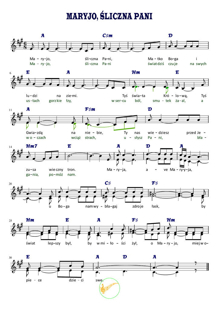 MARYJO, ŚLICZNA PANI A 6 8 Ma Ma ry jo, ry jo, śli czna śli czna E 6 na gorz kie Ma tko świat dziś Tyś w ser cu na Hm7 zu sa ga nia, wie czny po móż 20 E świa ta ból, smu u Ma świat lep szy nam wy A był, pie ce tek ża al, a by w mi ło dzie ci swe. C dziesz ni, przed Je bła D A a ve Ma ry y ja, F♯ bła gaj A wie Pa ry ja, E nas słysz C♯ E Ty u Bo ga Hm A tron. nam. lo wą, Kró Tyś nie bie, strach, i na swych D wciąż 14 Bo ga czu je E F ♯m Gwia zdą w o czach 30 Pa ni, Pa ni zie mi. łzy, A 25 Hm lu dzi us tach D A 11 C ♯m zdro je łask, Hm F♯ ści żył, by o D A Ma ry jo, miej w o