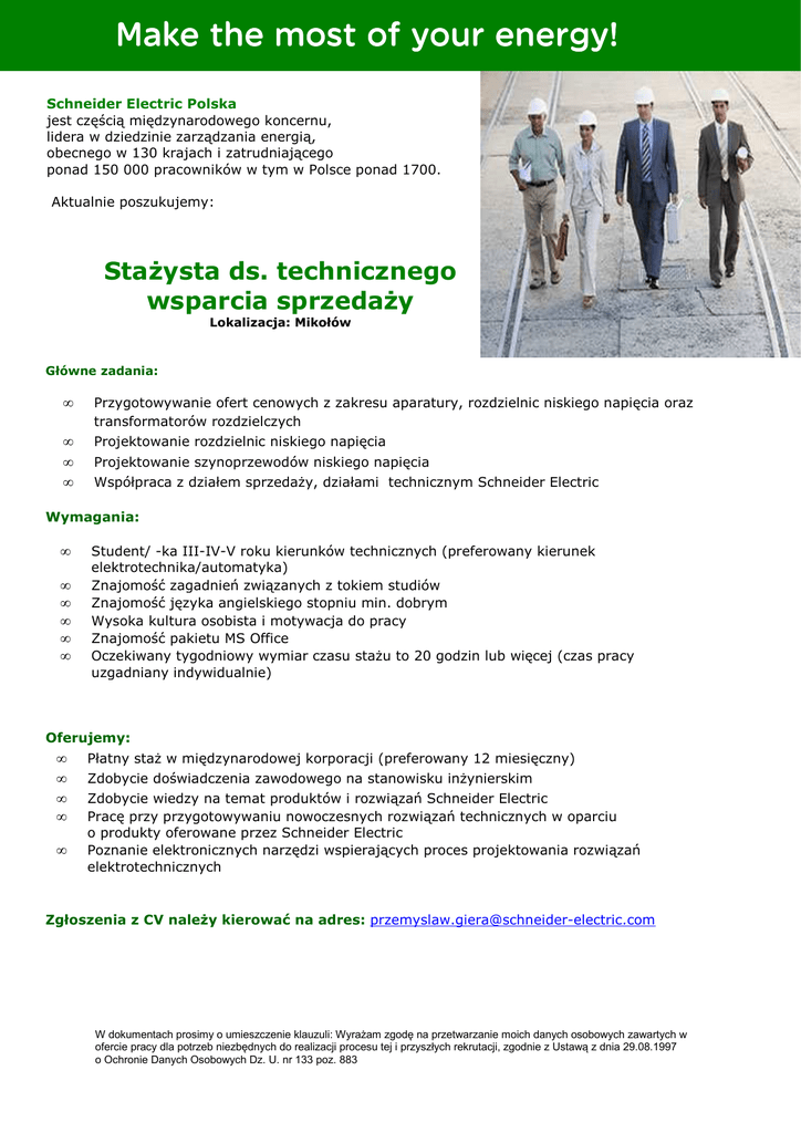 Make the most of your energy! Schneider Electric Polska jest częścią międzynarodowego koncernu, lidera w dziedzinie zarządzania energią, obecnego w 130 krajach i zatrudniającego ponad 150 000 pracowników w tym w Polsce ponad 1700. Aktualnie poszukujemy: Stażysta ds. technicznego wsparcia sprzedaży Lokalizacja: Mikołów Główne zadania: • • • • Przygotowywanie ofert cenowych z zakresu aparatury, rozdzielnic niskiego napięcia oraz transformatorów rozdzielczych Projektowanie rozdzielnic niskiego napięcia Projektowanie szynoprzewodów niskiego napięcia Współpraca z działem sprzedaży, działami technicznym Schneider Electric Wymagania: • • • • • • Student/ -ka III-IV-V roku kierunków technicznych (preferowany kierunek elektrotechnika/automatyka) Znajomość zagadnień związanych z tokiem studiów Znajomość języka angielskiego stopniu min. dobrym Wysoka kultura osobista i motywacja do pracy Znajomość pakietu MS Office Oczekiwany tygodniowy wymiar czasu stażu to 20 godzin lub więcej (czas pracy uzgadniany indywidualnie) Oferujemy: • • • • • • Płatny staż w międzynarodowej korporacji (preferowany 12 miesięczny) Zdobycie doświadczenia zawodowego na stanowisku inżynierskim Zdobycie wiedzy na temat produktów i rozwiązań Schneider Electric Pracę przy przygotowywaniu nowoczesnych rozwiązań technicznych w oparciu o produkty oferowane przez Schneider Electric Poznanie elektronicznych narzędzi wspierających proces projektowania rozwiązań elektrotechnicznych Zgłoszenia z CV należy kierować na adres: [email protected] W dokumentach prosimy o umieszczenie klauzuli: Wyrażam zgodę na przetwarzanie moich danych osobowych zawartych w ofercie pracy dla potrzeb niezbędnych do realizacji procesu tej i przyszłych rekrutacji, zgodnie z Ustawą z dnia 29.08.1997 o Ochronie Danych Osobowych Dz. U. nr 133 poz. 883