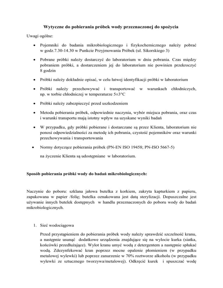 Wytyczne do pobierania próbek wody przeznaczonej do spożycia Uwagi ogólne: Pojemniki do badania mikrobiologicznego i fizykochemicznego należy pobrać w godz.7.30-14.30 w Punkcie Przyjmowania Próbek (ul. Sikorskiego 3) Pobrane próbki należy dostarczyć do laboratorium w dniu pobrania. Czas między pobraniem próbki, a dostarczeniem jej do laboratorium nie powinien przekroczyć 8 godzin Próbki należy dokładnie opisać, w celu łatwej identyfikacji próbki w laboratorium Próbki należy przechowywać i transportować w warunkach chłodniczych, np. w torbie chłodniczej w temperaturze 5±3°C Próbki należy zabezpieczyć przed uszkodzeniem Metoda pobierania próbek, odpowiednie naczynia, wybór miejsca pobrania, oraz czas i warunki transportu mają istotny wpływ na uzyskane wyniki badań W przypadku, gdy próbki pobierane i dostarczane są przez Klienta, laboratorium nie ponosi odpowiedzialności za metodę ich pobrania, czystość pojemników oraz warunki przechowywania i transportowania Normy dotyczące pobierania próbek (PN-EN ISO 19458; PN-ISO 5667-5) na życzenie Klienta są udostępniane w laboratorium. Sposób pobierania próbki wody do badań mikrobiologicznych: Naczynie do poboru: szklana jałowa butelka z korkiem, zakryta kapturkiem z papieru, zapakowana w papier /folię; butelka oznakowana jest datą sterylizacji. Dopuszczalne jest używanie innych butelek dostępnych w handlu przeznaczonych do poboru wody do badań mikrobiologicznych. 1. Sieć wodociągowa Przed przystąpieniem do pobierania próbek wody należy sprawdzić szczelność kranu, a następnie usunąć dodatkowe urządzenia znajdujące się na wylocie kurka (siatka, końcówki przedłużające). Wylot kranu umyć wodą z detergentem a następnie spłukać wodą. Zdezynfekować kran poprzez mocne opalenie płomieniem (w przypadku metalowej wylewki) lub poprzez zanurzenie w 70% roztworze alkoholu (w przypadku wylewki ze sztucznego tworzywa/metalowej). Odkręcić kurek i spuszczać wodę (zimną) przez około 3 minuty lub dłużej do uzyskania stabilnych warunków poboru wody. Butelkę rozpakować z papieru/folii. Przez papierowy kapturek wyjąć korek, wyrzucić pasek papieru włożony między szyjkę butelki, a korek. Podstawić butelkę pod strumień wody i napełnić do objętości ¾ butelki. Napełnione naczynie dokładnie zamknąć korkiem z kapturkiem. Zapakować w papier/folię. Uwaga: Podczas wymienionych czynności należy unikać dotykania palcami bezpośrednio wylotu naczynia oraz korka. 2. Studnie Wodę ze studni kopanej pobrać przy pomocy wiadra przeznaczonego tylko do wody. Napełnić butelkę wodą z zachowaniem wymagań przedstawionych powyżej. Uwaga: Przy nalewaniu nie dotykać butelki brzegiem wiadra. Nie zanurzać butelki w wiadrze w celu pobrania z niego wody. 3. Pobieranie wody z węży gumowych lub tworzywa sztucznego Koniec węża zanurzyć na max 10min. w alkoholu. Potem spuszczać wodę przez okres od 5 do 10 min., a następnie napełnić wodą butelkę. Uwaga: Podczas pobieranie próbki nie dotykać wężem butelki. Sposób pobierania próbki wody do badań fizykochemicznych: Zestaw do poboru: butelki polietylenowe lub szklane W celu zminimalizowania efektu dostania się zawiesin do próbki wody przy gwałtownej zmianie ciśnienia oraz usunięcia wody zastoinowej należy odkręcić kran na maksymalny przepływ na 5-10 sekund, a następnie po zredukowaniu przepływu wody o połowę spuszczać ją przez około 3 minuty wolnym strumieniem, aby woda się nie rozpryskiwała. Butelki, które nie zawierają substancji utrwalającej (oznaczone literą A, B, C, E, F, L) należy przed pobraniem przepłukać wodą pobieraną do badania. Napełnić butelkę wodą pod korek tak, aby w butelce nie zostały pęcherze powietrza i natychmiast zamknąć. Butelki zawierające substancje utrwalające (oznaczone literą D, G, I, J, K), bez wcześniejszego przepłukiwania, napełnić ostrożnie badaną wodą, tak aby zawarta w niej substancja nie wypłynęła na zewnątrz. Po napełnieniu butelkę natychmiast zamykamy. Dopuszcza się również pobranie wody do badania w butelce po wodzie mineralnej niegazowanej. Butelki przed pobraniem należy dobrze wypłukać badaną wodą i następnie napełnić je do pełna, tzn. pod korek.