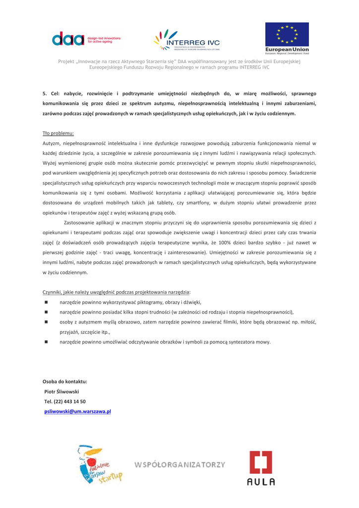 Projekt „Innowacje na rzecz Aktywnego Starzenia się” DAA współfinansowany jest ze środków Unii Europejskiej Eureopejskiego Funduszu Rozwoju Regionalnego w ramach programu INTERREG IVC 5. Cel: nabycie, rozwinięcie i podtrzymanie umiejętności niezbędnych do, w miarę możliwości, sprawnego komunikowania się przez dzieci ze spektrum autyzmu, niepełnosprawnością intelektualną i innymi zaburzeniami, zarówno podczas zajęć prowadzonych w ramach specjalistycznych usług opiekuńczych, jak i w życiu codziennym. Tło problemu: Autyzm, niepełnosprawność intelektualna i inne dysfunkcje rozwojowe powodują zaburzenia funkcjonowania niemal w każdej dziedzinie życia, a szczególnie w zakresie porozumiewania się z innymi ludźmi i nawiązywania relacji społecznych. Wyżej wymienionej grupie osób można skutecznie pomóc przezwyciężyć w pewnym stopniu skutki niepełnosprawności, pod warunkiem uwzględnienia jej specyficznych potrzeb oraz dostosowania do nich zakresu i sposobu pomocy. Świadczenie specjalistycznych usług opiekuńczych przy wsparciu nowoczesnych technologii może w znaczącym stopniu poprawić sposób komunikowania się z tymi osobami. Możliwość korzystania z aplikacji ułatwiającej porozumiewanie się, która będzie dostosowana do urządzeń mobilnych takich jak tablety, czy smartfony, w dużym stopniu ułatwi prowadzenie przez opiekunów i terapeutów zajęć z wyżej wskazaną grupą osób. Zastosowanie aplikacji w znacznym stopniu przyczyni się do usprawnienia sposobu porozumiewania się dzieci z opiekunami i terapeutami podczas zająć oraz spowoduje zwiększenie uwagi i koncentracji dzieci przez cały czas trwania zajęć (z doświadczeń osób prowadzących zajęcia terapeutyczne wynika, że 100% dzieci bardzo szybko - już nawet w pierwszej godzinie zajęć - traci uwagę, koncentrację i zainteresowanie). Umiejętności w zakresie porozumiewania się z innymi ludźmi, nabyte podczas zajęć prowadzonych w ramach specjalistycznych usług opiekuńczych, będą wykorzystywane w życiu codziennym. Czynniki, jakie należy uwzględnić podczas projektowania narzędzia: narzędzie powinno wykorzystywać piktogramy, obrazy i dźwięki, narzędzie powinno posiadać kilka stopni trudności (w zależności od rodzaju i stopnia niepełnosprawności), osoby z autyzmem myślą obrazowo, zatem narzędzie powinno zawierać filmiki, które będą obrazować np. miłość, przyjaźń, szczęście itp., narzędzie powinno umożliwiać odczytywanie obrazków i symboli za pomocą syntezatora mowy. Osoba do kontaktu: Piotr Śliwowski Tel. (22) 443 14 50 [email protected]