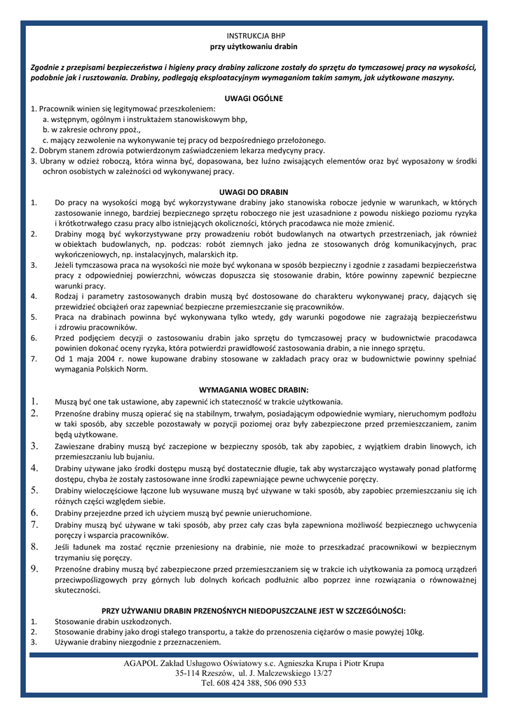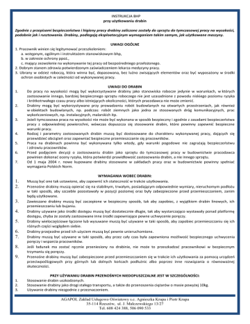 INSTRUKCJA BHP przy użytkowaniu drabin Zgodnie z przepisami bezpieczeństwa i higieny pracy drabiny zaliczone zostały do sprzętu do tymczasowej pracy na wysokości, podobnie jak i rusztowania. Drabiny, podlegają eksploatacyjnym wymaganiom takim samym, jak użytkowane maszyny. UWAGI OGÓLNE 1. Pracownik winien się legitymować przeszkoleniem: a. wstępnym, ogólnym i instruktażem stanowiskowym bhp, b. w zakresie ochrony ppoż., c. mający zezwolenie na wykonywanie tej pracy od bezpośredniego przełożonego. 2. Dobrym stanem zdrowia potwierdzonym zaświadczeniem lekarza medycyny pracy. 3. Ubrany w odzież roboczą, która winna być, dopasowana, bez luźno zwisających elementów oraz być wyposażony w środki ochron osobistych w zależności od wykonywanej pracy. 1. 2. 3. 4. 5. 6. 7. 1. 2. 3. 4. 5. 6. 7. 8. 9. 1. 2. 3. UWAGI DO DRABIN Do pracy na wysokości mogą być wykorzystywane drabiny jako stanowiska robocze jedynie w warunkach, w których zastosowanie innego, bardziej bezpiecznego sprzętu roboczego nie jest uzasadnione z powodu niskiego poziomu ryzyka i krótkotrwałego czasu pracy albo istniejących okoliczności, których pracodawca nie może zmienić. Drabiny mogą być wykorzystywane przy prowadzeniu robót budowlanych na otwartych przestrzeniach, jak również w obiektach budowlanych, np. podczas: robót ziemnych jako jedna ze stosowanych dróg komunikacyjnych, prac wykończeniowych, np. instalacyjnych, malarskich itp. Jeżeli tymczasowa praca na wysokości nie może być wykonana w sposób bezpieczny i zgodnie z zasadami bezpieczeństwa pracy z odpowiedniej powierzchni, wówczas dopuszcza się stosowanie drabin, które powinny zapewnić bezpieczne warunki pracy. Rodzaj i parametry zastosowanych drabin muszą być dostosowane do charakteru wykonywanej pracy, dających się przewidzieć obciążeń oraz zapewniać bezpieczne przemieszczanie się pracowników. Praca na drabinach powinna być wykonywana tylko wtedy, gdy warunki pogodowe nie zagrażają bezpieczeństwu i zdrowiu pracowników. Przed podjęciem decyzji o zastosowaniu drabin jako sprzętu do tymczasowej pracy w budownictwie pracodawca powinien dokonać oceny ryzyka, która potwierdzi prawidłowość zastosowania drabin, a nie innego sprzętu. Od 1 maja 2004 r. nowe kupowane drabiny stosowane w zakładach pracy oraz w budownictwie powinny spełniać wymagania Polskich Norm. WYMAGANIA WOBEC DRABIN: Muszą być one tak ustawione, aby zapewnić ich stateczność w trakcie użytkowania. Przenośne drabiny muszą opierać się na stabilnym, trwałym, posiadającym odpowiednie wymiary, nieruchomym podłożu w taki sposób, aby szczeble pozostawały w pozycji poziomej oraz były zabezpieczone przed przemieszczaniem, zanim będą użytkowane. Zawieszane drabiny muszą być zaczepione w bezpieczny sposób, tak aby zapobiec, z wyjątkiem drabin linowych, ich przemieszczaniu lub bujaniu. Drabiny używane jako środki dostępu muszą być dostatecznie długie, tak aby wystarczająco wystawały ponad platformę dostępu, chyba że zostały zastosowane inne środki zapewniające pewne uchwycenie poręczy. Drabiny wieloczęściowe łączone lub wysuwane muszą być używane w taki sposób, aby zapobiec przemieszczaniu się ich różnych części względem siebie. Drabiny przejezdne przed ich użyciem muszą być pewnie unieruchomione. Drabiny muszą być używane w taki sposób, aby przez cały czas była zapewniona możliwość bezpiecznego uchwycenia poręczy i wsparcia pracowników. Jeśli ładunek ma zostać ręcznie przeniesiony na drabinie, nie może to przeszkadzać pracownikowi w bezpiecznym trzymaniu się poręczy. Przenośne drabiny muszą być zabezpieczone przed przemieszczaniem się w trakcie ich użytkowania za pomocą urządzeń przeciwpoślizgowych przy górnych lub dolnych końcach podłużnic albo poprzez inne rozwiązania o równoważnej skuteczności. PRZY UŻYWANIU DRABIN PRZENOŚNYCH NIEDOPUSZCZALNE JEST W SZCZEGÓLNOŚCI: Stosowanie drabin uszkodzonych. Stosowanie drabiny jako drogi stałego transportu, a także do przenoszenia ciężarów o masie powyżej 10kg. Używanie drabiny niezgodnie z przeznaczeniem. AGAPOL Zakład Usługowo Oświatowy s.c. Agnieszka Krupa i Piotr Krupa 35-114 Rzeszów, ul. J. Malczewskiego 13/27 Tel. 608 424 388, 506 090 533 4. 5. 6. 7. 8. 9. 10. 1. 2. 3. 4. 5. 6. 7. 1. 2. 3. 4. 5. Używanie drabiny rozstawnej jako przystawnej. Ustawianie drabiny na niestabilnym podłożu. Opieranie drabiny przystawnej o śliskie płaszczyzny, o obiekty lekkie lub wywrotne albo o stosy materiałów niezapewniające stabilności drabiny. Stawianie drabiny przed zamkniętymi drzwiami, jeżeli nie są one zamknięte na klucz od strony ustawianej drabiny. Ustawianie drabin w bezpośrednim sąsiedztwie maszyn i innych urządzeń – w sposób stwarzający zagrożenia dla pracowników używających drabiny. Wchodzenie i schodzenie z drabiny plecami do niej. Przenoszenie drabiny o długości powyżej 4m przez jedną osobę. ZASADY UŻYTKOWANIA DRABIN Drabiny przystawne powinny wystawać ponad powierzchnię, na którą prowadzą, co najmniej 0,75m, a kąt ich nachylenia powinien wynosić od 65° do 75°. Nigdy nie używaj drabiny drewnianej sporządzonej we własnym zakresie z rozciętych na pół żerdzi, tego typu surowiec, to mało wytrzymałe i łamliwe drewno. Nie posługuj się drabiną drewnianą ze szczeblami przybitymi do podłużnic, szczeble muszą być wpuszczane w otwory wycięte w podłużnicach – w odstępach około 30cm. Nie maluj drabin drewnianych farbą kryjącą, farba taka niepotrzebnie osłania ewentualne uszkodzenia drabiny, które mogą okazać się niebezpieczne przy użytkowaniu. Oba segmenty drabiny rozstawnej powinny być zabezpieczone przed rozsunięciem łańcuchem lub w inny trwały sposób. Wchodź lub schodź po drabinie twarzą do szczebli, nigdy tyłem. Przy pracy na wysokości, np. w trakcie robót dekarskich trzeba stosować dodatkowy sprzęt chroniący przed up