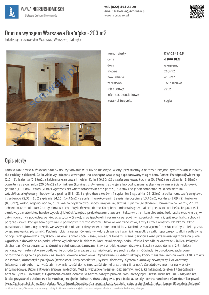 tel. (022) 404 21 20 email: [email protected] www: scn.waw.pl Dom na wynajem Warszawa Białołęka - 203 m2 Lokalizacja: mazowieckie, Warszawa, Warszawa, Białołęka numer oferty DW-2545-16 cena 4 900 PLN dom wynajem, metraż 203 m2 pow. działki 495 m2 zabudowa 1/2 bliźniaka rok budowy 2006 informacje dodatkowe materiał budynku cegła Opis oferty Dom w zabudowie bliźniaczej oddany do użytkowania w 2006 na Białołęce. Widny, przestronny o bardzo funkcjonalnym rozkładzie idealny dla rodziny z dziećmi. Całkowicie wykończony wewnątrz i na zewnątrz wraz z zagospodarowanym ogrodem. Parter: Przedpokój/wiatrołap (2,5m2), łazienka (2,99m2; z kabiną prysznicową i meblami), hall (6,30m2) z szafą wnękowa, kuchnia (6. 87m2) ze spiżarnią (1,98m2) otwarta na salon, salon (26,34m2) z kominkiem (kominek z otwieraną tradycyjnie lub podnoszoną szyba - wsuwana w ścianę do góry), gabinet (10,13m2), taras (20m2) wyłożony drewnem tarasowym oraz garaż (16,83m2) na jeden samochód ze schowkiem na wózek/kosiarkę/rowery i kotłownia z pralnią (5,8m2). I piętro (bez skosów): 4 sypialnie: 1 sypialnia -13. 23m2- z balkonem, szafą wnękową i garderobą (2,32m2), 2 sypialnie 14,15 i 14,42m2 - z szafami wnękowymi i 1 sypialnia gościnna 13,40m2, korytarz (9,69m2), łazienka (8,33m2), widna, rogowa wanna, duża kabina prysznicowa, sedes, umywalka, szafki). II piętro (ze skosami): bawialnia ok. 40m2, 2 duże schowki (razem ok. 10m2), trzy okna w dachu. Wykończenie domu: Kompletne, minimalistyczne ale ciepłe, w tonacji beżu, brązu, kości słoniowej, z materiałów bardzo wysokiej jakości. Wnętrze projektowane przez architekta wnętrz - konsekwentna kolorystka oraz wystrój w całym domu. Na podłodze: parkiet egzotyczny (iroko), gres (pastorelli i ceramika paradyż) w łazienkach, kuchni, spiżarce, hallu; schody i poręcze - iroko. Pod gresem ogrzewanie podłogowe z termostatami. Drzwi wewnętrzne iroko, firmy Entra z włoskimi klamkami. Okna plastikowe, kolor: zloty orzech, we wszystkich oknach rolety wewnętrzne i moskitiery. Kuchnia ze sprzętem firmy Bosch (płyta elektryczna, okap, zmywarka, piekarnik). Kuchnia robiona na zamówienie (w kolorach wenge i wanilia), wszystkie szafki typu cargo, szafki i szuflady na odbojnikach gazowych i łożyskach. Łazienki: sprzęt Roca, Ravak, armatura Bonetti. Brama garażowa oraz przesuwna wjazdowa na pilota. Ogrodzenie drewniane na podmurówce wykończone klinkierem. Dom otynkowany, podmurówka i schodki zewnętrzne klinkier. Pokrycie dachu: dachówka ceramiczna. Ogród w pełni zagospodarowany, trawa z rolki, krzewy i drzewka, kostka (przed domem 2-3 miejsca parkingowe), automatyczne podlewanie ogrodu (zraszacze oraz linie kroplujące pod rabatami). Oświetlenie ogrodowe, zadaszone i ogrodzone miejsce na pojemnik na śmieci i drewno kominkowe. Ogrzewanie CO jednofunkcyjny kocioł z zasobnikiem na wode (120 l) marki Viessmann, automatyka pokojowa (termostat). Bezpieczeństwo / system alarmowy: System alarmowy zewnętrzny i wewnętrzny (niezależne obiegi), możliwość alarmowania części domu (np. części dolnej oraz piętra II na noc). Całodobowy monitoring + piloty antynapadowe. Drzwi antywłamaniowe. Wideofon. Media: wszystkie miejskie (gaz ziemny, woda, kanalizacja), telefon TP (neostrada), antena Cyfra+. Lokalizacja: Ogrodzone osiedle domów, w bardzo dobrym punkcie komunikacyjnym (Trasa Toruńska i ul. Radzymińska) Blisko przystanki autobusowe komunikacji miejskiej, infrastruktura usługowa, przedszkola, szkoły, centra handlowe (Carrefour Targówek, Ikea, Centrum M1,aby kino, Domoteka, Piotr i Paweł, kościół, (Park Smaku), basenje (Pływalnia Polonez), Zawsze dążymy do tego, informacje o proponowanych przez nasDecathlon), ofertach były jakstadnina najbardziej koni, dokładne. Niekiedyrestauracje jednak, ze względu na fakt, iż uzyskujemy od osób trzecich nie jest możliwe ich zweryfikowanie, wobec czego należy traktować je orientacyjnie i nie stanowią one oferty w rozumieniu kodeksu cywilnego. tel. (022) 404 21 20 email: [email protected] www: scn.waw.pl siłownia (Fitstation). Kwota wynajmu 4900 zł/msc, dodatkowo płatne opłaty licznikowe, gaz, prąd, woda, ochrona. Kaucja 1 miesięczna. Wynajem na minimum 1 rok, dla rodziny lub pod nieuciążliwą działalność gospodarczą. Zapraszam do oglądania Pośrednik prowadzący Piotr Szczypski, nr licencji 15099 Lokalizacja Osoba kontaktowa Ireneusz Ciepiela województwo mazowieckie powiat Warszawa [email protected] miasto Warszawa dzielnica Białołęka Chętnie udzielę dodatkowych informacji związanych z tą ofertą. Zapraszam do kontaktu! tel. 512206701 Zawsze dążymy do tego, aby informacje o proponowanych przez nas ofertach były jak najbardziej dokładne. Niekiedy jednak, ze względu na fakt, iż uzyskujemy je od osób trzecich nie jest możliwe ich zweryfikowanie, wobec czego należy traktować je orientacyjnie i nie stanowią one oferty w rozumieniu kodeksu cywilnego.