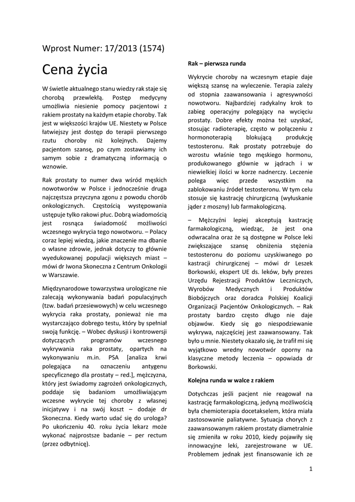 Wprost Numer: 17/2013 (1574) Cena życia W świetle aktualnego stanu wiedzy rak staje się chorobą przewlekłą. Postęp medycyny umożliwia niesienie pomocy pacjentowi z rakiem prostaty na każdym etapie choroby. Tak jest w większości krajów UE. Niestety w Polsce łatwiejszy jest dostęp do terapii pierwszego rzutu choroby niż kolejnych. Dajemy pacjentom szansę, po czym zostawiamy ich samym sobie z dramatyczną informacją o wznowie. Rak prostaty to numer dwa wśród męskich nowotworów w Polsce i jednocześnie druga najczęstsza przyczyna zgonu z powodu chorób onkologicznych. Częstością występowania ustępuje tylko rakowi płuc. Dobrą wiadomością jest rosnąca świadomość możliwości wczesnego wykrycia tego nowotworu. – Polacy coraz lepiej wiedzą, jakie znaczenie ma dbanie o własne zdrowie, jednak dotyczy to głównie wyedukowanej populacji większych miast – mówi dr Iwona Skoneczna z Centrum Onkologii w Warszawie. Międzynarodowe towarzystwa urologiczne nie zalecają wykonywania badań populacyjnych (tzw. badań przesiewowych) w celu wczesnego wykrycia raka prostaty, ponieważ nie ma wystarczająco dobrego testu, który by spełniał swoją funkcję. – Wobec dyskusji i kontrowersji dotyczących programów wczesnego wykrywania raka prostaty, opartych na wykonywaniu m.in. PSA [analiza krwi polegająca na oznaczeniu antygenu specyficznego dla prostaty – red.], mężczyzna, który jest świadomy zagrożeń onkologicznych, poddaje się badaniom umożliwiającym wczesne wykrycie tej choroby z własnej inicjatywy i na swój koszt – dodaje dr Skoneczna. Kiedy warto udać się do urologa? Po ukończeniu 40. roku życia lekarz może wykonać najprostsze badanie – per rectum (przez odbytnicę). Rak – pierwsza runda Wykrycie choroby na wczesnym etapie daje większą szansę na wyleczenie. Terapia zależy od stopnia zaawansowania i agresywności nowotworu. Najbardziej radykalny krok to zabieg operacyjny polegający na wycięciu prostaty. Dobre efekty można też uzyskać, stosując radioterapię, często w połączeniu z hormonoterapią blokującą produkcję testosteronu. Rak prostaty potrzebuje do wzrostu właśnie tego męskiego hormonu, produkowanego głównie w jądrach i w niewielkiej ilości w korze nadnerczy. Leczenie polega więc przede wszystkim na zablokowaniu źródeł testosteronu. W tym celu stosuje się kastrację chirurgiczną (wyłuskanie jąder z moszny) lub farmakologiczną. – Mężczyźni lepiej akceptują kastrację farmakologiczną, wiedząc, że jest ona odwracalna oraz że są dostępne w Polsce leki zwiększające szansę obniżenia stężenia testosteronu do poziomu uzyskiwanego po kastracji chirurgicznej – mówi dr Leszek Borkowski, ekspert UE ds. leków, były prezes Urzędu Rejestracji Produktów Leczniczych, Wyrobów Medycznych i Produktów Biobójczych oraz doradca Polskiej Koalicji Organizacji Pacjentów Onkologicznych. – Rak prostaty bardzo często długo nie daje objawów. Kiedy się go niespodziewanie wykrywa, najczęściej jest zaawansowany. Tak było u mnie. Niestety okazało się, że trafił mi się wyjątkowo wredny nowotwór oporny na klasyczne metody leczenia – opowiada dr Borkowski. Kolejna runda w walce z rakiem Dotychczas jeśli pacjent nie reagował na kastrację farmakologiczną, jedyną możliwością była chemioterapia docetakselem, która miała zastosowanie paliatywne. Sytuacja chorych z zaawansowanym rakiem prostaty diametralnie się zmieniła w roku 2010, kiedy pojawiły się innowacyjne leki, zarejestrowane w UE. Problemem jednak jest finansowanie ich ze 1 środków publicznych. W Polsce w ramach terapii niestandardowej dostępny jest abirateron, który w przeciwieństwie do innych leków zmniejszających wytwarzanie testosteronu wyłącznie w jądrach hamuje ten proces również w nadnerczach i tkance nowotworowej. – Lek przede wszystkim wydłuża czas przeżycia oraz zmniejsza silny i trudny do wygaszenia ból w kościach, uniemożliwiający normalne funkcjonowanie. I co bardzo ważne dla pacjentów – jest lekiem doustnym – mówi dr Borkowski. – Jako farmakolog z 42-letnim doświadczeniem wysoko oceniam wyjątkowy mechanizm działania leku, a jako pacjent dodam, że diametralnie poprawia jakość życia. Nade wszystko zaś daje mi on szansę na jego wydłużenie. Dla mnie rok to bardzo dużo. Jako pacjent onkologiczny mam inną perspektywę – podsumowuje dr Borkowski. Abirateron jest refundowany w większości krajów UE, ale nie w Polsce. – Nie jesteśmy krajem najbogatszym, ale nie oznacza to, że nie można informować ludzi, że skuteczny lek istnieje, i ograniczać dostęp do niego – uważa dr Borkowski. – W bogatych krajach również racjonalizuje się wydatki i właśnie dlatego na świecie leczenie zmierza w kierunku medycyny spersonalizowanej. Dwóch chorych w tym samym wieku, z nowotworem tego samego narządu często musi być leczonych odmiennie. Zdaniem dr. Borkowskiego wyselekcjonowanie grup pacjentów do leczenia określonymi lekami zwiększy ich skuteczność i ograniczy marnotrawstwo i tak skromnych funduszy. – Z tego też powodu lekarz powinien mieć do wyboru kilka leków, a nie jeden – mówi. Kolejną nadzieją dla chorych z opornym na kastrację rakiem gruczołu krokowego już wkrótce może być enzalutamid. To lek o innym mechanizmie działania, dający szansę na przedłużenie życia pacjentów po chemioterapii. Dodatkową zaletą enzalutamidu jest brak konieczności stosowania jednocześnie leków sterydowych. Enzalutamid jest dostępny dla pacjentów w USA, w Europie jego rejestracja jest przewidywana na sierpień 2013. – Dla lekarzy bardzo ważna jest każda informacja o pojawianiu się nowych preparatów mogących stanowić alternatywę dla istniejących już terapii zaawansowanego nowotworu. Szczególnie gdy lek hamuje wzrost komórek raka oraz ma zdolność do indukowania śmierci komórek nowotworowych – mówi dr Leszek Borkowski. Dostępność 