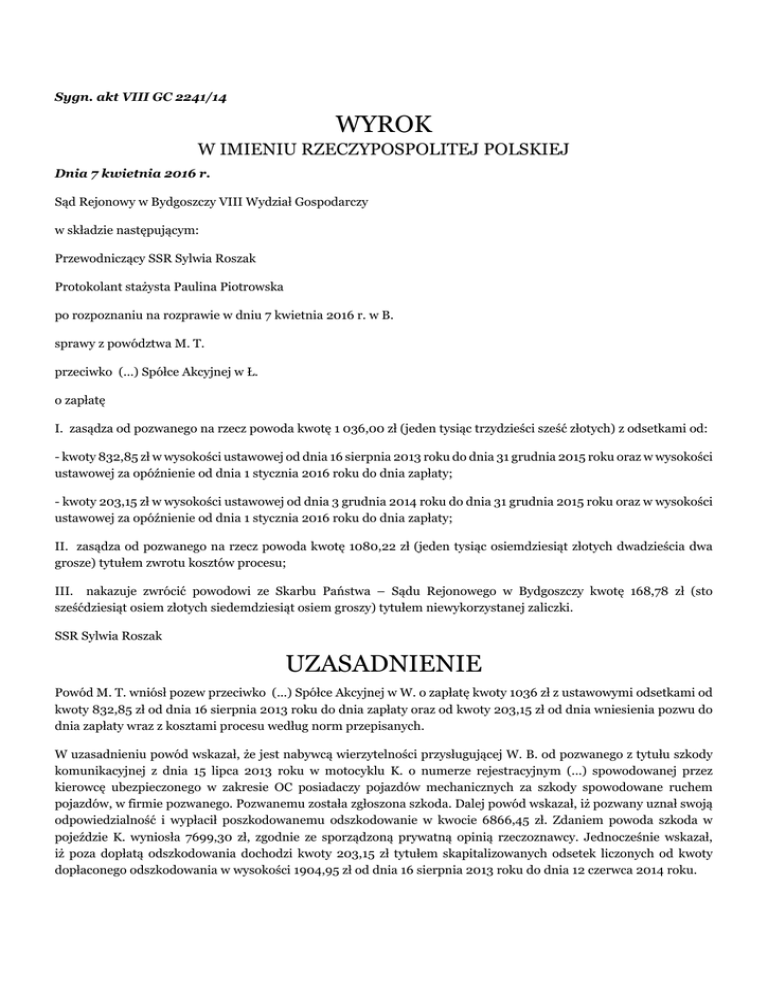 Sygn. akt VIII GC 2241/14 WYROK W IMIENIU RZECZYPOSPOLITEJ POLSKIEJ Dnia 7 kwietnia 2016 r. Sąd Rejonowy w Bydgoszczy VIII Wydział Gospodarczy w składzie następującym: Przewodniczący SSR Sylwia Roszak Protokolant stażysta Paulina Piotrowska po rozpoznaniu na rozprawie w dniu 7 kwietnia 2016 r. w B. sprawy z powództwa M. T. przeciwko (...) Spółce Akcyjnej w Ł. o zapłatę I. zasądza od pozwanego na rzecz powoda kwotę 1 036,00 zł (jeden tysiąc trzydzieści sześć złotych) z odsetkami od: - kwoty 832,85 zł w wysokości ustawowej od dnia 16 sierpnia 2013 roku do dnia 31 grudnia 2015 roku oraz w wysokości ustawowej za opóźnienie od dnia 1 stycznia 2016 roku do dnia zapłaty; - kwoty 203,15 zł w wysokości ustawowej od dnia 3 grudnia 2014 roku do dnia 31 grudnia 2015 roku oraz w wysokości ustawowej za opóźnienie od dnia 1 stycznia 2016 roku do dnia zapłaty; II. zasądza od pozwanego na rzecz powoda kwotę 1080,22 zł (jeden tysiąc osiemdziesiąt złotych dwadzieścia dwa grosze) tytułem zwrotu kosztów procesu; III. nakazuje zwrócić powodowi ze Skarbu Państwa – Sądu Rejonowego w Bydgoszczy kwotę 168,78 zł (sto sześćdziesiąt osiem złotych siedemdziesiąt osiem groszy) tytułem niewykorzystanej zaliczki. SSR Sylwia Roszak UZASADNIENIE Powód M. T. wniósł pozew przeciwko (...) Spółce Akcyjnej w W. o zapłatę kwoty 1036 zł z ustawowymi odsetkami od kwoty 832,85 zł od dnia 16 sierpnia 2013 roku do dnia zapłaty oraz od kwoty 203,15 zł od dnia wniesienia pozwu do dnia zapłaty wraz z kosztami procesu według norm przepisanych. W uzasadnieniu powód wskazał, że jest nabywcą wierzytelności przysługującej W. B. od pozwanego z tytułu szkody komunikacyjnej z dnia 15 lipca 2013 roku w motocyklu K. o numerze rejestracyjnym (...) spowodowanej przez kierowcę ubezpieczonego w zakresie OC posiadaczy pojazdów mechanicznych za szkody spowodowane ruchem pojazdów, w firmie pozwanego. Pozwanemu została zgłoszona szkoda. Dalej powód wskazał, iż pozwany uznał swoją odpowiedzialność i wypłacił poszkodowanemu odszkodowanie w kwocie 6866,45 zł. Zdaniem powoda szkoda w pojeździe K. wyniosła 7699,30 zł, zgodnie ze sporządzoną prywatną opinią rzeczoznawcy. Jednocześnie wskazał, iż poza dopłatą odszkodowania dochodzi kwoty 203,15 zł tytułem skapitalizowanych odsetek liczonych od kwoty dopłaconego odszkodowania w wysokości 1904,95 zł od dnia 16 sierpnia 2013 roku do dnia 12 czerwca 2014 roku. Pozwany w odpowiedzi na pozew wniósł o oddalenie powództwa oraz o zasądzenie kosztów wg norm przepisanych. W uzasadnieniu wskazał, iż postępowanie likwidacyjne zostało przeprowadzone prawidłowo, a wypłacone odszkodowanie w całości rekompensuje szkodę w pojeździe poniesioną przez poszkodowanego. Sąd ustalił, co następuje: W dniu 15 lipca 2013 r. pojazd K. o numerze rejestracyjnym (...) należący do W. B. został uszkodzony przez pojazd będący ubezpieczony przez pozwanego w zakresie odpowiedzialności cywilnej. okoliczności bezsporne Poszkodowany zgłosiła szkodę pozwanemu w dniu 16 lipca 2013 roku. okoliczność bezsporna Ostatecznie pozwany uznał swoją odpowiedzialność i tytułem odszkodowania za uszkodzony pojazd wypłacił poszkodowanemu kwotę 4961,50 zł . okoliczność bezsporna W dniu 19 marca 2014 roku powód zawarł z poszkodowanym W. B. umowę sprzedaży wierzytelności przysługującej mu względem pozwanego z tytułu odszkodowania za szkodę powstałą w wyniku zdarzenia z dnia 15 lipca 2013 roku. Dowód: umowa sprzedaży wierzytelności – k. 8 -11 akt. Pismem z dnia 19 marca 2014 roku poszkodowany W. B. poinformowała pozwanego o sprzedaży swojej wierzytelności względem niego z tytułu szkody komunikacyjnej z dnia 15 lipca 2013 roku na rzecz powoda. Dowód: pismo z dnia 19 .03.2013 r. - k. 12 akt Powód wzywał pozwanego do zapłaty reszty odszkodowania. W wyniku wezwania pozwany w dniu 12 czerwca 2014 roku dopłacił powodowi odszkodowanie z tytułu szkody w wysokości 1904,95 zł Dowód: wezwanie do zapłaty z dnia 9.05.2013 r. – k. 14 akt, potwierdzenie odbioru – k. 15 akt, decyzja o wypłacie odszkodowania – k. 27-28 akt, przelew – k. 30 akt. Wysokość koniecznych kosztów naprawy motocykla K. o numerze rejestracyjnym (...) niezbędnych do przywrócenia go do stanu sprzed zdarzenia z dnia 15 lipca 2013 roku wyniosła kwotę 7862,91 zł brutto. Dowód: pisemna opinia biegłego sądowego S. G. z dnia 1 lutego 2015 r. - k. 96-107 akt. Sąd zważył, co następuje: Powyższy stan faktyczny Sąd ustalił w oparciu o przedłożone przez strony dokumenty i pisemną opinię biegłego sądowego S. G.. Należy zaznaczyć, iż ustalając wysokość szkody w samochodzie powoda Sąd kierował się pisemną opinią biegłego sądowego S. G.. Opinię biegłego Sąd uznał za zupełną, jasną i rzeczową. Została sporządzona zgodnie ze wszystkimi wymogami przewidzianymi dla tego typu dokumentów oraz w sposób jasny i precyzyjny odpowiadała na zadane pytania. Opinia biegłego nie została zakwestionowana przez strony. Powództwo zasługiwało na uwzględnienie w całości. Poza sporem w sprawie pozostawał fakt odpowiedzialności pozwanego za szkodę w powstałą w dniu 15 lipca 2013 r. Pozwany uznał roszczenie poszkodowanego W. B. co do zasady. Nie była kwestionowana bowiem wina sprawcy szkody, który był ubezpieczony u pozwanego. Pozwany kwestionował jedynie wysokość szkody. Zgodnie natomiast z art. 509 § 1 i 2 k.c. wierzyciel może bez zgody dłużnika przenieść wierzytelność na osobę trzecią (przelew), chyba że sprzeciwiałoby się to ustawie, zastrzeżeniu umownemu albo właściwości zobowiązania. Wraz z wierzytelnością przechodzą na nabywcę wszelkie związane z nią prawa, w szczególności roszczenie o zaległe odsetki. Cechą charakterystyczną przelewu jest nie wymaganie w zasadzie do jego dojścia do skutku zgody dłużnika. Istotne jest to, że zmiana osoby wierzyciela w wyn