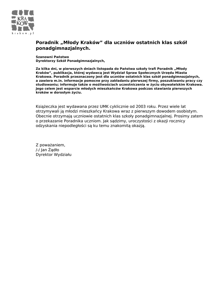 Poradnik „Młody Kraków” dla uczniów ostatnich klas szkół ponadgimnazjalnych. Szanowni Państwo Dyrektorzy Szkół Ponadgimnazjalnych, Za kilka dni, w pierwszych dniach listopada do Państwa szkoły trafi Poradnik „Młody Kraków”, publikacja, której wydawcą jest Wydział Spraw Społecznych Urzędu Miasta Krakowa. Poradnik przeznaczony jest dla uczniów ostatnich klas szkół ponadgimnazjalnych, a zawiera m.in. informacje pomocne przy zakładaniu pierwszej firmy, poszukiwaniu pracy czy studiowaniu; informuje także o możliwościach uczestniczenia w życiu obywatelskim Krakowa. Jego celem jest wsparcie młodych mieszkańców Krakowa podczas stawiania pierwszych kroków w dorosłym życiu. Książeczka jest wydawana przez UMK cyklicznie od 2003 roku. Przez wiele lat otrzymywali ją młodzi mieszkańcy Krakowa wraz z pierwszym dowodem osobistym. Obecnie otrzymają uczniowie ostatnich klas szkoły ponadgimnazjalnej. Prosimy zatem o przekazanie Poradnika uczniom. Jak sądzimy, uroczystości z okazji rocznicy odzyskania niepodległości są ku temu znakomitą okazją. Z poważaniem, /-/ Jan Żądło Dyrektor Wydziału Powered by TCPDF (www.tcpdf.org)