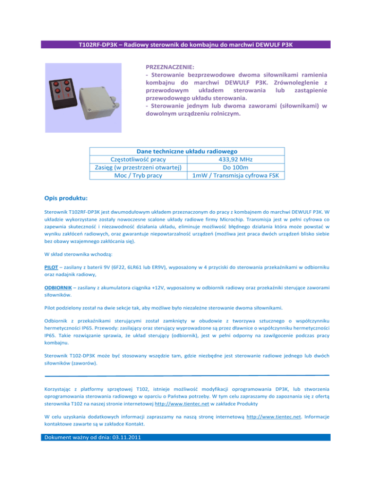 T102RF-DP3K – Radiowy sterownik do kombajnu do marchwi DEWULF P3K PRZEZNACZENIE: - Sterowanie bezprzewodowe dwoma siłownikami ramienia kombajnu do marchwi DEWULF P3K. Zrównoleglenie z przewodowym układem sterowania lub zastąpienie przewodowego układu sterowania. - Sterowanie jednym lub dwoma zaworami (siłownikami) w dowolnym urządzeniu rolniczym. Dane techniczne układu radiowego Częstotliwość pracy 433,92 MHz Zasięg (w przestrzeni otwartej) Do 100m Moc / Tryb pracy 1mW / Transmisja cyfrowa FSK Opis produktu: Sterownik T102RF-DP3K jest dwumodułowym układem przeznaczonym do pracy z kombajnem do marchwi DEWULF P3K. W układzie wykorzystane zostały nowoczesne scalone układy radiowe firmy Microchip. Transmisja jest w pełni cyfrowa co zapewnia skuteczność i niezawodność działania układu, eliminuje możliwość błędnego działania która może powstać w wyniku zakłóceń radiowych, oraz gwarantuje niepowtarzalność urządzeń (możliwa jest praca dwóch urządzeń blisko siebie bez obawy wzajemnego zakłócania się). W skład sterownika wchodzą: PILOT – zasilany z baterii 9V (6F22, 6LR61 lub ER9V), wyposażony w 4 przyciski do sterowania przekaźnikami w odbiorniku oraz nadajnik radiowy, ODBIORNIK – zasilany z akumulatora ciągnika +12V, wyposażony w odbiornik radiowy oraz przekaźniki sterujące zaworami siłowników. Pilot podzielony został na dwie sekcje tak, aby możliwe było niezależne sterowanie dwoma siłownikami. Odbiornik z przekaźnikami sterującymi został zamknięty w obudowie z tworzywa sztucznego o współczynniku hermetyczności IP65. Przewody: zasilający oraz sterujący wyprowadzone są przez dławnice o współczynniku hermetyczności IP65. Takie rozwiązanie sprawia, że układ sterujący (odbiornik), jest w pełni odporny na zawilgocenie podczas pracy kombajnu. Sterownik T102-DP3K może być stosowany wszędzie tam, gdzie niezbędne jest sterowanie radiowe jednego lub dwóch siłowników (zaworów). Korzystając z platformy sprzętowej T102, istnieje możliwość modyfikacji oprogramowania DP3K, lub stworzenia oprogramowania sterowania radiowego w oparciu o Państwa potrzeby. W tym celu zapraszamy do zapoznania się z ofertą sterownika T102 na naszej stronie internetowej http://www.tientec.net w zakładce Produkty W celu uzyskania dodatkowych informacji zapraszamy na naszą stronę internetową http://www.tientec.net. Informacje kontaktowe zawarte są w zakładce Kontakt. Dokument ważny od dnia: 03.11.2011