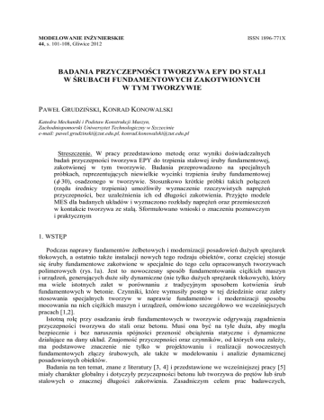 MODELOWANIE INŻYNIERSKIE 44, s. 101-108, Gliwice 2012 ISSN 1896-771X BADANIA PRZYCZEPNOŚCI TWORZYWA EPY DO STALI W ŚRUBACH FUNDAMENTOWYCH ZAKOTWIONYCH W TYM TWORZYWIE PAWEŁ GRUDZIŃSKI, KONRAD KONOWALSKI Katedra Mechaniki i Podstaw Konstrukcji Maszyn, Zachodniopomorski Uniwersytet Technologiczny w Szczecinie e-mail: [email protected], [email protected] Streszczenie. W pracy przedstawiono metodę oraz wyniki doświadczalnych badań przyczepności tworzywa EPY do trzpienia stalowej śruby fundamentowej, zakotwionej w tym tworzywie. Badania przeprowadzono na specjalnych próbkach, reprezentujących niewielkie wycinki trzpienia śruby fundamentowej ( 30), osadzonego w tworzywie. Stosunkowo krótkie próbki takich połączeń (rzędu średnicy trzpienia) umożliwiły wyznaczenie rzeczywistych naprężeń przyczepności, bez uzależnienia ich od długości zakotwienia. Przyjęto modele MES dla badanych układów i wyznaczono rozkłady naprężeń oraz przemieszczeń w kontakcie tworzywa ze stalą. Sformułowano wnioski o znaczeniu poznawczym i praktycznym 1. WSTĘP Podczas naprawy fundamentów żelbetowych i modernizacji posadowień dużych sprężarek tłokowych, a ostatnio także instalacji nowych tego rodzaju obiektów, coraz częściej stosuje się śruby fundamentowe zakotwione w specjalnie do tego celu opracowanych tworzywach polimerowych (rys. 1a). Jest to nowoczesny sposób fundamentowania ciężkich maszyn i urządzeń, generujących duże siły dynamiczne (nie tylko dużych sprężarek tłokowych), który ma wiele istotnych zalet w porównaniu z tradycyjnym sposobem kotwienia śrub fundamentowych w betonie. Czynniki, które wymusiły postęp w tej dziedzinie oraz zalety stosowania specjalnych tworzyw w naprawie fundamentów i modernizacji sposobu mocowania na nich ciężkich maszyn i urządzeń, omówiono szczegółowo we wcześniejszych pracach [1,2]. Istotną rolę przy osadzaniu śrub fundamentowych w tworzywie odgrywają zagadnienia przyczepności tworzywa do stali oraz betonu. Musi ona być na tyle duża, aby mogła bezpiecznie i bez naruszenia spójności przenosić obciążenia statyczne i dynamiczne działające na dany układ. Znajomość przyczepności oraz czynników, od których ona zależy, ma podstawowe znaczenie nie tylko w projektowaniu i realizacji nowoczesnych fundamentowych złączy śrubowych, ale także w modelowaniu i analizie dynamicznej posadowionych obiektów. Badania na ten temat, znane z literatury [3, 4] i przedstawione we wcześniejszej pracy [5] miały charakter globalny i dotyczyły przyczepności betonu lub tworzywa do prętów lub śrub stalowych o znacznej długości zakotwienia. Zasadniczym celem prac badawczych, 102 P. GRUDZIŃSKI, K KONOWALSKI przedstawionych w tym artykule, było opracowanie odpowiedniej metody i wyznaczenie przyczepności, odniesionej do jednostkowej powierzchni styku tworzywa EPY z trzpieniem stalowej śruby fundamentowej, osadzonej w tym tworzywie. 2. METODA I PRÓBKI PRZYJĘTE DO BADAŃ Zjawisko przyczepności należy tutaj rozumieć w ogólnym pojęciu [4] jako opór powstający w warstwie stykowej betonu lub tworzywa ze stalowym prętem, przy próbie jego wyciągania z ośrodka, w którym został zalany. Czynnikami wywołującymi zjawisko przyczepności w ogólnym przypadku są: adhezja, tj. przyciąganie międzycząsteczkowe, występujące na styku dwóch materiałów, wzajemne zaczepianie się nierówności obu materiałów, występujących na stykających się powierzchniach, tarcie występujące na styku dwóch materiałów, chemiczne wiązania obu materiałów. Pomimo tego, że zagadnieniu przyczepności betonu i tworzywa do stali poświęcono już dość dużo uwagi, nie ma do tej pory odpowiednio opracowanej teorii na ten temat. Brak jest też zaleceń normowych wskazujących metodę badawczą, a także kryteriów do jej oceny. Badania przyczepności (oprócz prętów zbrojeniowych) prowadzi się zwykle dla trzpieni śrub fundamentowych, o określonej długości zakotwienia l (rys. 1b). W takich wypadkach w badanym układzie, na powierzchni styku dwóch materiałów powstaje bardzo nierównomierny rozkład naprężeń stycznych, pokazany schematycznie na rys. 1c [5]. Rys.1. Zmodernizowane posadowienie motosprężarki GMVH-12 z użyciem tworzywa EPY (a) oraz schemat klasycznego wyznaczania przyczepności tworzywa do trzpienia zakotwionej w nim śruby fundamentowej (b, c) Jako miarę przyczepności, nazywanej też naprężeniem przyczepności [4], przyjmuje się zwykle graniczną wartość naprężenia stycznego Rp, wyznaczoną ze wzoru podanego na rys. 1, gdzie Fmax oznacza siłę, przy której nastąpiło zniszczenie danego połączenia, a S – pole powierzchni styku stalowego elementu z danym ośrodkiem. Wyznaczona w ten sposób przyczepność Rp określa wartość średnią tego wskaźnika, która w sposób istotny zależy od długości l połączenia. Nie odzwierciedla ona należycie BADANIA PRZYCZEPNOŚCI TWORZYWA EPY DO STALI W ŚRUBACH FUNDAMENTOWYCH … 103 przyczepności jako zjawiska fizycznego, niezależnego od długości l, określającego jego rzeczywistą wytrzymałość na ścinanie, odniesioną do jednostkowej powierzchni styku. W celu zbadania rzeczywistej przyczepności tworzywa EPY do stalowego trzpienia śruby fundamentowej przeprowadzono badania doświadczalne na próbkach, reprezentujących pewne małe wycinki tych połączeń. Schematy i podstawowe wymiary tych próbek przedstawiono na rys. 2a i b, a ich widok – na rys. 2c. Rys. 2. Próbki do badań przyczepności tworzywa do osadzonych w nim trzpieni śrub fundamentowych Próbki te różnią się grubością warstwy tworzywa, która wynosi odpowiednio 5 i 10 mm. Wykonano dwie serie próbek, po 6 sztuk w każdej. Przyjęta średnica trzpienia ( 30) odpowiada średnicy śrub fundamentowych dużych sprężarek tłokowych. Stosunkowo niewielka długość połączenia tworzywa z trzpieniem (rzędu jego średnicy) przyjęta została tutaj po t