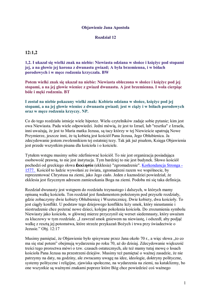 Objawienie Jana Apostoła Rozdział 12 12:1,2 1,2. I ukazał się wielki znak na niebie: Niewiasta odziana w słońce i księżyc pod stopami jej, a na głowie jej korona z dwunastu gwiazd; A była brzemienna, i w bólach porodowych i w męce rodzenia krzyczała. BW Potem wielki znak się ukazał na niebie: Niewiasta obleczona w słońce i księżyc pod jej stopami, a na jej głowie wieniec z gwiazd dwunastu. A jest brzemienna. I woła cierpiąc bóle i męki rodzenia. BT I został na niebie pokazany wielki znak: Kobieta odziana w słońce, księżyc pod jej stopami, a na jej głowie wieniec z dwunastu gwiazd; jest w ciąży i w bólach porodowych oraz w męce rodzenia krzyczy. NP. Co do tego rozdziału istnieje wiele hipotez. Wielu czytelników zadaje sobie pytanie; kim jest owa Niewiasta. Pada wiele odpowiedzi. Jedni mówią, że jest to Izrael, lub "resztka" z Izraela, inni uważają, że jest to Maria matka Jezusa, są tacy którzy w tej Niewieście upatrują Nowe Przymierze, jeszcze inni, że tą kobietą jest kościół Pana Jezusa, Jego Oblubienica. Ja zdecydowanie jestem zwolennikiem tej ostatniej tezy. Tak jak już pisałem, Księga Objawienia jest przede wszystkim pisana dla kościoła i o kościele. Tytułem wstępu musimy sobie zdefiniować kościół. To nie jest organizacja posiadająca osobowość prawną, to nie jest instytucja. Tym bardziej to nie jest budynek. Słowo kościół pochodzi od greckiego słowa ἐκκλησία (ekklesia) "zgromadzenie". Korkondancja Stronga 1577. Kościół to ludzie wywołani ze świata, zgromadzeni razem we wspólnocie, by reprezentować Chrystusa na ziemi, jako Jego ciało. Jeden z kaznodziei powiedział, że ekklesia jest fizycznym adresem zamieszkania Boga na ziemi. Podoba mi się taka definicja. Rozdział dwunasty jest wstępem do rozdziału trzynastego i dalszych, w których mamy opisaną walkę kościoła. Ten rozdział jest fundamentem położonym pod przyszłe rozdziały, gdzie zobaczymy dwie kobiety Oblubienicę i Wszetecznicę. Dwie kobiety, dwa kościoły. To jest ciągły konflikt. U podstaw tego dziejowego konfliktu leży smok, który nieustannie i niestrudzenie chce pożerać nowe dzieci, kolejne pokolenia kościoła. Do zrozumienia symbolu Niewiasty jako kościoła, w głównej mierze przyczynił się werset siedemnasty, który uważam za kluczowy w tym rozdziale. „I zawrzał smok gniewem na niewiastę, i odszedł, aby podjąć walkę z resztą jej potomstwa, które strzeże przykazań Bożych i trwa przy świadectwie o Jezusie.” Obj. 12:17 Musimy pamiętać, że Objawienie było spisywane przez Jana około 70 r., a więc słowa „to co ma się stać potem” obejmują wydarzenia po roku 70, aż do dzisiaj. Zdecydowanie większość treści tego proroctwa mówi o tzw. czasach ostatecznych, ale też mamy tutaj mowę o losach kościoła Pana Jezusa na przestrzeni dziejów. Musimy też pamiętać o ważnej zasadzie, że nie patrzymy na daty, na godziny, ale zwracamy uwagę na idee, ideologie, doktryny polityczne, systemy polityczne i religijne, zjawiska społeczne, na wydarzenia na ziemi, na kataklizmy, bo one wszystkie są ważnymi znakami poprzez które Bóg chce powiedzieć coś ważnego 1 mieszkańcom ziemi w każdym pokoleniu. Jan widzi pierwszy wielki σημειον (sēmeion) ZNAK. Widzi na niebie Niewiastę odzianą w słońce. Niewiasta w Starym Testamencie symbolizuje lud wybrany jako ukochaną i piękną Oblubienicę, „Bożą żonę”. Cała księga Pieśni nad Pieśniami właśnie o tym mówi, czytamy o tej analogi również w innych miejscach w Biblii: ”Kimże jest ta, która jaśnieje jak zorza poranna, piękna jak księżyc, promienna jak słońce, groźna jak hufce waleczne?” Pieśń n P 6:10 „Bo twoim małżonkiem jest twój Stwórca, - jego imię Pan Zastępów - a twoim Odkupicielem Święty Izraelski, zwany Bogiem całej ziemi. Gdyż Pan uzna cię znów za małżonkę, niegdyś porzuconą i strapioną w duchu. Bo czy można wzgardzić małżonką poślubioną w młodości? mówi twój Bóg.” Izaj. 54:5-6 „Bo jak młodzieniec poślubia pannę, tak poślubi cię twój Odnowiciel, a jak oblubieniec raduje się z oblubienicy, tak twój Bóg będzie się radował z ciebie.” Izaj. 62:5 „I zaręczę cię z sobą na wieki; Zaręczę cię z sobą na zasadzie sprawiedliwości i prawa, miłości i zmiłowania. I zaręczę cię z sobą na zasadzie wierności, i poznasz Pana.” Oz. 2:21-22 „Pięknej, rozkosznej pannie przypodobałem był córkę Syońską;” Jer. 6:2 BG „Wy sami możecie mi zaświadczyć, że powiedziałem: Ja nie jestem Chrystusem, lecz zostałem posłany przed nim. Kto ma oblubienicę, ten jest oblubieńcem; a przyjaciel oblubieńca, który stoi i słucha go, raduje się niezmiernie, słysząc głos oblubieńca. Tej właśnie radości doznaję w całej pełni.” Jan. 3:28-29 „Zabiegam bowiem o was z gorliwością Bożą; albowiem zaręczyłem was z jednym mężem, aby stawić przed Chrystusem dziewicę czystą,” 2 Kor. 11:2 „Tajemnica to wielka, ale ja odnoszę to do Chrystusa i Kościoła. A zatem niechaj i każdy z was miłuje żonę swoją, jak siebie samego, a żona niechaj poważa męża swego.” Efez. 5:32-33 „Weselmy się i radujmy się, i oddajmy mu chwałę, gdyż nastało wesele Baranka, i oblubienica jego przygotowała się; I dano jej przyoblec się w czysty, lśniący bisior, a bisior oznacza sprawiedliwe uczynki świętych.” Obj. 19:7-8 Dalej czytamy, że Niewiasta była odziana w słońce. Słońce daje światło, ciepło i utrzymuje życie biologiczne. Słońce jest symbolem Bożej Obecności i Bożego życia w Kościele. Kościół jest odziany, zewsząd przeniknięty Bożym wpływem, Bożą wolą. Jest światłem. Kościół jest w Chrystusie, jest odziany w Chrystusa, jest nim na wskroś przesiąknięty. „Albowiem słońcem i tarczą jest Pan, Bóg, Łaski i chwały udziela Pan, Nie odmawia tego, co dobre, tym, Którzy żyją w niewinności
