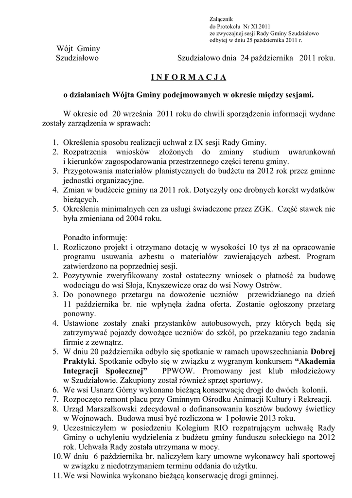 Załącznik do Protokołu Nr XI.2011 ze zwyczajnej sesji Rady Gminy Szudziałowo odbytej w dniu 25 października 2011 r. Wójt Gminy Szudziałowo Szudziałowo dnia 24 października 2011 roku. INFORMACJA o działaniach Wójta Gminy podejmowanych w okresie między sesjami. W okresie od 20 września 2011 roku do chwili sporządzenia informacji wydane zostały zarządzenia w sprawach: 1. Określenia sposobu realizacji uchwał z IX sesji Rady Gminy. 2. Rozpatrzenia wniosków złożonych do zmiany studium uwarunkowań i kierunków zagospodarowania przestrzennego części terenu gminy. 3. Przygotowania materiałów planistycznych do budżetu na 2012 rok przez gminne jednostki organizacyjne. 4. Zmian w budżecie gminy na 2011 rok. Dotyczyły one drobnych korekt wydatków bieżących. 5. Określenia minimalnych cen za usługi świadczone przez ZGK. Część stawek nie była zmieniana od 2004 roku. Ponadto informuję: 1. Rozliczono projekt i otrzymano dotację w wysokości 10 tys zł na opracowanie programu usuwania azbestu o materiałów zawierających azbest. Program zatwierdzono na poprzedniej sesji. 2. Pozytywnie zweryfikowany został ostateczny wniosek o płatność za budowę wodociągu do wsi Słoja, Knyszewicze oraz do wsi Nowy Ostrów. 3. Do ponownego przetargu na dowożenie uczniów przewidzianego na dzień 11 października br. nie wpłynęła żadna oferta. Zostanie ogłoszony przetarg ponowny. 4. Ustawione zostały znaki przystanków autobusowych, przy których będą się zatrzymywać pojazdy dowożące uczniów do szkół, po przekazaniu tego zadania firmie z zewnątrz. 5. W dniu 20 października odbyło się spotkanie w ramach upowszechniania Dobrej Praktyki. Spotkanie odbyło się w związku z wygranym konkursem “Akademia Integracji Społecznej” PPWOW. Promowany jest klub młodzieżowy w Szudziałowie. Zakupiony został również sprzęt sportowy. 6. We wsi Usnarz Górny wykonano bieżącą konserwację drogi do dwóch kolonii. 7. Rozpoczęto remont placu przy Gminnym Ośrodku Animacji Kultury i Rekreacji. 8. Urząd Marszałkowski zdecydował o dofinansowaniu kosztów budowy świetlicy w Wojnowach. Budowa musi być rozliczona w I połowie 2013 roku. 9. Uczestniczyłem w posiedzeniu Kolegium RIO rozpatrującym uchwałę Rady Gminy o uchyleniu wydzielenia z budżetu gminy funduszu sołeckiego na 2012 rok. Uchwała Rady została utrzymana w mocy. 10.W dniu 6 października br. naliczyłem kary umowne wykonawcy hali sportowej w związku z niedotrzymaniem terminu oddania do użytku. 11.We wsi Nowinka wykonano bieżącą konserwację drogi gminnej. 12.Odbyłem rozmowę w Starostwie Powiatowym w sprawie przedłużenia decyzji odnośnie rekultywacji wysypiska śmieci w Szudziałowie. Nie będziemy musieli rezerwować środków na ten cel w budżecie gminy na 2012 rok. Będziemy jednak zmuszeni do wygospodarowania ponad 1 miliona zł na to zadanie w 2013 roku. 13.W związku z nierozstrzygnięciem przetargu na dowożenie uczniów do szkół – w dniu 21 października odbyło się spotkanie z przedstawicielami PKS Siemiatycze odnośnie powierzenia tej jednostce realizacji tego zadania. Rozmowy nie zakończyły się porozumieniem, wobec tego zostanie ogłoszony nowy przetarg. 14.Uzyskałem darowiznę od Pana Wilczewskiego na rzecz Stowarzyszenia Przyjaciół Gminy Szudziałowo z przeznaczeniem na wydawanie “Głosu Szudziałowa”. 15.Otrzymałem informację od firmy Heifer, że nie otrzymaliśmy zgody na dofinansowanie projektu pomocowego dla Gminy na rok bieżący. Podtrzymałem stanowisko, ażeby jeszcze raz złożyć wniosek, który będzie rozpatrywany najwcześniej w lipcu 2012 roku. 16.W dniu 23 października 2011 r w Szkole Podstawowej w Babikach odbyło się spotkanie z pomysłodawcami i redaktorami książki wydanej na podstawie rękopisu A. Bućkiewicza – lekarza pochodzącego z Zubowszczyzny, obecnie Babiki. 17.W dniu 30 grudnia 2010 roku na sesji Rady Gminy działając jako Wójt Gminy Szudziałowo przedstawiłem informację o stanie Gminy. Opierałem się przy tym na treści protokołu pokontrolnego Regionalnej Izby Obrachunkowej nie cytując go dokładnie. Wynikało z niego m.in. że Wójt w roku 2009, w przypadku inwestycji drogowych wypłacał wykonawcom za roboty niewykonywane przez nich fizycznie. Chciałbym w tym miejscu sprostować, że użyte przeze mnie sformułowanie cyt. “Między innymi Pan Stanisław Fiedorowicz zgadzał się aby wypłacać wykonawcom za roboty niewykonane,...” było o tyle nieprecyzyjne, że mogło zostać źle zrozumiane, jakoby roboty budowlane nie zostały ukończone, a drogi nie zostały wykonane, a mimo to Wójt pieniądze wypłacił. Taka sytuacja, oczywiście nie miała miejsca i nie było moim zamiarem przeinaczenie treści protokołu RIO. Natomiast zarzut kontrolerów dotyczył wypłat kwot Przedsiębiorstwu realizującemu inwestycję za roboty niewykonywane przez tego wykonawcę fizycznie. WÓJT Mariusz Czaban