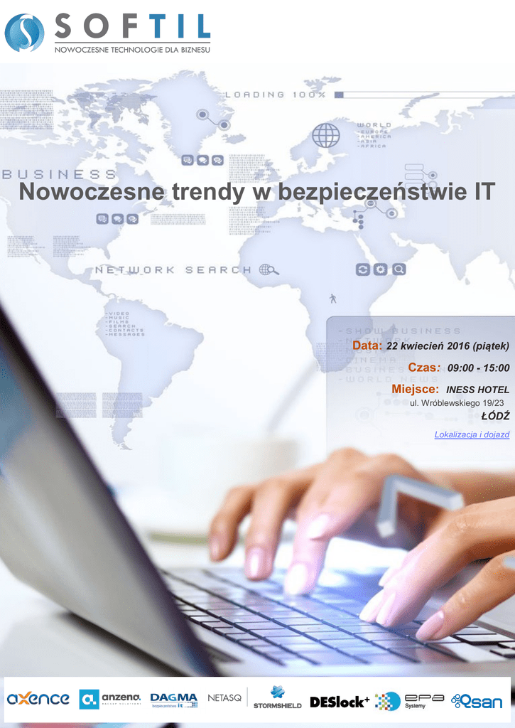 Nowoczesne trendy w bezpieczeństwie IT Data: 22 kwiecień 2016 (piątek) Czas: 09:00 - 15:00 Miejsce: INESS HOTEL ul. Wróblewskiego 19/23 ŁÓDŹ Lokalizacja i dojazd Firma SOFTIL - dostawca profesjonalnych rozwiązań z dziedziny bezpieczeństwa i zarządzania zasobami IT we współpracy z partnerami: Axence - producentem oprogramowania do kompleksowego zarządzania sieciami komputerowymi, DAGMA Biuro bezpieczeństwa IT - jednym z największych na polskim rynku dystrybutorów rozwiązań z dziedziny bezpieczeństwa IT, Anzena sp. z o. o. - oficjalnym dystrybutorem rozwiązań do backupu i szybkiego przywracania danych amerykańskiej firmy StorageCraft Technology Corporation na terenie Polski, Epa systemy - oficjalnym i wyłącznym dystrybutorem firmy QSAN w Polsce, zapraszają do udziału w bezpłatnej konferencji: Nowoczesne trendy w bezpieczeństwie IT. HARMONOGRAM 08:45 - 09:00 Rejestracja uczestników 09:00 - 09:10 Przywitanie uczestników i otwarcie konferencji 09:10 - 10:25 Axence nVision - Efektywne zarządzanie infrastrukturą IT w nowoczesnej organizacji oszczędności i wzrost poziomu bezpieczeństwa Inwentaryzacja sprzętu i oprogramowania (audyty legalności); audyt operacji na urządzeniach przenośnych; mapowanie i proaktywne monitorowanie sieci; monitoring parametrów środowiskowych serwerowni; efektywne zarządzanie licencjami; inteligentne monitorowanie pracowników; monitorowanie odwiedzanych stron WWW i ich blokowanie; monitorowanie i raporty kosztów wydruków; help-desk. 10:25 - 10:40 Przerwa 10:40 - 11:25 NETASQ STORMSHIELD - Najnowsza seria urządzeń od europejskiego lidera wśród dostawców rozwiązań UTM STORMSHIELD skuteczna ochrona sieci firmowej przed atakami i zagrożeniami z zewnątrz oraz monitorowanie poziomu bezpieczeństwa. 11:25 - 12:10 System DESlock- Pełne bezpieczeństwo danych dzięki szyfrowaniu dysków twardych, przenośnych dysków USB, nośników CD/DVD, wiadomości e-mail 12:10- 12:40 Lunch 12:40 - 13:40 ShadowProtect SPX - Program do backup i szybkiego przywracania danych Pokaz praktyczny m.in. odtwarzania systemu na zupełnie innym sprzęcie (technologia Hardware Independent Restore), odzyskiwanie wybranych plików z backupu, pokaz autorskiej technologii VirtualBoot™. 13:40- 13:50 Przerwa 13:50 - 14:40 Qsan Technology - Systemy dyskowe z interfejsem iSCSI oraz Fibre Channel, macierze zunifikowane, łączące model SAN i NAS w jednym rozwiązaniu 14:40 - 15:00 Rozdanie certyfikatów i nagród m.in.: - Voucher na jazdę samochodem wyścigowym Zasiądź jako kierowca niezwykłej Corvetty i poczuj się jak prawdziwy kierowca wyścigowy! - licencje na system do backup-u ShadowProtect, i wiele innych. Udział w konferencji jest bezpłatny. Wymagana jest wcześniejsza rejestracja. Liczba miejsc jest ograniczona. POBIERZ FORMULARZ ZGŁOSZENIOWY PARTNERZY: