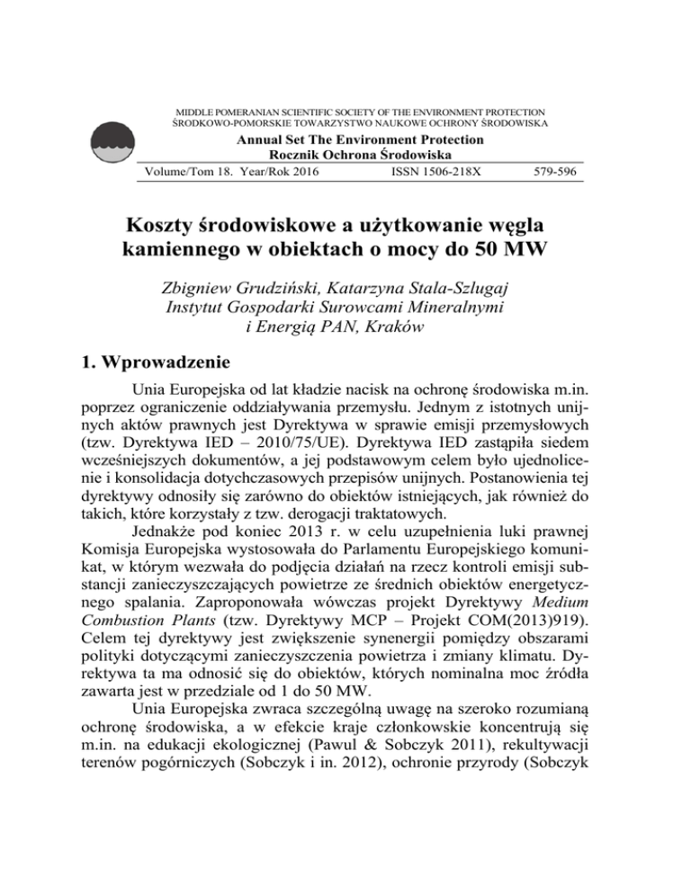 MIDDLE POMERANIAN SCIENTIFIC SOCIETY OF THE ENVIRONMENT PROTECTION ŚRODKOWO-POMORSKIE TOWARZYSTWO NAUKOWE OCHRONY ŚRODOWISKA Annual Set The Environment Protection Rocznik Ochrona Środowiska Volume/Tom 18. Year/Rok 2016 ISSN 1506-218X 579-596 Koszty środowiskowe a użytkowanie węgla kamiennego w obiektach o mocy do 50 MW Zbigniew Grudziński, Katarzyna Stala-Szlugaj Instytut Gospodarki Surowcami Mineralnymi i Energią PAN, Kraków 1. Wprowadzenie Unia Europejska od lat kładzie nacisk na ochronę środowiska m.in. poprzez ograniczenie oddziaływania przemysłu. Jednym z istotnych unijnych aktów prawnych jest Dyrektywa w sprawie emisji przemysłowych (tzw. Dyrektywa IED – 2010/75/UE). Dyrektywa IED zastąpiła siedem wcześniejszych dokumentów, a jej podstawowym celem było ujednolicenie i konsolidacja dotychczasowych przepisów unijnych. Postanowienia tej dyrektywy odnosiły się zarówno do obiektów istniejących, jak również do takich, które korzystały z tzw. derogacji traktatowych. Jednakże pod koniec 2013 r. w celu uzupełnienia luki prawnej Komisja Europejska wystosowała do Parlamentu Europejskiego komunikat, w którym wezwała do podjęcia działań na rzecz kontroli emisji substancji zanieczyszczających powietrze ze średnich obiektów energetycznego spalania. Zaproponowała wówczas projekt Dyrektywy Medium Combustion Plants (tzw. Dyrektywy MCP – Projekt COM(2013)919). Celem tej dyrektywy jest zwiększenie synenergii pomiędzy obszarami polityki dotyczącymi zanieczyszczenia powietrza i zmiany klimatu. Dyrektywa ta ma odnosić się do obiektów, których nominalna moc źródła zawarta jest w przedziale od 1 do 50 MW. Unia Europejska zwraca szczególną uwagę na szeroko rozumianą ochronę środowiska, a w efekcie kraje członkowskie koncentrują się m.in. na edukacji ekologicznej (Pawul & Sobczyk 2011), rekultywacji terenów pogórniczych (Sobczyk i in. 2012), ochronie przyrody (Sobczyk 580 Zbigniew Grudziński, Katarzyna Stala-Szlugaj i in. 2014), czy też racjonalnej gospodarce odpadami (Klojzy-Karczmarczyk & Makoudi 2011). W związku z projektem nowych przepisów unijnych (dyrektywa MCP) zaistnieje konieczność dotrzymania krajowych pułapów emisji. By móc im sprostać, istniejące obiekty o mocy do 50 MW opalane węglem kamiennym (kotły rusztowe) muszą liczyć się z potrzebą ich odtworzenia w nowej technologii spalania. Mogą one być zastąpione np. kotłami fluidalnymi również na węgiel kamienny lub na inne paliwo. Dodatkowo może się to wiązać z koniecznością spalania węgla o lepszych (niż dotychczas) parametrach jakościowych. Celem niniejszego artykułu jest oszacowanie kosztów środowiskowych dla obiektów o mocy do 50 MW, zużywających węgiel kamienny. 2. Węgiel kamienny a produkcja ciepła w Polsce Rynek ciepłowniczy w Polsce ma charakter lokalny, spowodowany dużym rozdrobnieniem przedsiębiorstw ciepłowniczych. Według danych za rok 2014 (Energetyka cieplna… 2015) ciepło wytwarzano w 451 przedsiębiorstwach, w których zainstalowana łączna moc cieplna wyniosła 56 796 MW (rys. 1, 2). a) b) 70 000 100% 60 000 80% MW 50 000 60% 40 000 30 000 40% 20 000 20% 10 000 0 5867 2008 < 50 MW 5756 5679 2009 2010 50‐500 MW 5443 5630 5185 5058 2011 2012 2013 2014 500‐1000 MW >1000 MW 0% 2008 2009 < 50 MW 2010 50‐500 MW 2011 2012 500‐1000 MW 2013 2014 >1000 MW Rys. 1. Przedsiębiorstwa ciepłownicze według źródeł mocy, a) MW, b) % Fig. 1. Heating plants according to heat generation capacity, a) MW, b) % Źródło: opracowanie własne na podst. (Energetyka cieplna… 2009-2015) Najliczniej reprezentowaną grupą wśród wytwórców ciepła są przedsiębiorstwa ciepłownicze o mocy źródeł do 50 MW. Chociaż ich przeciętny udział w liczbie koncesjonowanych przedsiębiorstw ciepłowniczych wynosi aż 61-62% (lata 2008-2014), to łączna moc zain- 581 Koszty środowiskowe a użytkowanie węgla kamiennego… szt. stalowana w tych przedsiębiorstwach stanowi 8-10% mocy zainstalowanej ogółem. a) b) 600 100% 500 80% 400 60% 300 200 40% 322 308 301 292 287 278 273 2008 2009 2010 2011 2012 2013 2014 2008 >1000 MW < 50 MW 100 20% 0% 0 < 50 MW 50‐500 MW 500‐1000 MW 2009 2010 50‐500 MW 2011 2012 500‐1000 MW 2013 2014 >1000 MW Rys. 2. Moc zainstalowana w przedsiębiorstwach ciepłowniczych, a) szt., b) % Fig. 2. The installed heating power in heating plants with specification groups of heat generation capacity, a) numbers, b) % Źródło: opracowanie własne na podst. (Energetyka cieplna… 2009-2015) Ciepło oraz ciepła woda użytkowa w przedsiębiorstwach ciepłowniczych w Polsce produkowana jest głównie w oparciu o węgiel kamienny. Jego przeciętny udział w strukturze wytwarzanie ciepła w latach 2008-2014 wynosi aż 74-77% (rys. 3). Spośród pozostałych paliw w ostatnich latach rośnie udział gazu ziemnego (do ok. 8%) i paliw odnawialnych (gł. biomasy, 6-8%). 100 80 % 60 40 76 75 76 2008 2009 2010 74 75 77 75 2011 2012 2013 2014 20 0 w. kamienny gaz ziemny olej opałowy OZE pozostałe paliwa Rys. 3. Struktura produkcji ciepła w Polsce wg stosowanych paliw, lata 2008-2014 Fig. 3. Structure of heat generation by the fuels in Poland, 2008-2014 Źródło: opracowanie własne na podst. (Energetyka cieplna… 2009-2015) Od 2008 r. zużycie węgla kamiennego do produkcji ciepła w Polsce utrzymuje się w lekkim trendzie spadkowym (rys. 4). W latach 2008-2014 przedsiębiorstwa ciepłownicze przeciętnie rocznie zużywały 582 Zbigniew Grudziński, Katarzyna Stala-Szlugaj 14-17 mln ton tego paliwa. Największy wzrost w stosunku rocznym wystąpił w roku 2010 (o 9%), a największy spadek w 2011 (o 11%). Zmiany te można powiązać z różną długością sezonu grzewczego. Względem 2010 r. liczba stopniodni grzania (Efektywność…2015) wydłużyła się o 442 i w 2011 r. wyniosła 3881. Według podziału administracyjnego największe zużycie węgla kamiennego do produkcji ciepła występuje w woj. mazowieckim i 
