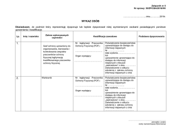 Załącznik nr 5 Nr sprawy: 30/ZP/CBA/2016/KK ...................................., dnia................2016r. WYKAZ OSÓB Oświadczam, że podmiot który reprezentuję dysponuje lub będzie dysponował niżej wymienionymi osobami posiadającymi poniższe uprawnienia i kwalifikacje: Lp. Imię i nazwisko Zakres wykonywanych czynności 1. Szef ochrony uprawniony do organizowania, kierowania i kontrolowania zespołów pracowników ochrony fizycznej legitymację kwalifikowanego pracownika ochrony fizycznej. 2. Wartownik Kwalifikacje zawodowe Nr legitymacji Pracownika Ochrony Fizycznej (POF) : …………………..…………… Organ wydający: ………………………………… Nr legitymacji Pracownika Ochrony Fizycznej (POF) : …………………..…………… Organ wydający: ………………………………… Podstawa dysponowania Poświadczenie bezpieczeństwa upoważniające do dostępu do informacji niejawnych Nr ………………….. data wydania…………………… lub upoważnienie uprawniające do dostępu do informacji niejawnych o klauzuli „zastrzeżone” z dnia………….… Zaświadczenie o odbyciu szkolenia z zakresu ochrony informacji niejawnych z dnia …………………………………. Poświadczenie bezpieczeństwa upoważniające do dostępu do informacji niejawnych Nr ………………….. data wydania…………………… lub upoważnienie uprawniające do dostępu do informacji niejawnych o klauzuli „zastrzeżone” z dnia………….… Zaświadczenie o odbyciu szkolenia z zakresu ochrony informacji niejawnych z dnia …………………………………. .............................................................................. (pieczątka i podpis osoby reprezentującej Wykonawcę) Załącznik nr 5 Nr sprawy: 30/ZP/CBA/2016/KK 3. Wartownik Nr legitymacji Pracownika Ochrony Fizycznej (POF) : …………………..…………… Organ wydający: ………………………………… 4. Wartownik Nr legitymacji Pracownika Ochrony Fizycznej (POF) : …………………..…………… Organ wydający: ………………………………… 5. Wartownik Nr legitymacji Pracownika Ochrony Fizycznej (POF) : …………………..…………… Organ wydający: ………………………………… Poświadczenie bezpieczeństwa upoważniające do dostępu do informacji niejawnych Nr ………………….. data wydania…………………… lub upoważnienie uprawniające do dostępu do informacji niejawnych o klauzuli „zastrzeżone” z dnia………….… Zaświadczenie o odbyciu szkolenia z zakresu ochrony informacji niejawnych z dnia …………………………………. Poświadczenie bezpieczeństwa upoważniające do dostępu do informacji niejawnych Nr ………………….. data wydania…………………… lub upoważnienie uprawniające do dostępu do informacji niejawnych o klauzuli „zastrzeżone” z dnia………….… Zaświadczenie o odbyciu szkolenia z zakresu ochrony informacji niejawnych z dnia …………………………………. Poświadczenie bezpieczeństwa upoważniające do dostępu do informacji niejawnych Nr ………………….. data wydania…………………… lub upoważnienie uprawniające do dostępu do informacji niejawnych o klauzuli „zastrzeżone” z dnia………….… Zaświadczenie o odbyciu .............................................................................. (pieczątka i podpis osoby reprezentującej Wykonawcę) Załącznik nr 5 Nr sprawy: 30/ZP/CBA/2016/KK 6. Wartownik Nr legitymacji Pracownika Ochrony Fizycznej (POF) : …………………..…………… Organ wydający: ………………………………… 7. Wartownik Nr legitymacji Pracownika Ochrony Fizycznej (POF) : …………………..…………… Organ wydający: ………………………………… szkolenia z zakresu ochrony informacji niejawnych z dnia …………………………………. Poświadczenie bezpieczeństwa upoważniające do dostępu do informacji niejawnych Nr ………………….. data wydania…………………… lub upoważnienie uprawniające do dostępu do informacji niejawnych o klauzuli „zastrzeżone” z dnia………….… Zaświadczenie o odbyciu szkolenia z zakresu ochrony informacji niejawnych z dnia …………………………………. Poświadczenie bezpieczeństwa upoważniające do dostępu do informacji niejawnych Nr ………………….. data wydania…………………… lub upoważnienie uprawniające do dostępu do informacji niejawnych o klauzuli „zastrzeżone” z dnia………….… Zaświadczenie o odbyciu szkolenia z zakresu ochrony informacji niejawnych z dnia …………………………………. .............................................................................. (pieczątka i podpis osoby reprezentującej Wykonawcę)