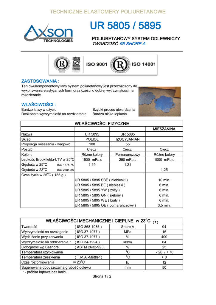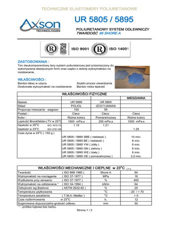 TECHNICZNE ELASTOMERY POLIURETANOWE UR 5805 / 5895 POLIURETANOWY SYSTEM ODLEWNICZY TWARDOŚĆ 95 SHORE A ZASTOSOWANIA : Ten dwukomponentowy lany system poliuretanowy jest przeznaczony do wykonywania elastycznych form oraz części o dobrej wytrzymałości na rozdzieranie. WŁAŚCIWOŚCI : Bardzo łatwy w użyciu Doskonała wytrzymałość na rozdzieranie Szybki proces utwardzania Bardzo niska lepkość WŁAŚCIWOŚCI FIZYCZNE MIESZANINA Nazwa Skład Proporcja mieszania - wagowo Postać : Kolor : Lepkość Brookfielda-LTV w 25oC Gęstość w 25oC ISO 1675-75 o Gęstość w 23 C ISO 2781-88 Czas życia w 25oC ( 155 g ) UR 5895 POLIOL 100 Ciecz Różne kolory 1500 mPa.s 1.19 UR 5805 IZOCYJANIAN 55 Ciecz Pomarańczowy 250 mPa.s 1.21 Ciecz Różne kolory 1000 mPa.s 1.25 UR 5805 / 5895 SBE ( niebieski ) UR 5805 / 5895 BE ( niebieski ) UR 5805 / 5895 YW ( żółty ) UR 5805 / 5895 GN ( zielony ) UR 5805 / 5895 WE ( biały ) UR 5805 / 5895 OE ( pomarańczowy ) WŁAŚCIWOŚCI MECHANICZNE I CIEPLNE w 23o C Twardość ( ISO 868-1985 ) Wytrzymałość na rozciąganie ( ISO 37-1977 ) Wydłużenie przy zerwaniu ( ISO 37-1977 ) Wytrzymałość na oddzieranie * ( ISO 34-1994 ) Odbojność wg Bashore ( ASTM 2632-92 ) Temperatura użytkowania Temperatura zeszklenia ( T.M.A.-Mettler ) Czas rozformowania w 23oC Sugerowana dopuszczalna grubość odlewu * - próbka kątowa bez karbu. Strona 1 / 2 Shore A MPa % kN/m % o C o C h. mm 10 min. 6 min. 6 min. 6 min. 6 min. 3,5 min. (1) 94 16 400 64 25 - 20 / + 70 >0 12 50 TECHNICZNE ELASTOMERY POLIURETANOWE UR 5805 / 5895 POLIURETANOWY SYSTEM ODLEWNICZY TWARDOŚĆ 95 SHORE A WYTYCZNE STOSOWANIA : Przed każdorazowym użyciem bardzo dokładnie wymieszać poliol aż do uzyskania jednolitego koloru oraz jednorodności produktu ( szczególnie należy sprawdzić czy produkt nie osadził się na dnie pojemnika. Oba składniki muszą być mieszane w temperaturze pokojowej powyżej 18oC zgodnie z podaną proporcją mieszania. W przypadku krystalizacji ( objawy : poliol - brak jednorodności produktu, izocyjanian - brak przejrzystości ) należy produkt wygrzać w temperaturze 60oC ( 4 - 6 h ) aż do osiągnięcia stanu jednorodności po czym ponownie dokładnie wymieszać. UWAGA ! - przed dokonaniem odlewu należy upewnić się, że forma jest absolutnie sucha. BEZPIECZEŃSTWO I HIGIENA PRACY : Zwykłe środki bezpieczeństwa powinny być zachowane podczas pracy z tym produktem : - zapewnić dobrą wentylację - nosić ubranie ochronne - nosić rękawice i okulary ochronne Bardziej szczegółowe informacje zawarte są w kartach charakterystyki obu komponentów. PRZECHOWYWANIE : Okres składowania wynosi 9 miesięcy dla izocyjanianu oraz 12 miesięcy dla poliolu w oryginalnych nie otwieranych pojemnikach w temperaturze pomiędzy 15 i 20oC. Po otwarciu pojemnik należy szczelnie zamknąć pod osłoną gazu obojętnego ( suche powietrze, azot itp.. ). OPAKOWANIA : IZOCYJANIAN UR 5805 11 kg UR 5805 225 kg UR 5805 225 kg UR 5805 1125 kg POLIOL UR 5895 20 kg UR 5895 205 kg UR 5895 1025 kg w zależności od koloru produktu GWARANCJA : Wszystkie informacje zawarte powyżej są rezultatem badań i testów przeprowadzonych w naszym laboratorium w ściśle określonych warunkach. Użytkownik ponosi pełną odpowiedzialność za określenie przydatności ( w swoich warunkach ) produktu AXSON ( przed dokonaniem zakupu ) do proponowanego zastosowania. AXSON gwarantuje zgodność swojego produktu z jego specyfikacją lecz nie może zagwarantować jego kompatybilności z jakimkolwiek szczególnym zastosowaniem. AXSON odrzuca jakąkolwiek odpowiedzialność za zniszczenia lub wypadki, które spowodowane zostały użyciem jego produktów. Odpowiedzialność AXSON jest ściśle ograniczona do zwrotu pieniędzy lub wymiany produktu niezgodnego z jego specyfikacją. AMOD - Andrzej Modrzewski Przedstawiciel w Polsce : 01-793 Warszawa ul. Rydygiera 8 tel. / fax. ( 22 ) 633-85-06 tel. ( 22 ) 669-37-76 tel. komórkowy ( 602 ) 26-11-15 INTERNET: www.amod.pl oraz www.amod.com.pl e-mail:[email protected] Strona 2 / 2