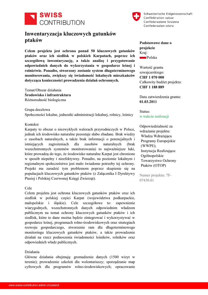 Inwentaryzacja kluczowych gatunków ptaków Celem projektu jest ochrona ponad 50 kluczowych gatunków ptaków oraz ich siedlisk w polskich Karpatach, poprzez ich szczegółową inwentaryzację, a także analizę i przygotowanie odpowiednich danych do wykorzystania w gospodarce leśnej i rolnictwie. Ponadto, stworzony zostanie system długoterminowego monitorowania, zwiększy się świadomość lokalnych mieszkańców dotycząca konieczności prowadzenia działań ochronnych. Temat/Obszar działania Środowisko i infrastruktura Różnorodność biologiczna Podstawowe dane o projekcie Kraj: Polska Wartość grantu szwajcarskiego: CHF 1 070 000 Całkowity budżet projektu: CHF 1 188 889 Data zatwierdzenia grantu: 01.03.2011 Grupa docelowa Społeczności lokalne, jednostki administracji lokalnej, rolnicy, leśnicy Status: w trakcie realizacji Kontekst Karpaty to obszar o niezwykłych walorach przyrodniczych w Polsce, jednak ich środowisko naturalne pozostaje słabo zbadane. Brak wiedzy o zasobach naturalnych, a także brak informacji o potencjalnych i istniejących zagrożeniach dla zasobów naturalnych (brak wszechstronnych systemów monitorowania) to najważniejsze luki, które prowadzą do tego, że środowisko naturalne Karpat jest chronione w sposób niepełny i nieefektywny. Ponadto, na poziomie lokalnym i regionalnym społeczeństwo jest mało świadome potrzeby tej ochrony. Projekt ma zaradzić tym problemom poprzez skupienie się na populacjach kluczowych gatunków ptaków (z Załącznika I Dyrektywy Ptasiej i Polskiej Czerwonej Księgi Zwierząt). Odpowiedzialność za wdrażanie projektu: Władza Wdrażająca Programy Europejskie (WWPE); Instytucja Realizująca: Ogólnopolskie Towarzystwo Ochrony Ptaków (OTOP) Cele Celem projektu jest ochrona kluczowych gatunków ptaków oraz ich siedlisk w polskiej części Karpat (województwa podkarpackie, małopolskie i śląskie). Cele szczegółowe to: zapewnienie wiarygodnych, wszechstronnych danych odpowiednim władzom publicznym na temat ochrony kluczowych gatunków ptaków i ich siedlisk, które to dane można będzie zintegrować i wykorzystywać w gospodarce leśnej, programach rolno-środowiskowych oraz strategiach rozwoju gospodarczego, stworzenie ram dla długoterminowego monitoringu kluczowych gatunków ptaków, a także prowadzenie działań na rzecz podnoszenia świadomości leśników, rolników oraz odpowiednich władz publicznych. Działania Główne działania obejmują: gromadzenie danych (1500 wizyt w terenie); prowadzenie szkoleń dla wolontariuszy; sporządzanie map cyfrowych dla programów rolno-środowiskowych; opracowanie www.swiss-contribution.admin.ch/poland Numer projektu: 7F07430.01 raportów z zaleceniami dla leśników; opracowanie raportów ekonomiczno-środowiskowych; opracowanie materiałów szkoleniowych i informacyjnych dla grup docelowych Oczekiwane rezultaty Inwentaryzacja populacji ok. 60 kluczowych gatunków ptaków Publikacja „Ptaki polskich Karpat – stan, zagrożenia, ochrona” Stworzenie sieci wolontariuszy zajmujących się monitorowaniem ptaków Przeprowadzenie 45 warsztatów dla grup docelowych Raporty ekonomiczno-środowiskowe dostarczone 12 gminom www.swiss-contribution.admin.ch/poland
