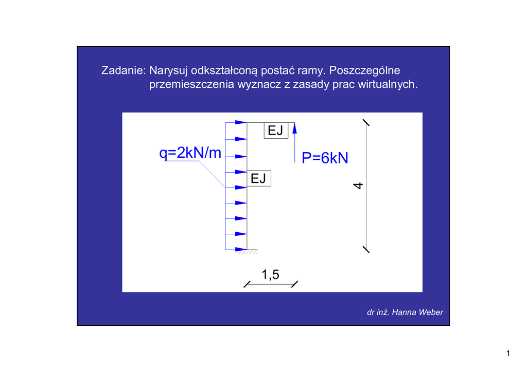 Zadanie: Narysuj odkształconą postać ramy. Poszczególne przemieszczenia wyznacz z zasady prac wirtualnych. EJ q=2kN/m EJ 4 P=6kN 1,5 dr inż. Hanna Weber 1 Wyznaczenie reakcji EJ q=2kN/m EJ 7kNm=MA 4 P=6kN HA= 8kN 1,5 VA= 6kN dr inż. Hanna Weber 2 Wykresy sił wewnętrznych 0 EJ q=2kN/m P=6kN 7kNm=MA 6 4 EJ - + HA= 8kN T [kN] 1,5 VA= 6kN 8 9 9 M [kNm] 7 dr inż. Hanna Weber 3 Możliwe przemieszczenia w ramie B uB C B vB=0 uC vC C uC= uB A dr inż. Hanna Weber 4 Wyznaczenie przemieszczeń 1 4 Przemieszczenie poziome ramy 4 1 M1 4 dr inż. Hanna Weber 5 Wyznaczenie przemieszczeń Przemieszczenie poziome ramy uB = M1 1 2 2 ⋅ 42 1 ⋅ − ⋅ 4 ⋅ ⋅ 4 EI 3 8 2 4 = 9 1 1 2 1 1 ⋅ 7 ⋅ 4 ⋅ ⋅ 4 − ⋅ 9 ⋅ 4 ⋅ ⋅ 4 EI 2 3 2 3 −8 EI 9 9 M = [kNm] 7 + 2 24 =4 8 7 dr inż. Hanna Weber 6 Wyznaczenie przemieszczeń 1 Kąt obrotu w punkcie B 1 1 M2 1 dr inż. Hanna Weber 7 Wyznaczenie przemieszczeń Kąt obrotu w punkcie B 1 ϕB = M2 1 2 2 ⋅ 42 ⋅ − ⋅ 4 ⋅ 1 EI 3 8 1 = 9 1 1 1 ⋅ 7 ⋅ 4 ⋅ 1 − ⋅ 9 ⋅ 4 ⋅ 1 EI 2 2 − 44 − 14,66 = 3EI EI 9 9 M = [kNm] 7 + 2 24 =4 8 7 dr inż. Hanna Weber 8 Wyznaczenie przemieszczeń Przemieszczenie pionowe końca wspornika 1 1,5 1 1,5 1,5 M3 1,5 dr inż. Hanna Weber 9 Wyznaczenie przemieszczeń Przemieszczenie pionowe końca wspornika 1,5 M3 vC = 1 2 2 ⋅ 42 1 2 ⋅ + ⋅ 4 ⋅ 1,5 + ⋅ 9 ⋅ 1,5 ⋅ ⋅ 1,5 2 3 EI 3 8 1,5 = 9 1 1 1 − ⋅ 7 ⋅ 4 ⋅ 1,5 + ⋅ 9 ⋅ 4 ⋅ 1,5 2 EI 2 115 28,75 = 4 EI EI 9 9 M = [kNm] 7 7 + 2 24 =4 8 dr inż. Hanna Weber 10 Wyznaczenie przemieszczeń 1 Kąt obrotu na końcu wspornika 1 1 M4 1 dr inż. Hanna Weber 11 Wyznaczenie przemieszczeń Kąt obrotu na końcu wspornika 1 ϕC = M4 1 2 2 ⋅ 42 1 ⋅ + ⋅ 4 ⋅ 1 + ⋅ 9 ⋅ 1,5 ⋅ 1 EI 3 8 2 1 = 9 1 1 1 − ⋅ 7 ⋅ 4 ⋅ 1 + ⋅ 9 ⋅ 4 ⋅ 1 EI 2 2 257 21,62 = 12 EI EI 9 9 M = [kNm] 7 7 + 2 24 =4 8 dr inż. Hanna Weber 12 Odkształcona postać ramy Przemieszczenia: B u B = uC = − C 100a 8 96 =− = −96a EI 12 EI ϕB = − 44 − 176 = = −176a 3EI 12 EI vC = 115 345 = = 345a 4 EI 12 EI ϕC = 257 = 257 a 12 EI A dr inż. Hanna Weber 13 Odkształcona postać ramy B Przemieszczenia: 96a 96a C u B = uC = − 8 96 =− = −96a EI 12 EI 4 1 100a A dr inż. Hanna Weber 14 Odkształcona postać ramy Przemieszczenia: B 96a ϕB = − 96a 1m w skali ramy 44 − 176 = = −176a 3EI 12 EI C 1m w skali ramy 1 100a A dr inż. Hanna Weber 15 Odkształcona postać ramy B 96a Przemieszczenia: 96a 176a ϕB = − C 44 − 176 = = −176a 3EI 12 EI 1 176a 100a A dr inż. Hanna Weber 16 Odkształcona postać ramy B 96a Przemieszczenia: 96a 176a ϕB = − C 44 − 176 = = −176a 3EI 12 EI 1 176a 100a A dr inż. Hanna Weber 17 Odkształcona postać ramy B 96a Przemieszczenia: 96a 345a vC = C 115 345 = = 345a 4 EI 12 EI 176a 1 100a 1 ,5 A dr inż. Hanna Weber 18 Odkształcona postać ramy B 96a Przemieszczenia: 96a 345a vC = C 115 345 = = 345a 4 EI 12 EI 176a 1 100a 1 ,5 A dr inż. Hanna Weber 19 Odkształcona postać ramy 1m w skali ramy B 96a Przemieszczenia: 96a 345a C ϕC = 257 = 257 a 12 EI 1 176a 100a A dr inż. Hanna Weber 20 Odkształcona postać ramy Przemieszczenia: 1m w skali ramy B 96a 257a 345a ϕC = C 257 = 257 a 12 EI 1 176a 100a A dr inż. Hanna Weber 21 Odkształcona postać ramy Przemieszczenia: 1m w skali ramy B 96a 257a 345a ϕC = C 257 = 257 a 12 EI 1 176a 100a A dr inż. Hanna Weber 22 1m w skali ramy B 96a 257a 345a C 176a 100a A dr inż. Hanna Weber 23 B C A dr inż. Hanna Weber 24 B C A dr inż. Hanna Weber 25 B C 9 9 M [kNm] A 7 dr inż. Hanna Weber 26 B C 9 9 M A [kNm] 7 dr inż. Hanna Weber 27 9 9 M [kNm] 7 dr inż. Hanna Weber 28