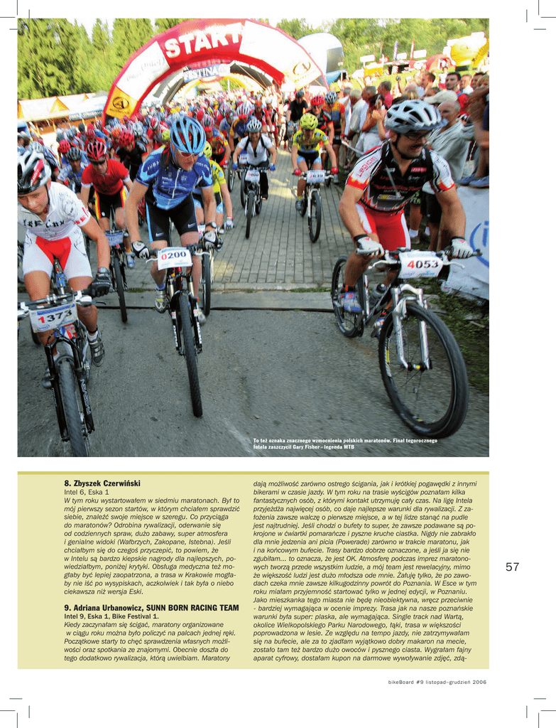 To też oznaka znacznego wzmocnienia polskich maratonów. Finał tegorocznego Intela zaszczycił Gary Fisher - legenda MTB 8. Zbyszek Czerwiński Intel 6, Eska 1 W tym roku wystartowałem w siedmiu maratonach. Był to mój pierwszy sezon startów, w którym chciałem sprawdzić siebie, znaleźć swoje miejsce w szeregu. Co przyciąga do maratonów? Odrobina rywalizacji, oderwanie się od codziennych spraw, dużo zabawy, super atmosfera i genialne widoki (Wałbrzych, Zakopane, Istebna). Jeśli chciałbym się do czegoś przyczepić, to powiem, że w Intelu są bardzo kiepskie nagrody dla najlepszych, powiedziałbym, poniżej krytyki. Obsługa medyczna też mogłaby być lepiej zaopatrzona, a trasa w Krakowie mogłaby nie iść po wysypiskach, aczkolwiek i tak była o niebo ciekawsza niż wersja Eski. 9. Adriana Urbanowicz, SUNN BORN RACING TEAM Intel 9, Eska 1, Bike Festival 1. Kiedy zaczynałam się ścigać, maratony organizowane w ciągu roku można było policzyć na palcach jednej ręki. Początkowe starty to chęć sprawdzenia własnych możliwości oraz spotkania ze znajomymi. Obecnie doszła do tego dodatkowo rywalizacja, którą uwielbiam. Maratony dają możliwość zarówno ostrego ścigania, jak i krótkiej pogawędki z innymi bikerami w czasie jazdy. W tym roku na trasie wyścigów poznałam kilka fantastycznych osób, z którymi kontakt utrzymuję cały czas. Na ligę Intela przyjeżdża najwięcej osób, co daje najlepsze warunki dla rywalizacji. Z założenia zawsze walczę o pierwsze miejsce, a w tej lidze stanąć na pudle jest najtrudniej. Jeśli chodzi o bufety to super, że zawsze podawane są pokrojone w ćwiartki pomarańcze i pyszne kruche ciastka. Nigdy nie zabrakło dla mnie jedzenia ani picia (Powerade) zarówno w trakcie maratonu, jak i na końcowym bufecie. Trasy bardzo dobrze oznaczone, a jeśli ja się nie zgubiłam... to oznacza, że jest OK. Atmosferę podczas imprez maratonowych tworzą przede wszystkim ludzie, a mój team jest rewelacyjny, mimo że większość ludzi jest dużo młodsza ode mnie. Żałuję tylko, że po zawodach czeka mnie zawsze kilkugodzinny powrót do Poznania. W Esce w tym roku miałam przyjemność startować tylko w jednej edycji, w Poznaniu. Jako mieszkanka tego miasta nie będę nieobiektywna, wręcz przeciwnie - bardziej wymagająca w ocenie imprezy. Trasa jak na nasze poznańskie warunki była super: plaska, ale wymagająca. Single track nad Wartą, okolice Wielkopolskiego Parku Narodowego, łąki, trasa w większości poprowadzona w lesie. Ze względu na tempo jazdy, nie zatrzymywałam się na bufecie, ale za to zjadłam wyjątkowo dobry makaron na mecie, zostało tam też bardzo dużo owoców i pysznego ciasta. Wygrałam fajny aparat cyfrowy, dostałam kupon na darmowe wywoływanie zdjęć, zdą- bi k e Boa rd # 9 list o p a d – gr u d z ie ń 2 0 0 6 57