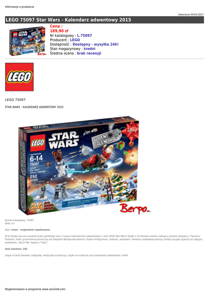Informacje o produkcie Utworzono 04-03-2017 LEGO 75097 Star Wars - Kalendarz adwentowy 2015 Cena : 189,90 zł Nr katalogowy : L.75097 Producent : LEGO Dostępność : Dostępny - wysyłka 24h! Stan magazynowy : średni Średnia ocena : brak recenzji LEGO 75097 STAR WARS – KALENDARZ ADWENTOWY 2015 Numer katalogowy: 75097 Wiek: 6+ Stan: nowe - oryginalnie zapakowane W te Święta wyrusz w podróż przez galaktykę wraz z nowym kalendarzem adwentowym z serii LEGO Star Wars! Każde z 24 okienek zawiera zabawny prezent związany z Tatooine, Endorem, Hoth, przestrzenią kosmiczną lub Świętami Bożego Narodzenia. Dzięki minifigurkom, statkom, pojazdom i świetnej rozkładanej planszy Święta przyjdą szybciej niż zdążysz powiedzieć „Niech Moc będzie z Tobą”! Ilość klocków: 292 stojak na broń Ewoków, katapultę, wieżyczkę strzelniczą, stojak na miotacze oraz stanowisko dowodzenia z Hoth Wygenerowano w programie www.oscGold.com Dostępność w salonach: Ilość sztuk: Sklep - Złotniki: 6 Sklep - zlikwidowany: 0 Sklep - Szczepankowo: 0 Dostępne opcje LEGO 75097 Star Wars - Kalendarz adwentowy 2015 » Wiek: 5 - 7 lat, 8 - 11 lat, 12 lat i więcej.