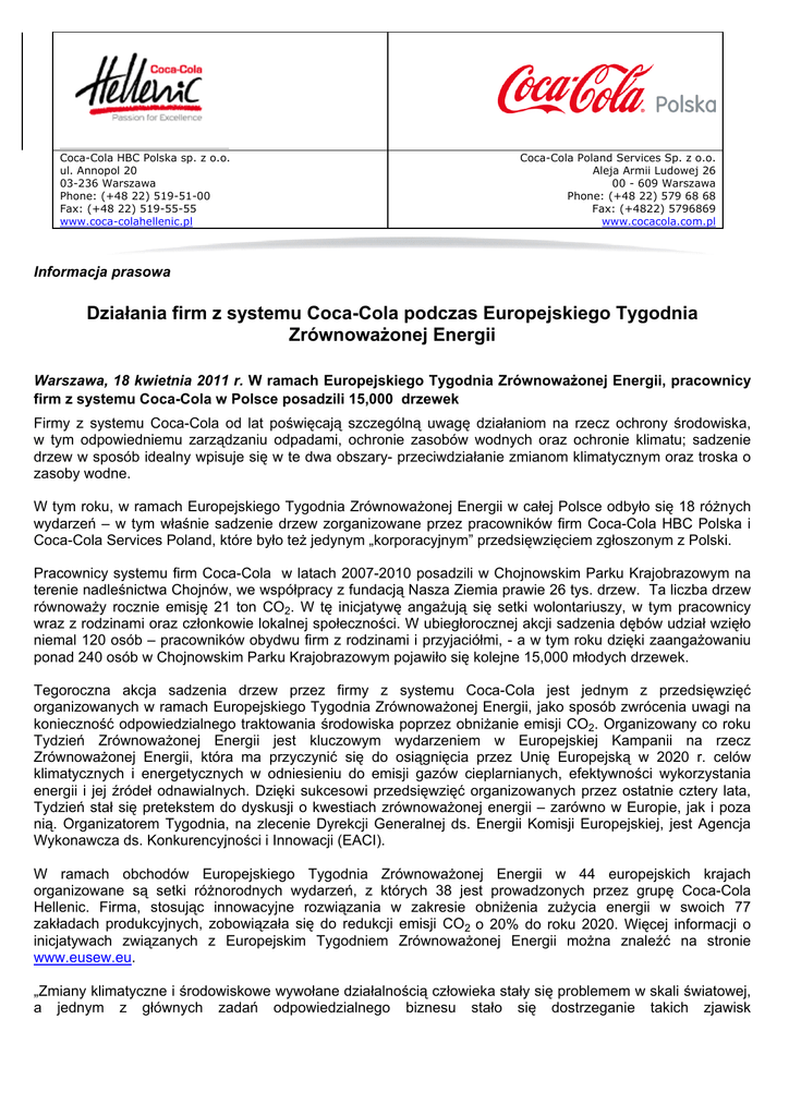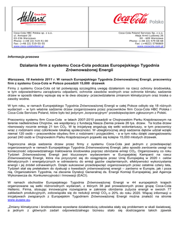 Coca-Cola HBC Polska sp. z o.o. ul. Annopol 20 03-236 Warszawa Phone: (+48 22) 519-51-00 Fax: (+48 22) 519-55-55 www.coca-colahellenic.pl Coca-Cola Poland Services Sp. z o.o. Aleja Armii Ludowej 26 00 - 609 Warszawa Phone: (+48 22) 579 68 68 Fax: (+4822) 5796869 www.cocacola.com.pl Informacja prasowa Działania firm z systemu Coca-Cola podczas Europejskiego Tygodnia Zrównoważonej Energii Warszawa, 18 kwietnia 2011 r. W ramach Europejskiego Tygodnia Zrównoważonej Energii, pracownicy firm z systemu Coca-Cola w Polsce posadzili 15,000 drzewek Firmy z systemu Coca-Cola od lat poświęcają szczególną uwagę działaniom na rzecz ochrony środowiska, w tym odpowiedniemu zarządzaniu odpadami, ochronie zasobów wodnych oraz ochronie klimatu; sadzenie drzew w sposób idealny wpisuje się w te dwa obszary- przeciwdziałanie zmianom klimatycznym oraz troska o zasoby wodne. W tym roku, w ramach Europejskiego Tygodnia Zrównoważonej Energii w całej Polsce odbyło się 18 różnych wydarzeń – w tym właśnie sadzenie drzew zorganizowane przez pracowników firm Coca-Cola HBC Polska i Coca-Cola Services Poland, które było też jedynym „korporacyjnym” przedsięwzięciem zgłoszonym z Polski. Pracownicy systemu firm Coca-Cola w latach 2007-2010 posadzili w Chojnowskim Parku Krajobrazowym na terenie nadleśnictwa Chojnów, we współpracy z fundacją Nasza Ziemia prawie 26 tys. drzew. Ta liczba drzew równoważy rocznie emisję 21 ton CO2. W tę inicjatywę angażują się setki wolontariuszy, w tym pracownicy wraz z rodzinami oraz członkowie lokalnej społeczności. W ubiegłorocznej akcji sadzenia dębów udział wzięło niemal 120 osób – pracowników obydwu firm z rodzinami i przyjaciółmi, - a w tym roku dzięki zaangażowaniu ponad 240 osób w Chojnowskim Parku Krajobrazowym pojawiło się kolejne 15,000 młodych drzewek. Tegoroczna akcja sadzenia drzew przez firmy z systemu Coca-Cola jest jednym z przedsięwzięć organizowanych w ramach Europejskiego Tygodnia Zrównoważonej Energii, jako sposób zwrócenia uwagi na konieczność odpowiedzialnego traktowania środowiska poprzez obniżanie emisji CO2. Organizowany co roku Tydzień Zrównoważonej Energii jest kluczowym wydarzeniem w Europejskiej Kampanii na rzecz Zrównoważonej Energii, która ma przyczynić się do osiągnięcia przez Unię Europejską w 2020 r. celów klimatycznych i energetycznych w odniesieniu do emisji gazów cieplarnianych, efektywności wykorzystania energii i jej źródeł odnawialnych. Dzięki sukcesowi przedsięwzięć organizowanych przez ostatnie cztery lata, Tydzień stał się pretekstem do dyskusji o kwestiach zrównoważonej energii – zarówno w Europie, jak i poza nią. Organizatorem Tygodnia, na zlecenie Dyrekcji Generalnej ds. Energii Komisji Europejskiej, jest Agencja Wykonawcza ds. Konkurencyjności i Innowacji (EACI). W ramach obchodów Europejskiego Tygodnia Zrównoważonej Energii w 44 europejskich krajach organizowane są setki różnorodnych wydarzeń, z których 38 jest prowadzonych przez grupę Coca-Cola Hellenic. Firma, stosując innowacyjne rozwiązania w zakresie obniżenia zużycia energii w swoich 77 zakładach produkcyjnych, zobowiązała się do redukcji emisji CO2 o 20% do roku 2020. Więcej informacji o inicjatywach związanych z Europejskim Tygodniem Zrównoważonej Energii można znaleźć na stronie www.eusew.eu. „Zmiany klimatyczne i środowiskowe wywołane działalnością człowieka stały się problemem w skali światowej, a jednym z głównych zadań odpowiedzialnego biznesu stało się dostrzeganie takich zjawisk Coca-Cola Poland Services Sp. z o.o. Aleja Armii Ludowej 26 00 - 609 Warszawa Phone: (+48 22) 579 68 68 Fax: (+4822) 5796869 www.cocacola.com.pl Coca-Cola HBC Polska sp. z o.o. ul. Annopol 20 03-236 Warszawa Phone: (+48 22) 519-51-00 Fax: (+48 22) 519-55-55 www.coca-colahellenic.pl i przeciwdziałanie degradacji środowiska i niepożądanym zmianom klimatycznym. Dlatego Grupa Coca-Cola Hellenic – która jest sygnatariuszem Global Compact Caring for Climate, największej światowej inicjatywy na rzecz ograniczenia wpływu działalności biznesu na zmiany klimatu – systematycznie wdraża procesy zmiany modeli biznesowych na takie, które wywierają jak najmniejszy wpływ na środowisko naturalne. W szczególności dotyczy to radykalnego ograniczenia emisji CO2 do atmosfery, zdecydowanego ograniczenia wykorzystania i w następstwie całkowitego wykluczenia z użytkowania gazów szkodliwych dla warstwy ozonowej, ograniczenia stosowania paliw, których spalanie stanowi znaczne obciążenie dla klimatu, a także emisji spalin powodowanych przez firmowy system transportowy” – mówi Iwona Jacaszek, dyr. ds. korporacyjnych Coca-Cola HBC Polska. Wśród inicjatyw służących sprawie ochrony klimatu, podjętych w 2010 r. przez Coca-Cola HBC Polska, jest zarówno budowa nowoczesnego bloku elektrociepłowniczego przy zakładzie produkcyjnym w Radzyminie (CHP, Combined Heat and Power), ale też liczne programy optymalizacji i ograniczania zużycia energii, wymiana i racjonalizacja wykorzystania floty samochodowej połączone z edukacją kierowców – czy wprowadzanie na szeroką skalę nowych, energooszczędnych i bezpiecznych dla środowiska urządzeń chłodniczych, które emitują nawet o 50% mniej CO2, niż to było w 2004 r. Najważniejszą i największą inwestycją związaną z oszczędzaniem energii przez Coca-Cola HBC Polska w ub. roku jest budowa nowoczesnego quad-generacyjnego bloku elektrociepłowniczego w Radzyminie – który zostanie oddany do użytku w 2011 r. Firma szacuje, że dzięki temu systemowi zakład zmniejszy tzw. ślad węglowy (czyli sumę emisji gazów cieplarnianych powstałych bezpośrednio lub pośrednio podczas produkcji elektryczności i ciepła oraz wytwarzania chłodu) nawet o 75%. Więcej informacji o tej inwestycji oraz innych programach firmy mających na celu redukcję emisji CO2 można znaleźć na stronie www.coca
