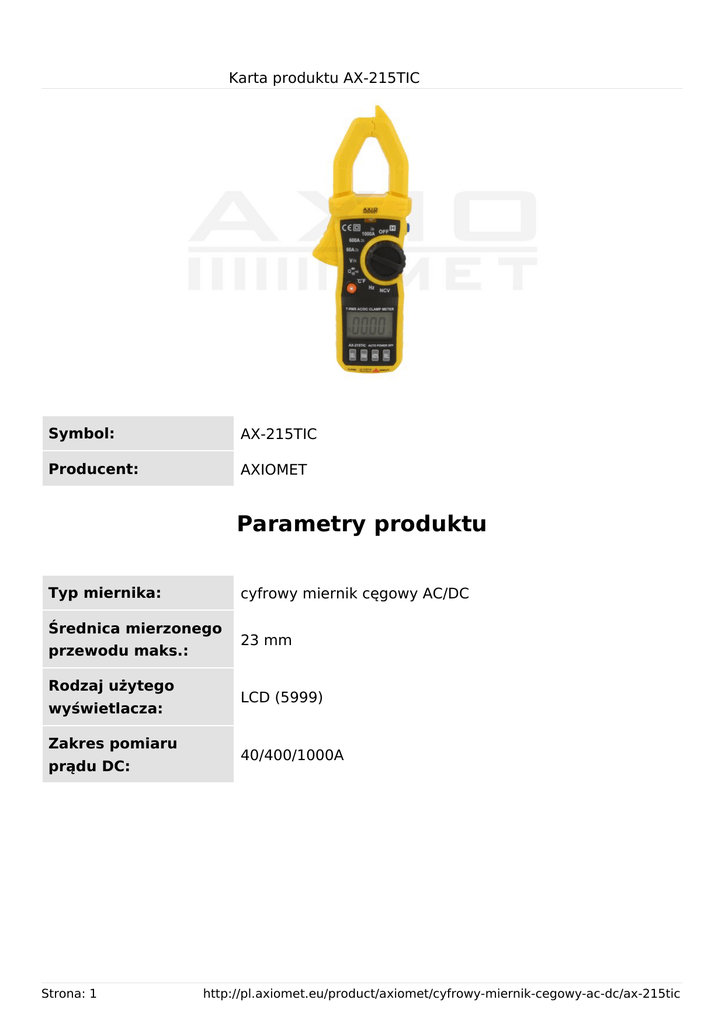 Karta produktu AX-215TIC Symbol: AX-215TIC Producent: AXIOMET Parametry produktu Typ miernika: cyfrowy miernik cęgowy AC/DC Średnica mierzonego przewodu maks.: Rodzaj użytego wyświetlacza: Zakres pomiaru prądu DC: Strona: 1 23 mm LCD (5999) 40/400/1000A http://pl.axiomet.eu/product/axiomet/cyfrowy-miernik-cegowy-ac-dc/ax-215tic Karta produktu AX-215TIC Właściwości automatyczna zmiana zakresów przyrządów automatyczne wyłączanie pomiarowych: funkcja HOLD (zatrzymanie wskazań wyświetlacza) funkcja pomiaru prądów rozruchowych sygnalizacja zużycia baterii wbudowana latarka wskaźnik przekroczenia zakresu pomiarowego Dokładność pomiaru prądu DC: Zakres pomiaru ±(2,5% + 10 cyfr) 40/400/1000A prądu AC: Dokładność pomiaru prądu AC: Zakres pomiaru ±(2,5% + 10 cyfr) 200m/2/20/200/1000V napięcia DC: Dokładność pomiaru napięcia DC: Zakres pomiaru ±(1% + 5 cyfr) 200m/2/20/200/1000V napięcia AC: Dokładność pomiaru napięcia AC: Pomiar rzeczywistej wartości skutecznej: Zakres pomiaru ±(1,2% + 5 cyfr) True RMS 200/2k/20k/200k/2M/60MΩ rezystancji: Dokładność pomiaru ±(0,8% + 5 cyfr) (2k...6MΩ), ±(1% + 10 cyfr) rezystancji: (200...600Ω), ±(2% + 10 cyfr) (20M...60MΩ) Zakres pomiaru pojemności: Strona: 2 10n/100n/1µ/10µ/100µ/1m/10mF http://pl.axiomet.eu/product/axiomet/cyfrowy-miernik-cegowy-ac-dc/ax-215tic Karta produktu AX-215TIC Dokładność pomiaru ±(4% + 15 cyfr) (100n...100µF), ±(4% + 25 cyfr) (10nF), pojemności: ±(4% + 25 cyfr) (1m...10mF) Zakres pomiaru 10...10MHz częstotliwości: Dokładność pomiaru częstotliwości: Zakres pomiaru ±(0,5% + 2 cyfry) -20...1000 °C temperatury: Dokładność pomiaru ±2% (zakres 0...400°C), ±3% (zakres 400...1000°C), ±5% temperatury: (zakres -20...0°C) Test ciągłości obwodu: sygnał akustyczny dla R Wymiary: 194 x 72 x 35 mm Źródło zasilania: 3 baterie 1,5V LR03 (AAA) Wyposażenie standardowe: futerał przewody pomiarowe sonda do pomiaru temperatury Pomiar: częstotliwości, napięcia AC, napięcia DC, pojemności, prądu AC, prądu DC, rezystancji, temperatury Informacje dodatkowe Masa brutto: Strona: 3 0,4 kg http://pl.axiomet.eu/product/axiomet/cyfrowy-miernik-cegowy-ac-dc/ax-215tic