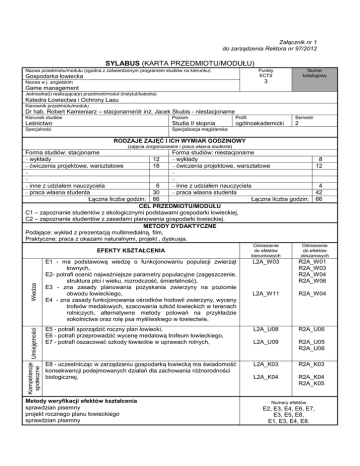 Załącznik nr 1 do zarządzenia Rektora nr 97/2012 SYLABUS (KARTA PRZEDMIOTU/MODUŁU) Nazwa przedmiotu/modułu (zgodna z zatwierdzonym programem studiów na kierunku) Punkty ECTS Gospodarka łowiecka Numer katalogowy 3 Nazwa w j. angielskim Game management Jednostka(i) realizująca(e) przedmiot/moduł (instytut/katedra) Katedra Łowiectwa i Ochrony Lasu Kierownik przedmiotu/modułu Dr hab. Robert Kamieniarz – stacjonarne/dr inż. Jacek Skubis - niestacjonarne Kierunek studiów Poziom Profil Semestr Leśnictwo Studia II stopnia ogólnoakademicki 2 Specjalność Specjalizacja magisterska RODZAJE ZAJĘĆ I ICH WYMIAR GODZINOWY (zajęcia zorganizowane i praca własna studenta) Forma studiów: stacjonarne wykłady ćwiczenia projektowe, warsztatowe 12 18 inne z udziałem nauczyciela praca własna studenta Forma studiów: niestacjonarne wykłady ćwiczenia projektowe, warsztatowe inne z udziałem nauczyciela praca własna studenta 6 30 Łączna liczba godzin: 66 CEL PRZEDMIOTU/MODUŁU C1 – zapoznanie studentów z ekologicznymi podstawami gospodarki łowieckiej, C2 – zapoznanie studentów z zasadami planowania gospodarki łowieckiej. METODY DYDAKTYCZNE Podające: wykład z prezentacją multimedialną, film, Praktyczne: praca z okazami naturalnymi, projekt , dyskusja. Wiedza EFEKTY KSZTAŁCENIA Kompetencje Umiejętności społeczne 8 12 Łączna liczba godzin: Odniesienie do efektów kierunkowych 4 42 66 Odniesienie do efektów obszarowych E1 - ma podstawową wiedzę o funkcjonowaniu populacji zwierząt łownych, E2- potrafi ocenić najważniejsze parametry populacyjne (zagęszczenie, struktura płci i wieku, rozrodczość, śmiertelność), E3 - zna zasady planowania pozyskania zwierzyny na poziomie obwodu łowieckiego, E4 - zna zasady funkcjonowania ośrodków hodowli zwierzyny, wyceny trofeów medalowych, szacowania szkód łowieckich w terenach rolniczych, alternatywne metody polowań na przykładzie sokolnictwa oraz rolę psa myśliwskiego w łowiectwie, L2A_W03 R2A_W01 R2A_W03 R2A_W04 R2A_W06 L2A_W11 R2A_W04 E5 - potrafi sporządzić roczny plan łowiecki, E6 - potrafi przeprowadzić wycenę medalową trofeum łowieckiego, E7 - potrafi oszacować szkody łowieckie w uprawach rolnych, L2A_U08 R2A_U06 L2A_U09 R2A_U05 R2A_U06 E8 - uczestnicząc w zarządzaniu gospodarką łowiecką ma świadomość konsekwencji podejmowanych działań dla zachowania różnorodności biologicznej. L2A_K03 R2A_K03 L2A_K04 R2A_K04 R2A_K05 Metody weryfikacji efektów kształcenia sprawdzian pisemny projekt rocznego planu łowieckiego sprawdzian pisemny Numery efektów E2, E3, E4, E6, E7, E3, E5, E8, E1, E3, E4, E8. TREŚCI KSZTAŁCENIA Wykłady: 1. Modele rozwoju i stabilizacji populacji zwierząt. Kształtowanie parametrów populacyjnych. 2. Kształtowanie środowiska życia zwierząt. 3. Możliwości sterowania populacjami zwierzyny grubej i zasady selekcji w populacjach łosia, jelenia, daniela, sarny, oraz muflona i dzika. 4. Odłowy, przesiedlenia, introdukcje i reintrodukcje. 5. Możliwości sterowania populacjami zwierzyny drobnej: zającowatych, kuraków polnych, drapieżników oraz ptactwa wodnego, w tym metody restytucji. 6. Szacowanie szkód łowieckich w uprawach rolnych oraz ocena uszkodzeń odnowień i młodych drzewostanów. 7. Ośrodki hodowli zwierzyny, sokolnictwo oraz elementy kynologii. Ćwiczenia: 1. Określanie podstawowych parametrów populacyjnych. 2. Zasady tworzenia rocznego planu łowieckiego i założenia do projektu. 3. Szacowanie szkód łowieckich w uprawach i płodach rolnych. 4. Wycena medalowa trofeów łowieckich. 5. Dyskusja nad projektami rocznych planów łowieckich. Formy i kryteria zaliczenia przedmiotu/modułu Procentowy udział w końcowej ocenie ćwiczenia: sprawdzian pisemny, projekt rocznego planu łowieckiego 50%, 50% wykłady: sprawdzian pisemny 100% WYKAZ LITERATURY 1. Brabletz A. (red.) 2013. Kynologia łowiecka. Oficyna Wydawnicza FOREST, Józefów. 2. Dziedzic R. (red.) 2011. Łowiecki podręcznik selekcjonera. Oficyna Wydawnicza FOREST, Józefów. 3. Dzięciołowski R. (red.) 2003. Poradnik zagospodarowania łowisk polnych i gospodarowania podstawowymi gatunkami zwierzyny drobnej. Wyd. Łowiec Polski, Warszawa. 4. Dzięciołowski R. Flis. M. (red.) 2011. Łowiectwo. Wyd. Łowiec Polski, Warszawa, t. I i II. 5. Fruziński B. 2002. Gospodarka łowiecka. Wyd. Łowiec Polski, Warszawa. 6. Kamieniarz R. 2013-14. Ekologia dla myśliwych – cykl artykułów. Łowiec Polski, nr 2/2013-8/2014. 7. Kamieniarz R. Panek M. 2008. Zwierzęta łowne w Polsce na przełomie XX i XXI wieku. Stacja Badawcza – OHZ PZŁ w Czempiniu. 8. Miścicki S. 1996. Sposób kontroli i oceny uszkodzeń młodych drzewostanów i odnowień podokapowych przez ssaki roślinożerne. Fundacja „Rozwój SGGW” Warszawa. 9. Ministerstwo Środowiska. 2007. Rozporządzenie w sprawie rocznych planów łowieckich i wieloletnich łowieckich planów hodowlanych. Dziennik Ustaw nr 221, poz. 1646. 10. Ministerstwo Środowiska. 2010. Rozporządzenie w sprawie sposobu postępowania przy szacowaniu szkód oraz wypłat odszkodowań za szkody w uprawach i płodach rolnych. Dziennik Ustaw nr 45, poz. 272. 11. Naczelna Rada Łowiecka. 2007. Zasady selekcji osobniczej i populacyjnej zwierząt łownych w Polsce oraz zasady postępowania przy ocenie prawidłowości odstrzału. www.pzlow.pl. 12. Okarma H. Tomek A. (red.) 2008. Łowiectwo. Wyd. Naukowo-Edukacyjne H2O, Kraków. 13. PGL Lasy Państwowe. 2012. Instrukcja ochrony lasu. t. II, cz. II: 46. 14. Wójcik M. 2003. Szacowanie szkód łowieckich. Wyd. Zachodni Poradnik Łowiecki, Piła. 15. Zalewski K. (red.) 2015. Szkody łowieckie. Oficyna Wydawnicza FOREST, Józefów.