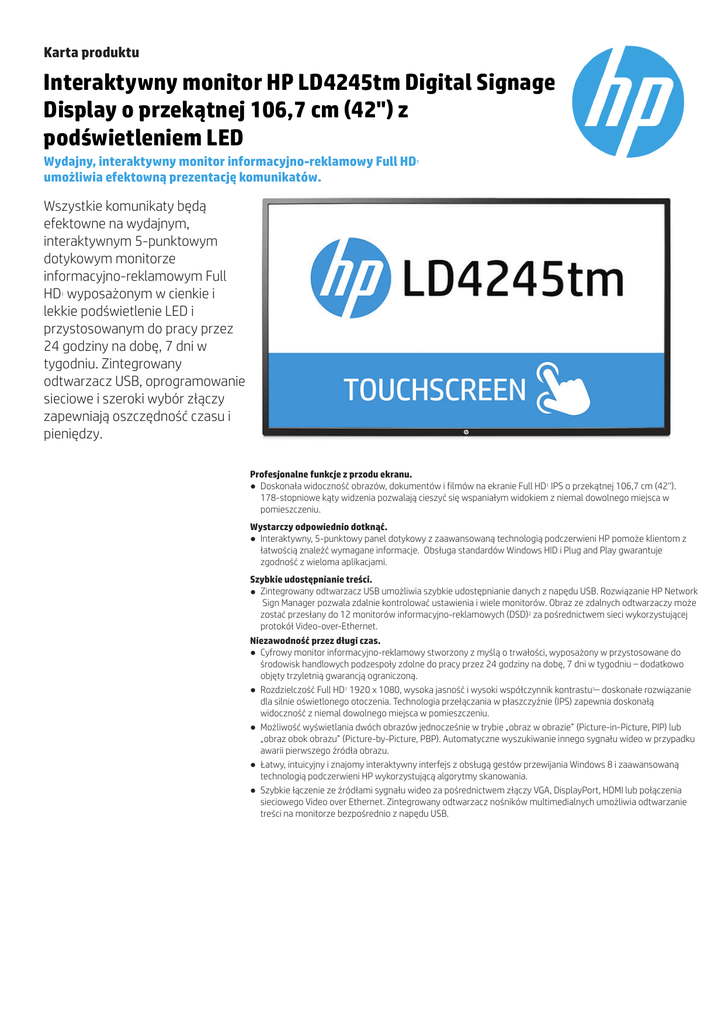 Karta produktu Interaktywny monitor HP LD4245tm Digital Signage Display o przekątnej 106,7 cm (42'') z podświetleniem LED Wydajny, interaktywny monitor informacyjno-reklamowy Full HD umożliwia efektowną prezentację komunikatów. 1 Wszystkie komunikaty będą efektowne na wydajnym, interaktywnym 5-punktowym dotykowym monitorze informacyjno-reklamowym Full HD wyposażonym w cienkie i lekkie podświetlenie LED i przystosowanym do pracy przez 24 godziny na dobę, 7 dni w tygodniu. Zintegrowany odtwarzacz USB, oprogramowanie sieciowe i szeroki wybór złączy zapewniają oszczędność czasu i pieniędzy. 1 Profesjonalne funkcje z przodu ekranu. ● Doskonała widoczność obrazów, dokumentów i filmów na ekranie Full HD1 IPS o przekątnej 106,7 cm (42''). 178-stopniowe kąty widzenia pozwalają cieszyć się wspaniałym widokiem z niemal dowolnego miejsca w pomieszczeniu. Wystarczy odpowiednio dotknąć. ● Interaktywny, 5-punktowy panel dotykowy z zaawansowaną technologią podczerwieni HP pomoże klientom z łatwością znaleźć wymagane informacje. Obsługa standardów Windows HID i Plug and Play gwarantuje zgodność z wieloma aplikacjami. Szybkie udostępnianie treści. ● Zintegrowany odtwarzacz USB umożliwia szybkie udostępnianie danych z napędu USB. Rozwiązanie HP Network Sign Manager pozwala zdalnie kontrolować ustawienia i wiele monitorów. Obraz ze zdalnych odtwarzaczy może zostać przesłany do 12 monitorów informacyjno-reklamowych (DSD)2 za pośrednictwem sieci wykorzystującej protokół Video-over-Ethernet. Niezawodność przez długi czas. ● Cyfrowy monitor informacyjno-reklamowy stworzony z myślą o trwałości, wyposażony w przystosowane do środowisk handlowych podzespoły zdolne do pracy przez 24 godziny na dobę, 7 dni w tygodniu – dodatkowo objęty trzyletnią gwarancją ograniczoną. ● Rozdzielczość Full HD1 1920 x 1080, wysoka jasność i wysoki współczynnik kontrastu3– doskonałe rozwiązanie dla silnie oświetlonego otoczenia. Technologia przełączania w płaszczyźnie (IPS) zapewnia doskonałą widoczność z niemal dowolnego miejsca w pomieszczeniu. ● Możliwość wyświetlania dwóch obrazów jednocześnie w trybie „obraz w obrazie” (Picture-in-Picture, PIP) lub „obraz obok obrazu” (Picture-by-Picture, PBP). Automatyczne wyszukiwanie innego sygnału wideo w przypadku awarii pierwszego źródła obrazu. ● Łatwy, intuicyjny i znajomy interaktywny interfejs z obsługą gestów przewijania Windows 8 i zaawansowaną technologią podczerwieni HP wykorzystującą algorytmy skanowania. ● Szybkie łączenie ze źródłami sygnału wideo za pośrednictwem złączy VGA, DisplayPort, HDMI lub połączenia sieciowego Video over Ethernet. Zintegrowany odtwarzacz nośników multimedialnych umożliwia odtwarzanie treści na monitorze bezpośrednio z napędu USB. Karta produktu Interaktywny monitor HP LD4245tm Digital Signage Display o przekątnej 106,7 cm (42'') z podświetleniem LED Tabela specyfikacji Numer produktu F1M93AA; Rozmiar wyświetlacza (przekątna) 106,7 cm (42") Kąt podglądu 178° w poziomie; 178° w pionie Jasność 300 cd/m²1 Współczynnik kontrastu 1000:1 statyczny; 500 000:1 dynamiczny1 Wskaźnik odpowiedzi 6 ms (od szarości do szarości)1 Współczynnik kształtu 16:9 Rozdzielczość własna 1920 X 1080 Obsługiwane rozdzielczości 1920 x 1080; 1680 x 1050; 1600 x 900; 1440 x 900; 1280 x 1024; 1280 x 800; 1280 x 720; 1024 x 768; 800 x 600; 720 x 400; 640 x 480 Funkcje wyświetlacza Powłoka antyrefleksyjna; Wybór języka; Plug and Play; Opcje sterowania; Konfiguracja przez użytkownika; Podświetlenie LED; Obsługa interfejsu dotykowego Kontrolki użytkownika Wprowadzanie danych; Menu; W prawo (dostosowuje ustawienia w prawo); W lewo (dostosowuje ustawienia w lewo); W górę (dostosowuje ustawienia w górę); W dół (dostosowuje ustawienia w dół); Regulacja automatyczna; Zasilanie Sygnał wejściowy 1 wejście VGA; 1 wyjście VGA; 1 wejście DisplayPort 1.1a (z obsługą HDCP); 1 wyjście DisplayPort 1.1a; 1 złącze HDMI (z obsługą HDCP) Porty i złącza 1 port USB 2.0; 1 wejście audio; 1 port RJ-45; 1 wejście podczerwieni1 (1 port do użytku z odtwarzaczem HP Media Sign Player, port typu A) Moc wyjściowa Napięcie wejściowe: 100–240 V Wymiary bez stojaka (szer. x głęb. x wys.) 99,09 x 9,53 x 58,5 cm Waga 15,9 kg Ochrona środowiska Podświetlenie niezawierające rtęci; Panel wyświetlacza niezawierający arsenu; Gwarancja 3-letnia ograniczona gwarancja, obejmująca 3 lata gwarancji na części, robociznę i serwis u klienta w następnym dniu roboczym. Warunki mogą być różne w zależności od kraju. Obowiązują pewne ograniczenia i wyłączenia. Karta produktu Interaktywny monitor HP LD4245tm Digital Signage Display o przekątnej 106,7 cm (42'') z podświetleniem LED Akcesoria i usługi (nie wchodzą w skład zestawu) Zestaw głośników do dużego wyświetlacza HP Pełen zakres częstotliwości dźwięku dzięki tylnym głośnikom (10 W każdy), które można dyskretnie przyłączyć z tyłu monitora informacyjno-reklamowego. Zestaw podstawy LD4235/LD4735/LD4245tm /LD4745tm Podstawy firmy HP umożliwiają zmianę orientacji monitora. 5 lata, serwis w następnym dniu roboczym, w miejscu instalacji Jeśli problemu nie można rozwiązać zdalnie, naprawa urządzenia ostanie przeprowadzona przez specjalistę zakwalifikowanego przez HP, w miejscu instalacji, w następnym dniu roboczym — usługa ta jest dostępna przez 5 lat Numer produktu: UE370E Numer produktu: F2B36AA Numer produktu: F2B37AA Więcej informacji znajdziesz pod adresem www.hp.eu/hpoptions Karta produktu Interaktywny monitor HP LD4245tm Digital Signage Display o przekątnej 106,7 cm (42'') z podświetleniem LED Przypisy dotyczące wiadomości Do wyświetlania obrazów w jakości HD wymagane są treści w jakości HD. Sprzedawane osobno. Wszystkie parametry techniczne odpowiadają typowym danym technicznym udostępnianym przez