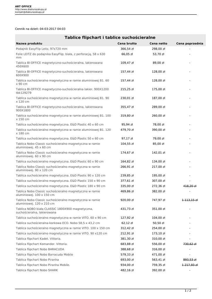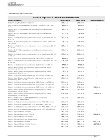 ART OFFICE http://www.dlabiurazakupy.pl [email protected] Cennik na dzień: 04-03-2017 04:03 Tablice flipchart i tablice suchościeralne Nazwa produktu Cena brutto Cena netto Cena poprzednia 366,54 zł 298,00 zł - 66,05 zł 53,70 zł - Tablica BI-OFFICE magnetyczno-suchościeralna, lakierowana 450X600 109,47 zł 89,00 zł - Tablica BI-OFFICE magnetyczno-suchościeralna, lakierowana 600X900 157,44 zł 128,00 zł - Tablica suchościeralno magnetyczna w ramie aluminiowej B1. 60 x 90 cm 157,44 zł 128,00 zł - Tablica BI-OFFICE magnetyczno-suchościeralna lakier. 900X1200 tbk129279 215,25 zł 175,00 zł - Tablica suchościeralno magnetyczna w ramie aluminiowej B1. 90 x 120 cm 230,01 zł 187,00 zł - Tablica BI-OFFICE magnetyczno-suchościeralna, lakierowana 900X1800 355,47 zł 289,00 zł - Tablica suchościeralno magnetyczna w ramie aluminiowej B1. 100 x 150 cm 319,80 zł 260,00 zł - 95,94 zł 78,00 zł - 479,70 zł 390,00 zł - Podajnik EasyFlip Leitz, 97x720 mm Folie LEITZ do podajnika EasyFlip; biała, z perforacją, 58 x 630 mm Tablica suchościeralno magnetyczna. E&D Plastic 40 x 60 cm Tablica suchościeralno magnetyczna w ramie aluminiowej B1. 120 x 180 cm Tablica suchościeralno magnetyczna. E&D Plastic 50 x 60 cm 97,17 zł 79,00 zł - Tablica Nobo Classic suchościeralno magnetyczna w ramie aluminiowej. 45 x 60 cm 104,55 zł 85,00 zł - Tablica Nobo Classic suchościeralno magnetyczna w ramie aluminiowej. 60 x 90 cm 174,67 zł 142,01 zł - Tablica suchościeralno magnetyczna. E&D Plastic 60 x 90 cm 164,82 zł 134,00 zł - Tablica Nobo Classic suchościeralno magnetyczna w ramie aluminiowej. 90 x 120 cm 266,91 zł 217,00 zł - Tablica suchościeralno magnetyczna. E&D Plastic 90 x 120 cm 239,85 zł 195,00 zł - Tablica suchościeralno magnetyczna. E&D Plastic 150 x 90 cm 377,61 zł 307,00 zł - Tablica suchościeralno magnetyczna. E&D Plastic 180 x 90 cm 335,00 zł 272,36 zł 418,20 zł Tablica Nobo Classic suchościeralno magnetyczna w ramie aluminiowej. 100 x 150 cm 469,86 zł 382,00 zł - Tablica Nobo Classic suchościeralno magnetyczna w ramie aluminiowej. 120 x 210 cm 920,00 zł 747,97 zł 1 113,15 zł Tablica NOBO biała CLASSIC 1800X900 magnetyczna, suchościeralna, lakierowana 431,73 zł 351,00 zł - Tablica suchościeralno magnetyczna w ramie VITO. 60 x 90 cm 127,92 zł 104,00 zł - 62,12 zł 50,50 zł - Tablica suchościeralno magnetyczna w ramie VITO. 100 x 150 cm 312,42 zł 254,00 zł - Tablica suchościeralno magnetyczna w ramie VITO. 90 x120 cm 212,91 zł 173,10 zł - Tablica flipchart Kadet. Vittoria. 381,30 zł 310,00 zł - Tablica flipchart Komandor. Vittoria. 683,88 zł 556,00 zł 730,62 zł Tablica flipchart Nobo BARACUDA 388,68 zł 316,00 zł - Tablica flipchart Nobo Barracuda Mobile 579,33 zł 471,00 zł - Tablica flipchart Nobo Piranha 693,00 zł 563,41 zł 893,53 zł Tablica flipchart Nobo Piranha Mobile. 934,00 zł 759,35 zł 1 217,93 zł Tablica flipchart Nobo SHARK 482,16 zł 392,00 zł - Tablica suchościeralna-korkowa ECO. Nobo 58,5 x 43,2 cm 1/2 ART OFFICE http://www.dlabiurazakupy.pl [email protected] 2/2 Powered by TCPDF (www.tcpdf.org)