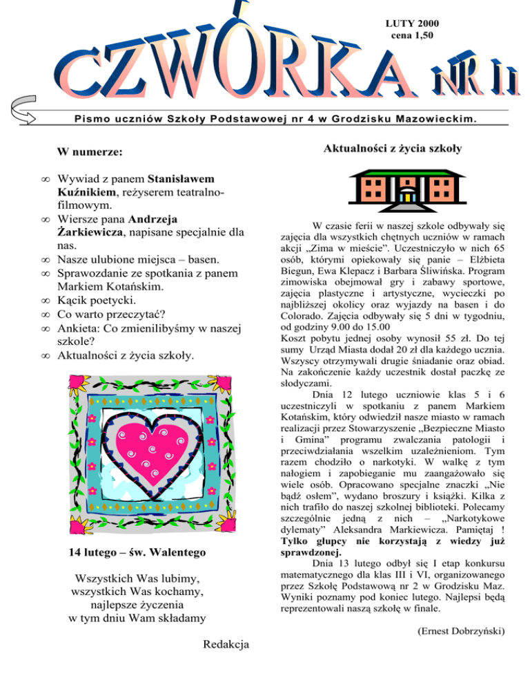 LUTY 2000 cena 1,50 Pismo uczniów Szkoły Podstawowej nr 4 w Grodzisku Mazowieckim. Aktualności z życia szkoły W numerze: • Wywiad z panem Stanisławem Kuźnikiem, reżyserem teatralnofilmowym. • Wiersze pana Andrzeja Żarkiewicza, napisane specjalnie dla nas. • Nasze ulubione miejsca – basen. • Sprawozdanie ze spotkania z panem Markiem Kotańskim. • Kącik poetycki. • Co warto przeczytać? • Ankieta: Co zmienilibyśmy w naszej szkole? • Aktualności z życia szkoły. 14 lutego – św. Walentego Wszystkich Was lubimy, wszystkich Was kochamy, najlepsze życzenia w tym dniu Wam składamy W czasie ferii w naszej szkole odbywały się zajęcia dla wszystkich chętnych uczniów w ramach akcji „Zima w mieście”. Uczestniczyło w nich 65 osób, którymi opiekowały się panie – Elżbieta Biegun, Ewa Klepacz i Barbara Śliwińska. Program zimowiska obejmował gry i zabawy sportowe, zajęcia plastyczne i artystyczne, wycieczki po najbliższej okolicy oraz wyjazdy na basen i do Colorado. Zajęcia odbywały się 5 dni w tygodniu, od godziny 9.00 do 15.00 Koszt pobytu jednej osoby wynosił 55 zł. Do tej sumy Urząd Miasta dodał 20 zł dla każdego ucznia. Wszyscy otrzymywali drugie śniadanie oraz obiad. Na zakończenie każdy uczestnik dostał paczkę ze słodyczami. Dnia 12 lutego uczniowie klas 5 i 6 uczestniczyli w spotkaniu z panem Markiem Kotańskim, który odwiedził nasze miasto w ramach realizacji przez Stowarzyszenie „Bezpieczne Miasto i Gmina” programu zwalczania patologii i przeciwdziałania wszelkim uzależnieniom. Tym razem chodziło o narkotyki. W walkę z tym nałogiem i zapobieganie mu zaangażowało się wiele osób. Opracowano specjalne znaczki „Nie bądź osłem”, wydano broszury i książki. Kilka z nich trafiło do naszej szkolnej biblioteki. Polecamy szczególnie jedną z nich – „Narkotykowe dylematy” Aleksandra Markiewicza. Pamiętaj ! Tylko głupcy nie korzystają z wiedzy już sprawdzonej. Dnia 13 lutego odbył się I etap konkursu matematycznego dla klas III i VI, organizowanego przez Szkołę Podstawową nr 2 w Grodzisku Maz. Wyniki poznamy pod koniec lutego. Najlepsi będą reprezentowali naszą szkołę w finale. (Ernest Dobrzyński) Redakcja Które ze swoich prac najwyżej oceniasz? NASZ WYWIAD Wywiad z panem Stanisławem Kuźnikiem reżyserem teatralno-filmowym przeprowadził syn Janek, uczeń klasy 5 b Kiedy i dlaczego wybrałeś zawód reżysera? Dokładnie nie pamiętam, ale myślę, że było to przed maturą. Mieszkałem na wsi, szkoła średnia do której chodziłem znajdowała się w małym mieście, gdzie największą i właściwie jedyną rozrywką było kino. Nazywało się „Jutrzenka”. Było to najlepsze miejsce, do wagarowania. W ciemnościach sali kinowej trudno było nas znaleźć nawet najbardziej gorliwym nauczycielom. Świat był szary, szkoła nieciekawa i życie monotonne. Prawdziwe emocje znajdowaliśmy na kolorowym ekranie kinowym. Myślę, że zostałem reżyserem po prostu dlatego, że sam chciałem tworzyć takie kolorowe, fascynujące światy. Gdzie się musiałeś uczyć? Pierwszą moją uczelnią był Uniwersytet Poznański, który ukończyłem z dyplomem socjologa. Wiedza o społeczeństwie i prawach nim rządzących pomaga mi w pracy twórczej. Po ukończeniu mogłem podjąć podyplomowe studia reżyserskie na Uniwersytecie Śląskim w Katowicach. Nad czym teraz pracujesz? Razem z grupą współpracowników realizuję serial dokumentalny „Centrum nadziei”. Pełnię funkcje współreżysera oraz edytora, czyli osoby odpowiedzialnej za ekranowy (końcowy) kształt filmu. Czy miałeś jakąś ciekawą przygodę przy pracy? Kiedyś reżyserowałem sztukę dla Teatru Telewizji, a było to w latach osiemdziesiątych. W czasie próby aktorzy (w przedstawieniu grali m.in. Barbara Wrzesińska, Marian Kociniak i Alina Janowska) zaczęli krytykować ówczesny rząd. Wtedy bodajże pan Kociniak oświadczył, że jak nie przestaną, to wyłączą nam światło, żebyśmy rozeszli się do domów. Ledwo to powiedział w gmachu telewizji zapanowały ciemności. Nastąpiła awaria sieci elektrycznej. Najwięcej pracy włożyłem w film fabularny „Moja Angelika”. Największą widownię ma serial „Centrum nadziei”, który ogląda co tydzień 1,5 do 2,0 milionów ludzi. Najbardziej nerwową, ale i satysfakcjonującą była praca przy reżyserii sztuk teatralnych. Wielu ciekawych ludzi i sporo interesujących miejsc poznałem przy okazji realizacji kilkudziesięciu reportaży i filmów dokumentalnych dla TVP. Czy masz jakieś hobby? Dobra muzyka i długie samochodem z dala od ruchliwych tras. podróże Dzięki, tato, za wywiad. (Jan Kuźnik) Co zmienił(a)byś w naszej szkole? Michał Bieganowski (V b): Zdecydowanie skróciłbym lekcje. Paweł Żegliński (V a): Chciałbym, żeby przy naszej szkole wybudowano taką halę sportową, jaką ma SP2 Piotr Dorociński (VI a): Można byłoby się zastanowić nad zainstalowaniem windy. Zdecydowanie uprościłoby to komunikację. Iza Kopeć (VI b): Na pewno – wymienić okna albo je pomalować. Arek Wargocki (VI b): Kiedyś codziennie rano losowano numerek ucznia, który dzięki temu nie musiał odpowiadać z żadnego przedmiotu w tym dniu. Chciałbym, żebyśmy znów zorganizowali takie losowanie. Sandra Brzezińska (VI c): Myślę, że najważniejszą rzeczą jest wymiana koszy i drzwi od toalet. Pani Bogumiła Krzywicka: Moim zdaniem należy dostawić więcej ławek na korytarzach przy salach lekcyjnych. Dobrze byłoby jednak, żeby uczniowie dbali o porządek, ustawiali ławki przy ścianach, gdyż porozstawiane bezładnie zagrażają bezpieczeństwu i nie wyglądają estetycznie. Pan Andrzej Żarkiewicz: Marzę o tym, co jest zupełnie nierealne. Chciałbym, żeby klasy były mniej liczne. Skorzystalibyśmy na tym wszyscy. (pytał Bartek Okurowski) KĄCIK ( a nawet cały kąt) POETYCKI Specjalnie dla nas, dwa nowiutkie, jeszcze pachnące świeżością 