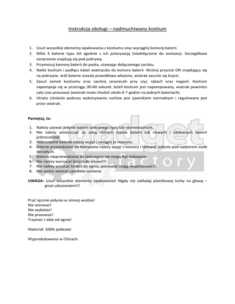 Instrukcja obsługi – nadmuchiwany kostium 1. Usuń wszystkie elementy opakowania z kostiumu oraz wyciągnij komorę baterii. 2. Włóż 4 baterie typu AA zgodnie z ich polaryzacją (niedołączone do zestawu). Szczegółowe oznaczenia znajdują się pod pokrywą. 3. Przymocuj komorę baterii do paska, używając dołączonego zacisku. 4. Nałóż kostium i podłącz kabel wiatraczka do komory baterii. Wciśnij przycisk ON znajdujący się na pokrywie. Jeśli baterie zostały prawidłowo włożone, wiatrak zacznie się kręcić. 5. Zasuń zamek kostiumu oraz zaciśnij sznureczki przy szyi, rękach oraz nogach. Kostium napompuje się w przeciągu 30-60 sekund. Jeżeli kostium jest napompowany, wiatrak powinien cały czas pracować (wiatrak może chodzić około 6-7 godzin na jednych bateriach). 6. Utrata ciśnienia podczas wykonywania ruchów jest zjawiskiem normalnym i regulowana jest przez wiatrak. Pamiętaj, że: 1. Należy używać jedynie baterii zalecanego typu lub równoważnych. 2. Nie należy umieszczać ze sobą różnych typów baterii lub nowych i używanych baterii jednocześnie. 3. Wyczerpane baterie należy wyjąć i zastąpić je nowymi. 4. Baterie przewidziane do ładowania należy wyjąć z komory i ładować jedynie pod nadzorem osób dorosłych. 5. Baterie nieprzewidziane do ładowania nie mogą być ładowane. 6. Nie należy wyrzucać baterii do śmieci!!! 7. Nie należy wrzucać baterii do ognia, ponieważ mogą eksplodować!!! 8. Nie wolno zwierać zacisków zasilania. UWAGA: Usuń wszystkie elementy opakowania! Nigdy nie zakładaj plastikowej torby na głowę – grozi uduszeniem!!! Prać ręcznie jedynie w zimnej wodzie! Nie wirować! Nie wybielać! Nie prasować! Trzymać z dala od ognia! Materiał: 100% poliester Wyprodukowano w Chinach.