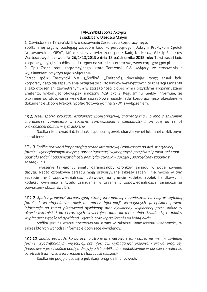 TARCZYŃSKI Spółka Akcyjna z siedzibą w Ujeźdźcu Małym 1. Oświadczenie Tarczyński S.A. o stosowaniu Zasad Ładu Korporacyjnego. Spółka i jej organy podlegają zasadom ładu korporacyjnego „Dobrym Praktykom Spółek Notowanych na GPW”, które zostały zatwierdzone przez Radę Nadzorczą Giełdy Papierów Wartościowych uchwałą Nr 26/1413/2015 z dnia 13 października 2015 roku Tekst zasad ładu korporacyjnego jest publicznie dostępny na stronie internetowej www.corp-gov.gpw.pl. 2. Opis Zasad Ładu Korporacyjnego, które Tarczyński S.A. wyłączył ze stosowania z wyjaśnieniem przyczyn tego wyłączenia. Zarząd spółki Tarczyński S.A. („Spółka", „Emitent"), doceniając rangę zasad ładu korporacyjnego dla zapewnienia przejrzystości stosunków wewnętrznych oraz relacji Emitenta z jego otoczeniem zewnętrznym, a w szczególności z obecnymi i przyszłymi akcjonariuszami Emitenta, wykonując obowiązek nałożony §29 pkt 3 Regulaminu Giełdy informuje, że przyjmuje do stosowania wszystkie szczegółowe zasady ładu korporacyjnego określone w dokumencie „Dobre Praktyki Spółek Notowanych na GPW" z wyłączeniem: I.R.2. Jeżeli spółka prowadzi działalność sponsoringową, charytatywną lub inną o zbliżonym charakterze, zamieszcza w rocznym sprawozdaniu z działalności informację na temat prowadzonej polityki w tym zakresie. Spółka nie prowadzi działalności sponsoringowej, charytatywnej lub innej o zbliżonym charakterze. I.Z.1.3. Spółka prowadzi korporacyjną stronę internetową i zamieszcza na niej, w czytelnej formie i wyodrębnionym miejscu, oprócz informacji wymaganych przepisami prawa: schemat podziału zadań i odpowiedzialności pomiędzy członków zarządu, sporządzony zgodnie z zasadą II.Z.1. Tworzenie takiego schematu ograniczałoby członków zarządu w podejmowaniu decyzji. Nadto członkowie zarządu mają przypisywane zakresy zadań i nie można w tym aspekcie mylić odpowiedzialności ustawowej na gruncie kodeksu spółek handlowych i kodeksu cywilnego z tytułu zasiadania w organie z odpowiedzialnością zarządczą za powierzony obszar działań. I.Z.1.9. Spółka prowadzi korporacyjną stronę internetową i zamieszcza na niej, w czytelnej formie i wyodrębnionym miejscu, oprócz informacji wymaganych przepisami prawa: informacje na temat planowanej dywidendy oraz dywidendy wypłaconej przez spółkę w okresie ostatnich 5 lat obrotowych, zawierające dane na temat dnia dywidendy, terminów wypłat oraz wysokości dywidend - łącznie oraz w przeliczeniu na jedną akcję. Spółka jest na etapie dostosowania strony w zakresie umieszczenia wiadomości, w zakres których wchodzą informacje dotyczące dywidendy. I.Z.1.10. Spółka prowadzi korporacyjną stronę internetową i zamieszcza na niej, w czytelnej formie i wyodrębnionym miejscu, oprócz informacji wymaganych przepisami prawa: prognozy finansowe – jeżeli spółka podjęła decyzję o ich publikacji - opublikowane w okresie co najmniej ostatnich 5 lat, wraz z informacją o stopniu ich realizacji Spółka nie podjęła decyzji o publikacji prognoz finansowych. I.Z.1.11. Spółka prowadzi korporacyjną stronę internetową i zamieszcza na niej, w czytelnej formie i wyodrębnionym miejscu, oprócz informacji wymaganych przepisami prawa: informację o treści obowiązującej w spółce reguły dotyczącej zmieniania podmiotu uprawnionego do badania sprawozdań finansowych, bądź też o braku takiej reguły. Spółka stosuje się do treści art. 89 Ustawy z dnia 7 maja 2009 r. o biegłych rewidentach i ich samorządzie, podmiotach uprawnionych do badania sprawozdań finansowych oraz o nadzorze publicznym. Art. 89. 1. Kluczowy biegły rewident nie może wykonywać czynności rewizji finansowej w tej samej jednostce zainteresowania publicznego w okresie dłuższym niż 5 lat. 2. Kluczowy biegły rewident może ponownie wykonywać czynności rewizji finansowej w jednostce, o której mowa w ust. 1, po upływie co najmniej 2 lat. I.Z.1.15. Spółka prowadzi korporacyjną stronę internetową i zamieszcza na niej, w czytelnej formie i wyodrębnionym miejscu, oprócz informacji wymaganych przepisami prawa: informację zawierającą opis stosowanej przez spółkę polityki różnorodności w odniesieniu do władz spółki oraz jej kluczowych menedżerów; opis powinien uwzględniać takie elementy polityki różnorodności, jak płeć, kierunek wykształcenia, wiek, doświadczenie zawodowe, a także wskazywać cele stosowanej polityki różnorodności i sposób jej realizacji w danym okresie sprawozdawczym; jeżeli spółka nie opracowała i nie realizuje polityki różnorodności, zamieszcza na swojej stronie internetowej wyjaśnienie takiej decyzji. Spółka nie wdrożyła do chwili obecnej niniejszej zasady albowiem wybór kadry zarządzającej i nadzorującej w Spółce dokonuje się zgodnie z obowiązującymi przepisami co zapewnia dobór kompetentnych osób na właściwe stanowiska. I.Z.1.16. Spółka prowadzi korporacyjną stronę internetową i zamieszcza na niej, w czytelnej formie i wyodrębnionym miejscu, oprócz informacji wymaganych przepisami prawa: informację na temat planowanej transmisji obrad walnego zgromadzenia - nie później niż w terminie 7 dni przed datą walnego zgromadzenia. Spółka nie zamierza stosować tej zasady z uwagi na ograniczenia i ryzyka techniczne oraz stosunkowo wysokie koszty wdrożenia. Spółka dotychczas nie prowadziła transmisji obrad walnego zgromadzenia; w przypadku, gdy Spółka zdecyduje o przygotowaniu transmisji obrad konkretnego walnego zgromadzenia, niezwłocznie opublikuje przedmiotową informację na swojej stronie internetowej. I.Z.1.20. Spółka prowadzi korporacyjną stronę internetową i zamieszcza na niej, w czytelnej formie i wyodrębnionym miejscu, oprócz informacji wymaganych przepisami prawa: zapis przebiegu obrad walnego zgromadzenia, w formie audio lub wideo. Spółka nie zamierza wdrażać tej zasady, pon