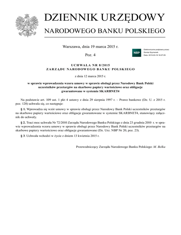 DZIENNIK URZĘDOWY NARODOWEGO BANKU POLSKIEGO Warszawa, dnia 19 marca 2015 r. Poz. 4 Elektronicznie podpisany przez: Dorota Szymanek Data: 2015-03-19 16:27:29 UC H WA Ł A N r 8 /2 015 Z A R Z Ą DU NA ROD OW EG O BA N K U POLSK I EG O z dnia 12 marca 2015 r. w sprawie wprowadzenia wzoru umowy w sprawie obsługi przez Narodowy Bank Polski uczestników przetargów na skarbowe papiery wartościowe oraz obligacje gwarantowane w systemie SKARBNET4 Na podstawie art. 109 ust. 1 pkt 4 ustawy z dnia 29 sierpnia 1997 r. – Prawo bankowe (Dz. U. z 2015 r. poz. 128) uchwala się, co następuje: § 1. Wprowadza się wzór umowy w sprawie obsługi przez Narodowy Bank Polski uczestników przetargów na skarbowe papiery wartościowe oraz obligacje gwarantowane w systemie SKARBNET4, stanowiący załącznik do uchwały. § 2. Traci moc uchwała Nr 72/2010 Zarządu Narodowego Banku Polskiego z dnia 23 grudnia 2010 r. w sprawie wprowadzenia wzoru umowy w sprawie obsługi przez Narodowy Bank Polski uczestników przetargów na skarbowe papiery wartościowe oraz obligacje gwarantowane (Dz. Urz. NBP Nr 20, poz. 23). § 3. Uchwała wchodzi w życie z dniem 13 kwietnia 2015 r. Przewodniczący Zarządu Narodowego Banku Polskiego: M. Belka Dziennik Urzędowy Narodowego Banku Polskiego –2– Poz. 4 Załącznik do uchwały nr 8/2015 Zarządu Narodowego Banku Polskiego z dnia 12 marca 2015 r. (poz. 4) UMOWA W SPRAWIE OBSŁUGI PRZEZ NARODOWY BANK POLSKI UCZESTNIKÓW PRZETARGÓW NA SKARBOWE PAPIERY WARTOŚCIOWE ORAZ OBLIGACJE GWARANTOWANE W SYSTEMIE SKARBNET4 zawarta w dniu ............................................... w Warszawie pomiędzy Narodowym Bankiem Polskim, zwanym dalej „NBP”, reprezentowanym przez: 1) ........................................................................................................................................., (imię i nazwisko oraz tytuł reprezentacji) 2) ........................................................................................................................................., (imię i nazwisko oraz tytuł reprezentacji) a ........................................................................................................................................................................................................., (nazwa uczestnika przetargów na skarbowe papiery wartościowe oraz obligacje gwarantowane) z siedzibą w .................................................................................................................................................................................., (dokładny adres) zwanym dalej „uczestnikiem przetargów”, reprezentowanym przez: 1) ........................................................................................................................................., (imię i nazwisko oraz tytuł reprezentacji) 2) ........................................................................................................................................., (imię i nazwisko oraz tytuł reprezentacji) zwanymi dalej „stronami”, zwana dalej „Umową”. Strony ustalają, co następuje: § 1. Użyte w Umowie wyrażenia oznaczają: 1) DOK – Departament Operacji Krajowych w Centrali NBP; 2) PW – skarbowe papiery wartościowe oraz obligacje gwarantowane emitowane przez Bank Gospodarstwa Krajowego na rzecz Krajowego Funduszu Drogowego, poręczone lub gwarantowane przez Skarb Państwa; 3) system SKARBNET4 – działający w DOK system rejestracji bonów skarbowych i bonów pieniężnych NBP, w którym prowadzone są przez NBP rachunki i konta depozytowe tych bonów; w systemie realizowana jest także obsługa przez NBP uczestników przetargów na PW; 4) uczestnik systemu SKARBNET4 – podmiot, dla którego NBP prowadzi rachunek i konto depozytowe bonów skarbowych i bonów pieniężnych NBP w systemie SKARBNET4; 5) KDPW – Krajowy Depozyt Papierów Wartościowych S.A.; Dziennik Urzędowy Narodowego Banku Polskiego –3– Poz. 4 6) bezpieczne połączenie – dwustronnie uwierzytelnione, poufne i integralne połączenie nawiązywane między usługą na serwerach NBP a przeglądarką internetową na stacji uczestnika przetargów podłączonej do sieci Internet; 7) pakiet kryptograficzny – certyfikat i klucz kryptograficzny niezbędny do nawiązania bezpiecznego połączenia z NBP poprzez przeglądarkę internetową; 8) rachunek bankowy – rachunek w złotych prowadzony w NBP dla banków w systemie SORBNET2; 9) akcja w systemie SKARBNET4 – dokonanie czynności logicznej wynikającej z funkcjonalności tego systemu, którego interfejs udostępniony jest uczestnikowi przetargów; 10) uczestnik rozliczający: a) transakcje na bonach skarbowych – bank będący uczestnikiem systemu SKARBNET4, którego konto depozytowe bonów skarbowych jest obciążane i uznawane w związku z transakcjami na wszystkich rodzajach przetargów na bony skarbowe, zawartymi przez uczestnika przetargów niebędącego uczestnikiem systemu SKARBNET4 oraz dokonywane jest z tego tytułu obciążanie lub uznawanie jego rachunku bankowego, b) transakcje na obligacjach – uczestnik KDPW będący posiadaczem konta depozytowego lub rachunku papierów wartościowych prowadzonego w KDPW, które to konto lub rachunek jest uznawane lub obciążane w związku z transakcjami na wszystkich rodzajach przetargów na obligacje skarbowe oraz obligacje gwarantowane, zawartymi przez uczestnika przetargów niebędącego uczestnikiem KDPW. § 2. 1. NBP zobowiązuje się do prowadzenia obsługi uczestnika przetargów w zakresie dotyczącym jego uczestnictwa w przetargach na PW organizowanych przez NBP. 2. System SKARBNET4 dostępny jest dla uczestnika przetargów poprzez przeglądarkę internetową. Przeglądarki zalecane przez NBP: Internet Explorer od wersji 8.0 oraz Firefox od wersji 18.0. W celu zapewnienia bezpieczeństwa zaleca się stosowanie najnowszych wersji ww. przeglądarek internetowych. § 3. 1. Szczegółowe warunki dotyczące przeta