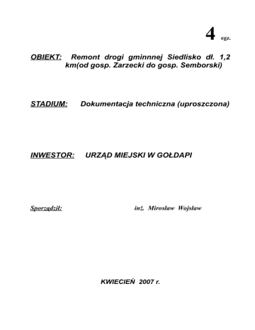 4 OBIEKT: Remont drogi gminnnej Siedlisko dł. 1,2 km(od gosp. Zarzecki do gosp. Semborski) STADIUM: INWESTOR: Sporządził: egz. Dokumentacja techniczna (uproszczona) URZĄD MIEJSKI W GOŁDAPI inż. Mirosław Wojsław KWIECIEŃ 2007 r. 2 ZAWARTOŚĆ OPRACOWANIA: I. Część opisowa 1. Opis techniczny drogi 2. Przedmiar robót 3. Kosztorys ofertowy (ślepy) II. Część rysunkowa 1. Mapa sytuacyjna drogi w skali 1:5000 2. Przekrój normalny drogi w skali 1:20 3. Przekroje przepustu typu PRAGMA 630 mm w skali 1:100 3 OPIS TECHNICZNY do projektu remontu drogi gminnnej Siedlisko dł. 1,2 km (od gosp. Pan Zarzecki do gosp.Pan Semborski) 1. MATERIAŁY WYJŚCIOWE DO PROJEKTOWANIA - Zlecenie inwestora, - Rozporządzenie Ministra Transportu i Gospodarki Morskiej z dnia 2 marca 1999 r. w sprawie warunków technicznych, jakim powinny odpowiadać drogi publiczne i ich usytuowanie ( Dz. Ustaw Nr 43 z dnia 14 maja 1999 r. poz. 430), - Wytyczne projektowania dróg VI i VII klasy technicznej-WPD-3 - Katalog Powtarzalnych Elementów Drogowych - KPED, - Wizja lokalna oraz pomiary własne w terenie. 2. OPIS STANU ISTNIEJĄCEGO Droga gminna Siedlisko-kolonia Siedlisko (od gospodarstwa Pana Zarzeckiego do gospodarstwa Pana Semborskiego) jest w złym stanie technicznym. Nawierzchnia gruntowa drogi i brak odwodnienia w postaci rowów i przepustów pod koroną drogi powoduje, że droga w okresie wiosennym jest miejscami nieprzejezdna. 3. STAN PROJEKTOWANY 3.1. PRZEBIEG TRASY Początek opracowania drogi gminnej tj. dalszy ciąg istniejącej drogi (od gospodarstwa Pana Zarzeckiego do gospodarstwa Pana Samborskiego Początek przyjęto w km roboczym 0+000a koniec drogi przyjęto w km roboczym 1+200. Długość drogi do remontu 1,2 km 4 3.2. NIWELETA DROGI Niwelete drogi zaprojektowano z dostosowaniem do przebiegu niwelety nawierzchni istniejącej. Niewielkie korekty niwelety w ograniczonym zakresie wynikają z występowania lokalnych nierówności podłużnych i konieczności zminimalizowania podjazdu pod niewielkie wniesienia. 3.3. PRZEKRÓJ NORMALNY DROGI Przekrój poprzeczny rozpatrywanego odcinka drogi przedstawia się następująco: • szerokość drogi 5,00 m • spadek poprzeczny jezdni i=3%, • pochylenie skarp nasypów i wykopów 1:1 • głębokość rowów przydrożnych 0,70 m poniżej krawędzi korony drogi 3.4. KONSTRUKCJA NAWIERZCHNI JEZDNI Zaprojektowano nawierzchnie żwirową szerokości 5,0 m • nawierzchnia żwirowa górna grub. 8 cm • nawierzchnia żwirowa dolna grub. 10 cm • warstwa odsączająca z piasku grub. 20 cm • grunt rodzimy lub nasypowy grupy G1 3.5. ODWODNIENIE Odwodnienie korpusu drogowego przewiduje się powierzchniowo poprzez nadanie projektowanych spadków nawierzchni, poboczom drogi do rowów przydrożnych. Odprowadzenie wody opadowej z rowów przydrożnych do istniejących naturalnych zbiorników retencyjnych lub wypuszczenie w teren po naturalnej jego konfiguracji. Grunty uzyskane z wykonania rowów częściowo nadają się do ponownego wbudowania w nasyp (poszerzenie drogi). Pozostały grunt należy odwieść na miejsce wskazane przez inwestora. W celu poprawy odwodnienia zaprojektowano przepusty pod koroną drogi 5 - km 0+400 - przepust PVC PRAGMA ∅ 630 mm – 9,0 m - km 0+760 - przepust PVC PRAGMA ∅ 630 mm – 9,0 m - km 1+010 - przepust PVC PRAGMA ∅ 630 mm – 9,0 m 3.6. SKRZYŻOWANIA I ZJAZDY Zaprojektowano 10 szt zjazdów gospodarczych z rur PRAGMA o średnicy 40 cm o długości po 6,0 m każdy ze zjazdów. Dokładna lokalizacja zjazdów zostanie uzgodniona z właścicielami przyległych gruntów do drogi w trakcie wykonywania robót Opracował: