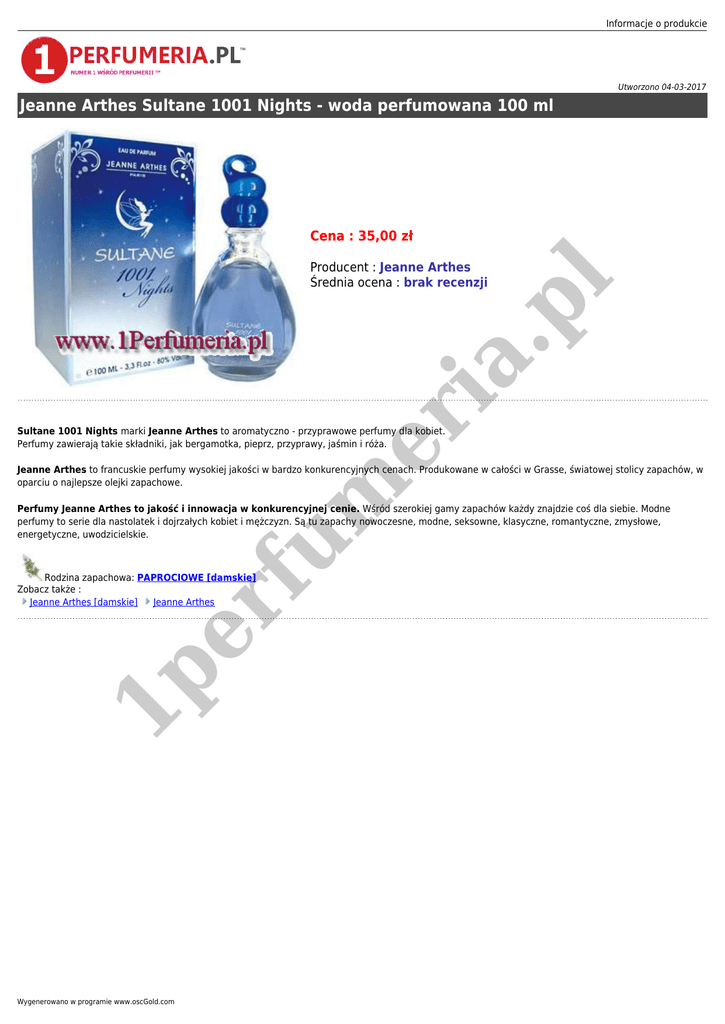 Informacje o produkcie Utworzono 04-03-2017 Jeanne Arthes Sultane 1001 Nights - woda perfumowana 100 ml Cena : 35,00 zł er ia .p l Producent : Jeanne Arthes Średnia ocena : brak recenzji Sultane 1001 Nights marki Jeanne Arthes to aromatyczno - przyprawowe perfumy dla kobiet. Perfumy zawierają takie składniki, jak bergamotka, pieprz, przyprawy, jaśmin i róża. m Jeanne Arthes to francuskie perfumy wysokiej jakości w bardzo konkurencyjnych cenach. Produkowane w całości w Grasse, światowej stolicy zapachów, w oparciu o najlepsze olejki zapachowe. er fu Perfumy Jeanne Arthes to jakość i innowacja w konkurencyjnej cenie. Wśród szerokiej gamy zapachów każdy znajdzie coś dla siebie. Modne perfumy to serie dla nastolatek i dojrzałych kobiet i mężczyzn. Są tu zapachy nowoczesne, modne, seksowne, klasyczne, romantyczne, zmysłowe, energetyczne, uwodzicielskie. 1p Rodzina zapachowa: PAPROCIOWE [damskie] Zobacz także : Jeanne Arthes [damskie] Jeanne Arthes Wygenerowano w programie www.oscGold.com