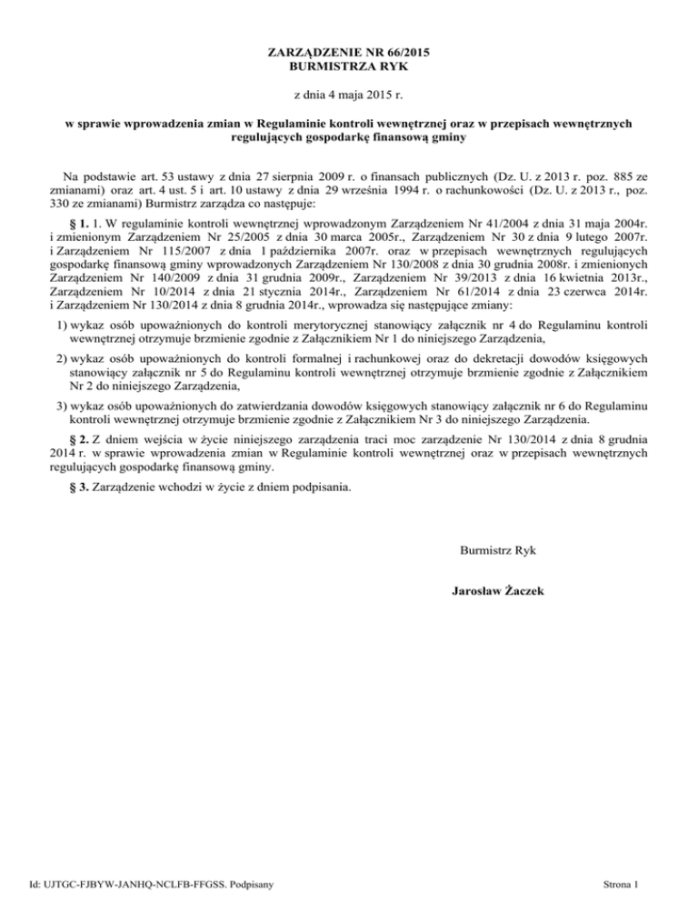 ZARZĄDZENIE NR 66/2015 BURMISTRZA RYK z dnia 4 maja 2015 r. w sprawie wprowadzenia zmian w Regulaminie kontroli wewnętrznej oraz w przepisach wewnętrznych regulujących gospodarkę finansową gminy Na podstawie art. 53 ustawy z dnia 27 sierpnia 2009 r. o finansach publicznych (Dz. U. z 2013 r. poz. 885 ze zmianami) oraz art. 4 ust. 5 i art. 10 ustawy z dnia 29 września 1994 r. o rachunkowości (Dz. U. z 2013 r., poz. 330 ze zmianami) Burmistrz zarządza co następuje: § 1. 1. W regulaminie kontroli wewnętrznej wprowadzonym Zarządzeniem Nr 41/2004 z dnia 31 maja 2004r. i zmienionym Zarządzeniem Nr 25/2005 z dnia 30 marca 2005r., Zarządzeniem Nr 30 z dnia 9 lutego 2007r. i Zarządzeniem Nr 115/2007 z dnia 1 października 2007r. oraz w przepisach wewnętrznych regulujących gospodarkę finansową gminy wprowadzonych Zarządzeniem Nr 130/2008 z dnia 30 grudnia 2008r. i zmienionych Zarządzeniem Nr 140/2009 z dnia 31 grudnia 2009r., Zarządzeniem Nr 39/2013 z dnia 16 kwietnia 2013r., Zarządzeniem Nr 10/2014 z dnia 21 stycznia 2014r., Zarządzeniem Nr 61/2014 z dnia 23 czerwca 2014r. i Zarządzeniem Nr 130/2014 z dnia 8 grudnia 2014r., wprowadza się następujące zmiany: 1) wykaz osób upoważnionych do kontroli merytorycznej stanowiący załącznik nr 4 do Regulaminu kontroli wewnętrznej otrzymuje brzmienie zgodnie z Załącznikiem Nr 1 do niniejszego Zarządzenia, 2) wykaz osób upoważnionych do kontroli formalnej i rachunkowej oraz do dekretacji dowodów księgowych stanowiący załącznik nr 5 do Regulaminu kontroli wewnętrznej otrzymuje brzmienie zgodnie z Załącznikiem Nr 2 do niniejszego Zarządzenia, 3) wykaz osób upoważnionych do zatwierdzania dowodów księgowych stanowiący załącznik nr 6 do Regulaminu kontroli wewnętrznej otrzymuje brzmienie zgodnie z Załącznikiem Nr 3 do niniejszego Zarządzenia. § 2. Z dniem wejścia w życie niniejszego zarządzenia traci moc zarządzenie Nr 130/2014 z dnia 8 grudnia 2014 r. w sprawie wprowadzenia zmian w Regulaminie kontroli wewnętrznej oraz w przepisach wewnętrznych regulujących gospodarkę finansową gminy. § 3. Zarządzenie wchodzi w życie z dniem podpisania. Burmistrz Ryk Jarosław Żaczek Id: UJTGC-FJBYW-JANHQ-NCLFB-FFGSS. Podpisany Strona 1 Załącznik Nr 1 do Zarządzenia Nr 66/2015 Burmistrza Ryk z dnia 4 maja 2015r. Wykaz osób upoważnionych do kontroli merytorycznej Imię i nazwisko Stanowisko służbowe upoważnionego Barbara Węgier Z-ca Skarbnika Gminy Lucjan Cieślak Kierownik Wydziału Organizacji i Spraw Społecznych Agnieszka Woźniak Kierownik Wydziału Inwestycji i Remontów Stanisław Ciesielski Kierownik Wydziału Gospodarki Komunalnej, Nieruchomości i Zagospodarowania Przestrzennego Iwona Krupińska Kierownik Urzędu Stanu Cywilnego w Rykach Wzór podpisu upoważnionego ……………………… Kierownik jednostki Id: UJTGC-FJBYW-JANHQ-NCLFB-FFGSS. Podpisany Strona 2 Załącznik Nr 2 do Zarządzenia Nr 66/2015 Burmistrza Ryk z dnia 4 maja 2015r. Wykaz osób upoważnionych do kontroli formalnej i rachunkowej oraz do dekretacji dowodów księgowych Imię i nazwisko Stanowisko służbowe upoważnionego Zofia Piotrowska Inspektor Wydziału Budżetu Podatków i Opłat Edyta Sawicka Inspektor Wydziału Budżetu Podatków i Opłat Ewa Lipiec ( * ) Inspektor Wydziału Budżetu Podatków i Opłat Wzór podpisu upoważnionego ( * ) - upoważnienie dotyczy dokumentacji płacowej ……………………… Kierownik jednostki Id: UJTGC-FJBYW-JANHQ-NCLFB-FFGSS. Podpisany Strona 3 Załącznik Nr 3 do Zarządzenia Nr 66/2015 Burmistrza Ryk z dnia 4 maja 2015r. Wykaz osób upoważnionych do zatwierdzania dowodów księgowych Imię i nazwisko Jarosław Żaczek Z upoważnienia Burmistrza Stanowisko służbowe upoważnionego Wzór podpisu upoważnionego Burmistrz Magdalena Woźniak Dariusz Sosnowski Z-ca Burmistrza Skarbnik Gminy Barbara Węgier Z-ca Skarbnika Gminy Zofia Piotrowska Inspektor Wydziału Budżetu Podatków i Opłat Z upoważnienia Skarbnika ……………………… Kierownik jednostki Id: UJTGC-FJBYW-JANHQ-NCLFB-FFGSS. Podpisany Strona 4