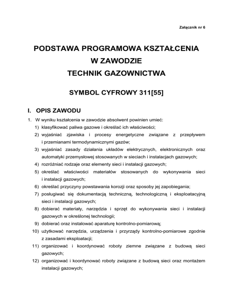 Załącznik nr 6 PODSTAWA PROGRAMOWA KSZTAŁCENIA W ZAWODZIE TECHNIK GAZOWNICTWA SYMBOL CYFROWY 311[55] I. OPIS ZAWODU 1. W wyniku kształcenia w zawodzie absolwent powinien umieć: 1) klasyfikować paliwa gazowe i określać ich właściwości; 2) wyjaśniać zjawiska i procesy energetyczne związane z przepływem i przemianami termodynamicznymi gazów; 3) wyjaśniać zasady działania układów elektrycznych, elektronicznych oraz automatyki przemysłowej stosowanych w sieciach i instalacjach gazowych; 4) rozróŜniać rodzaje oraz elementy sieci i instalacji gazowych; 5) określać właściwości materiałów stosowanych do wykonywania sieci i instalacji gazowych; 6) określać przyczyny powstawania korozji oraz sposoby jej zapobiegania; 7) posługiwać się dokumentacją techniczną, technologiczną i eksploatacyjną sieci i instalacji gazowych; 8) dobierać materiały, narzędzia i sprzęt do wykonywania sieci i instalacji gazowych w określonej technologii; 9) dobierać oraz instalować aparaturę kontrolno-pomiarową; 10) uŜytkować narzędzia, urządzenia i przyrządy kontrolno-pomiarowe zgodnie z zasadami eksploatacji; 11) organizować i koordynować roboty ziemne związane z budową sieci gazowych; 12) organizować i koordynować roboty związane z budową sieci oraz montaŜem instalacji gazowych; 13) posługiwać się instrukcjami obsługi maszyn i urządzeń gazowych; 14) instalować urządzenia gazowe oraz wykonywać prace związane z ich regulacją, naprawą i konserwacją; 15) dokumentować przebieg procesów budowy sieci i instalacji gazowych; 16) kontrolować jakość wykonywanych robót sieciowych i instalacyjnych; 17) wykonywać próby szczelności sieci i instalacji gazowych; 18) przygotowywać sieci i instalacje gazowe do odbioru technicznego; 19) wykonywać przedmiary oraz obmiary robót sieciowych i instalacyjnych; 20) wykonywać pomiary oraz szkice inwentaryzacyjne sieci i instalacji gazowych; 21) stosować zasady projektowania sieci i instalacji gazowych; 22) przestrzegać norm, warunków technicznych wykonania i odbioru robót oraz przepisów prawa budowlanego i energetycznego dotyczących sieci i instalacji gazowych; 23) przestrzegać zasad eksploatacji sieci, urządzeń i instalacji gazowych; 24) przeprowadzać kontrolę stanu technicznego sieci i instalacji gazowych; 25) lokalizować i usuwać awarie w sieciach i instalacjach gazowych; 26) planować prace związane z modernizacją sieci i instalacji gazowych; 27) stosować techniki komputerowe w realizacji zadań zawodowych; 28) posługiwać się językiem obcym w zakresie niezbędnym do wykonywania zadań zawodowych; 29) stosować przepisy prawa dotyczące wykonywanych zadań zawodowych; 30) przestrzegać przepisów i zasad bezpieczeństwa i higieny pracy, przepisów ochrony przeciwpoŜarowej oraz ochrony środowiska; 31) organizować stanowisko pracy zgodnie z wymaganiami ergonomii; 32) kierować zespołem pracowników; 33) stosować przepisy Kodeksu pracy dotyczące praw i obowiązków pracownika i pracodawcy; 34) udzielać pierwszej pomocy poszkodowanym w wypadkach przy pracy; 35) korzystać z róŜnych źródeł informacji oraz z doradztwa specjalistycznego; 36) prowadzić działalność gospodarczą. Kształtowanie postaw przedsiębiorczych oraz przygotowanie do wejścia na rynek pracy powinno przebiegać zarówno w trakcie kształcenia zawodowego, jak i podczas realizacji zajęć edukacyjnych „Podstawy przedsiębiorczości”. 2 2. Absolwent szkoły kształcącej w zawodzie technik gazownictwa powinien być przygotowany do wykonywania następujących zadań zawodowych: 1) organizowanie oraz wykonywanie robót związanych z budową sieci i montaŜem instalacji gazowych; 2) przygotowywanie sieci i instalacji gazowych do odbioru technicznego; 3) instalowanie, uruchamianie i kontrola stanu technicznego urządzeń gazowych; 4) obsługa sieci, urządzeń i instalacji gazowych; 5) wykonywanie konserwacji, napraw oraz modernizacji sieci, urządzeń i instalacji gazowych; 6) lokalizowanie oraz usuwanie awarii sieci i instalacji gazowych. 3. Zawód technik gazownictwa jest zawodem szerokoprofilowym, umoŜliwiającym specjalizację pod specjalistyczne, koniec biorąc okresu pod kształcenia. uwagę Szkoła potrzeby określa regionalnego umiejętności rynku pracy i zainteresowania uczniów. Tematyka specjalizacji moŜe dotyczyć: 1) transportu gazu; 2) magazynowania gazu; 3) instalacji skroplonego gazu ziemnego. II. BLOKI PROGRAMOWE Zakres umiejętności i treści kształcenia, wynikający z opisu zawodu, zawierają następujące bloki programowe: 1) podstawy gazownictwa; 2) sieci gazowe; 3) instalacje gazowe; 4) podstawy działalności zawodowej. BLOK: PODSTAWY GAZOWNICTWA 1. Cele kształcenia Uczeń (słuchacz) w wyniku kształcenia powinien umieć: 1) rozróŜniać rodzaje paliw gazowych i określać ich skład chemiczny; 2) określać fizykochemiczne właściwości paliw gazowych; 3 3) określać moŜliwości wykorzystywania paliw gazowych; 4) charakteryzować sposoby pozyskiwania paliw gazowych; 5) określać sposoby oraz warunki wydobywania i magazynowania paliw gazowych; 6) charakteryzować procesy przeróbki, uzdatniania i rozdzielania paliw gazowych; 7) charakteryzować sposoby nawaniania gazu ziemnego i płynnego; 8) charakteryzować metody wykonywania pomiarów podstawowych parametrów paliw gazowych; 9) charakteryzować procesy zachodzące podczas spalania paliw gazowych; 10) charakteryzować urządzenia energetyczne stosowane podczas montaŜu oraz eksploatacji sieci i instalacji gazowych; 11) wyjaśniać podstawowe prawa termodynamiki; 12) charakteryzować przemiany fazowe gazów; 13) wykonywać obliczenia podstawowych parametrów charakteryzujących przepływ cieczy i gazów; 14) uŜytkować urządzenia i instalacje elektryczne; 15) wyjaśniać zasady działania i zastosowanie podstawowych układów elektrycznych oraz automatyki i sterowania; 16) wyjaśniać budowę i zasadę działania napędów 