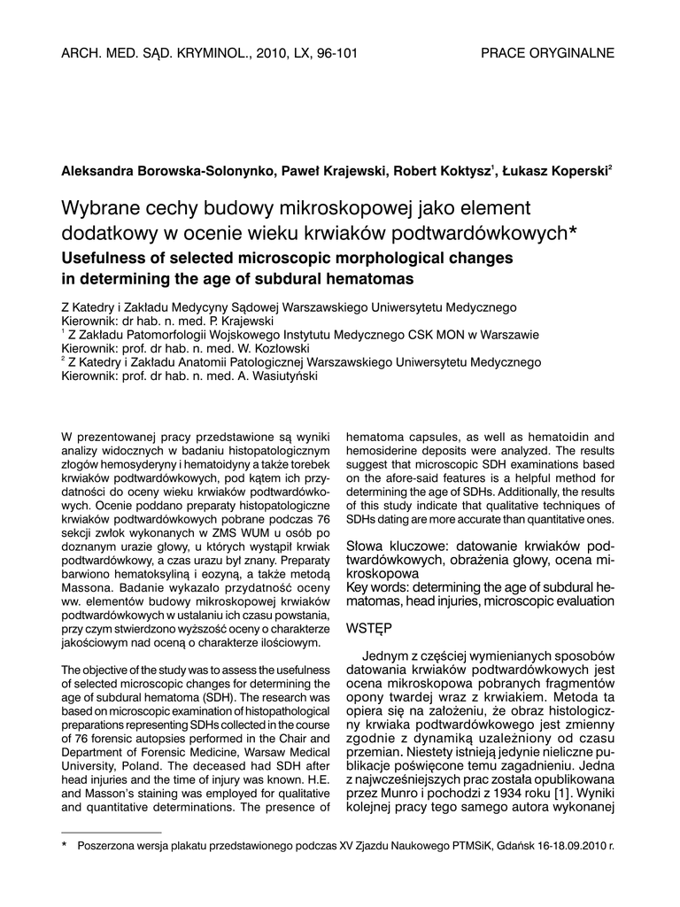 ARCH. MED. SĄD. KRYMINOL., 2010, LX, 96-101 PRACE ORYGINALNE Aleksandra Borowska-Solonynko, Paweł Krajewski, Robert Koktysz1, Łukasz Koperski2 Wybrane cechy budowy mikroskopowej jako element dodatkowy w ocenie wieku krwiaków podtwardówkowych* Usefulness of selected microscopic morphological changes in determining the age of subdural hematomas Z Katedry i Zakładu Medycyny Sądowej Warszawskiego Uniwersytetu Medycznego Kierownik: dr hab. n. med. P. Krajewski 1 Z Zakładu Patomorfologii Wojskowego Instytutu Medycznego CSK MON w Warszawie Kierownik: prof. dr hab. n. med. W. Kozłowski 2 Z Katedry i Zakładu Anatomii Patologicznej Warszawskiego Uniwersytetu Medycznego Kierownik: prof. dr hab. n. med. A. Wasiutyński W prezentowanej pracy przedstawione są wyniki analizy widocznych w badaniu histopatologicznym złogów hemosyderyny i hematoidyny a także torebek krwiaków podtwardówkowych, pod kątem ich przydatności do oceny wieku krwiaków podtwardówkowych. Ocenie poddano preparaty histopatologiczne krwiaków podtwardówkowych pobrane podczas 76 sekcji zwłok wykonanych w ZMS WUM u osób po doznanym urazie głowy, u których wystąpił krwiak podtwardówkowy, a czas urazu był znany. Preparaty barwiono hematoksyliną i eozyną, a także metodą Massona. Badanie wykazało przydatność oceny ww. elementów budowy mikroskopowej krwiaków podtwardówkowych w ustalaniu ich czasu powstania, przy czym stwierdzono wyższość oceny o charakterze jakościowym nad oceną o charakterze ilościowym. The objective of the study was to assess the usefulness of selected microscopic changes for determining the age of subdural hematoma (SDH). The research was based on microscopic examination of histopathological preparations representing SDHs collected in the course of 76 forensic autopsies performed in the Chair and Department of Forensic Medicine, Warsaw Medical University, Poland. The deceased had SDH after head injuries and the time of injury was known. H.E. and Masson’s staining was employed for qualitative and quantitative determinations. The presence of * hematoma capsules, as well as hematoidin and hemosiderine deposits were analyzed. The results suggest that microscopic SDH examinations based on the afore-said features is a helpful method for determining the age of SDHs. Additionally, the results of this study indicate that qualitative techniques of SDHs dating are more accurate than quantitative ones. Słowa kluczowe: datowanie krwiaków podtwardówkowych, obrażenia głowy, ocena mikroskopowa Key words: determining the age of subdural hematomas, head injuries, microscopic evaluation WSTęP Jednym z częściej wymienianych sposobów datowania krwiaków podtwardówkowych jest ocena mikroskopowa pobranych fragmentów opony twardej wraz z krwiakiem. Metoda ta opiera się na założeniu, że obraz histologiczny krwiaka podtwardówkowego jest zmienny zgodnie z dynamiką uzależniony od czasu przemian. Niestety istnieją jedynie nieliczne publikacje poświęcone temu zagadnieniu. Jedna z najwcześniejszych prac została opublikowana przez Munro i pochodzi z 1934 roku [1]. Wyniki kolejnej pracy tego samego autora wykonanej Poszerzona wersja plakatu przedstawionego podczas XV Zjazdu Naukowego PTMSiK, Gdańsk 16-18.09.2010 r. Nr 2-3 MIKROSKOPOWA OCENA KRWIAKóW PODTWARDóWKOWYCH wraz z Meritt [2] z 1956 roku zostały przedstawione w formie tabeli, która w niewielkim stopniu została zmodyfikowana przez Hardmana w 1979 roku [3], McCormick 1983 [4], Leestman 1988 [5]. Prace te są podstawą współczesnej histopatologicznej oceny wieku krwiaków podtwardówkowych. W praktyce, w wielu przypadkach kryteria podane przez ww. autorów są trudne do zastosowania bądź nie sprawdzają się w indywidualnych przypadkach, co sprawia wrażenie ogólnie niskiej przydatności tradycyjnych metod histopatologicznych w datowaniu krwiaków podtwardówkowych. W Katedrze i Zakładzie Medycyny Sądowej Warszawskiego Uniwersytetu Medycznego przeprowadzono badanie poświęcone ocenie przydatności tradycyjnych technik mikroskopowych przy określaniu wieku krwiaków podtwardówkowych. Prezentowana praca stanowi jedynie fragment tego badania i poświęcona jest kilku wybranym cechom budowy mikroskopowej krwiaków. 97 na. Przy użyciu mikroskopu świetlnego oceniano obecność złogów hemosyderyny i hematoidyny w preparacie (ryc. 1) a także obecność torebki zewnętrznej i wewnętrznej krwiaka (ryc. 2 i 3). Za torebkę uznane zostały wszystkie elementy tworzące warstwę oddzielającą krwiaka od opony twardej (w przypadku torebki zewnętrznej) oraz pokrywające krwiak od strony opony pajęczej (w przypadku torebki wewnętrznej) włączając w to zarówno elementy włókniste jak i komórkowe. Ryc. 2 i 3. Torebka zewnętrzna (zdjęcie po stronie lewej) i torebka wewnętrzna (zdjęcie po stronie prawej) krwiaka. Powiększenie 20x. Fig. 2 and 3. Capsula externa (left) and capsula interna (right) of a subdural hematoma. Magnification 20x. MATERIAŁ I METODY Ocenie poddano preparaty histopatologiczne krwiaków podtwardówkowych pobrane podczas 76 sekcji zwłok wykonanych w Zakładzie Medycyny Sądowej Warszawskiego Uniwersytetu w latach 2006-2007, u osób po doznanym urazie głowy, u których wystąpił krwiak podtwardówkowy, a czas urazu był znany. W 20 przypadkach wykonana była chirurgiczna ewakuacja krwiaka, przy czym w czterech z tych przypadków do badań histologicznych pobrano materiał ze strony przeciwnej od ewakuowanej. Preparaty barwiono hematoksyliną i eozyną, a także metodą MassoRyc. 1. Złogi hemosyderyny i hematoidyny na granicy krwiaka i opony twardej. Powiększenie 60x. Fig.1. Hematoidin and hemosiderin deposits between the dura mater and hematoma. Magnification 60x. W preparatach barwionych metodą Massona dokonywano pomiaru grubości torebek krwiaka za pomocą mikroskopu Nikon Eclipse E200 sprzężonego z komputerem i kamerą Pixelink (ryc. 4). Ocenie poddawano trzy pola widzenia uwzględniając